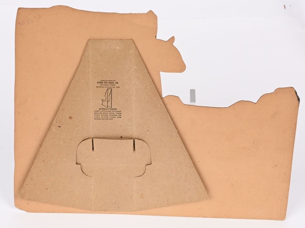 Printed in full color litho on heavy board by BREUSER & KESSLER, PHIL. and so stamped at left front corner. Easel back is stamped Stand Pat. Easel Co. Pat. October 25, 1904. Measures 9x10 ". Great color, no in painting or repairs, slight crease on top corner. Small chip at bottom right. Die cut squirrel theme.