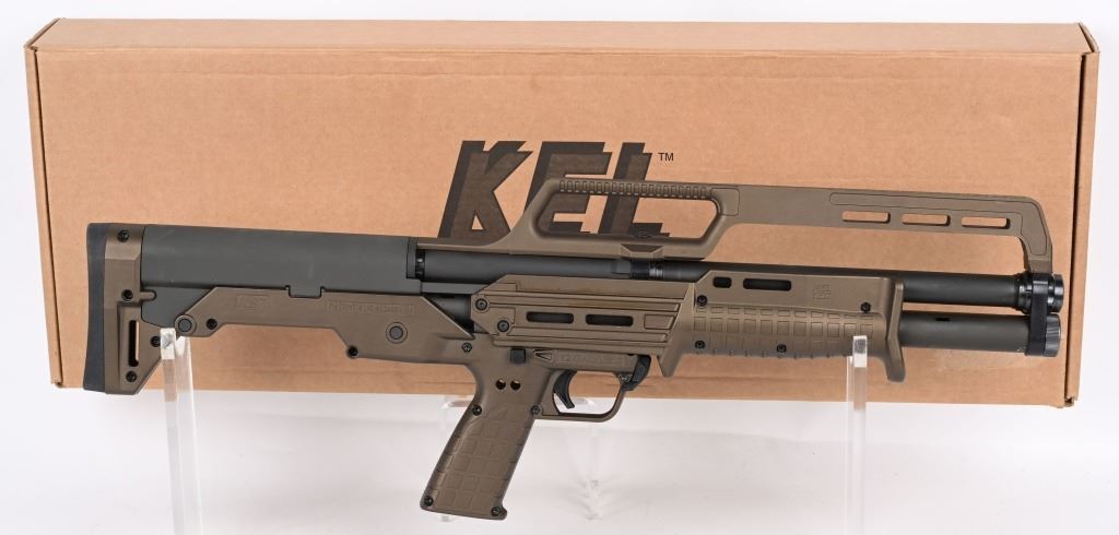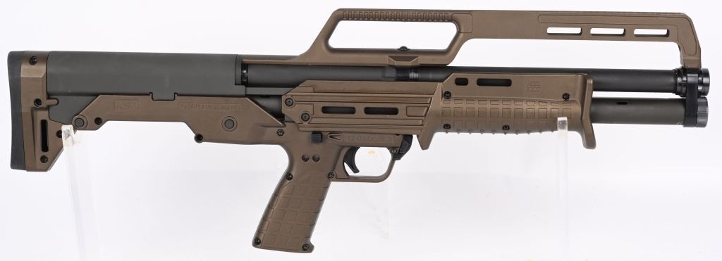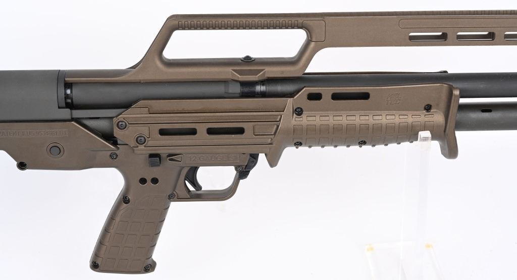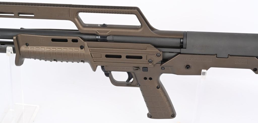 Midnight bronze KS& pump 12 ga. The KS7 is a bull pup 12-gauge shotgun and is something of a single mag-tube version of the KSG. Specs: Caliber: 12 ga Length: 26.1” Barrel Length: 18.5” Weight: 5.9lb (unloaded) Length of Pull: 13” Sights: Green fiber optic front bead Capacity: 6+1 w/3” shells (or 7+1 with 2¾ shells As new in box. MODERN