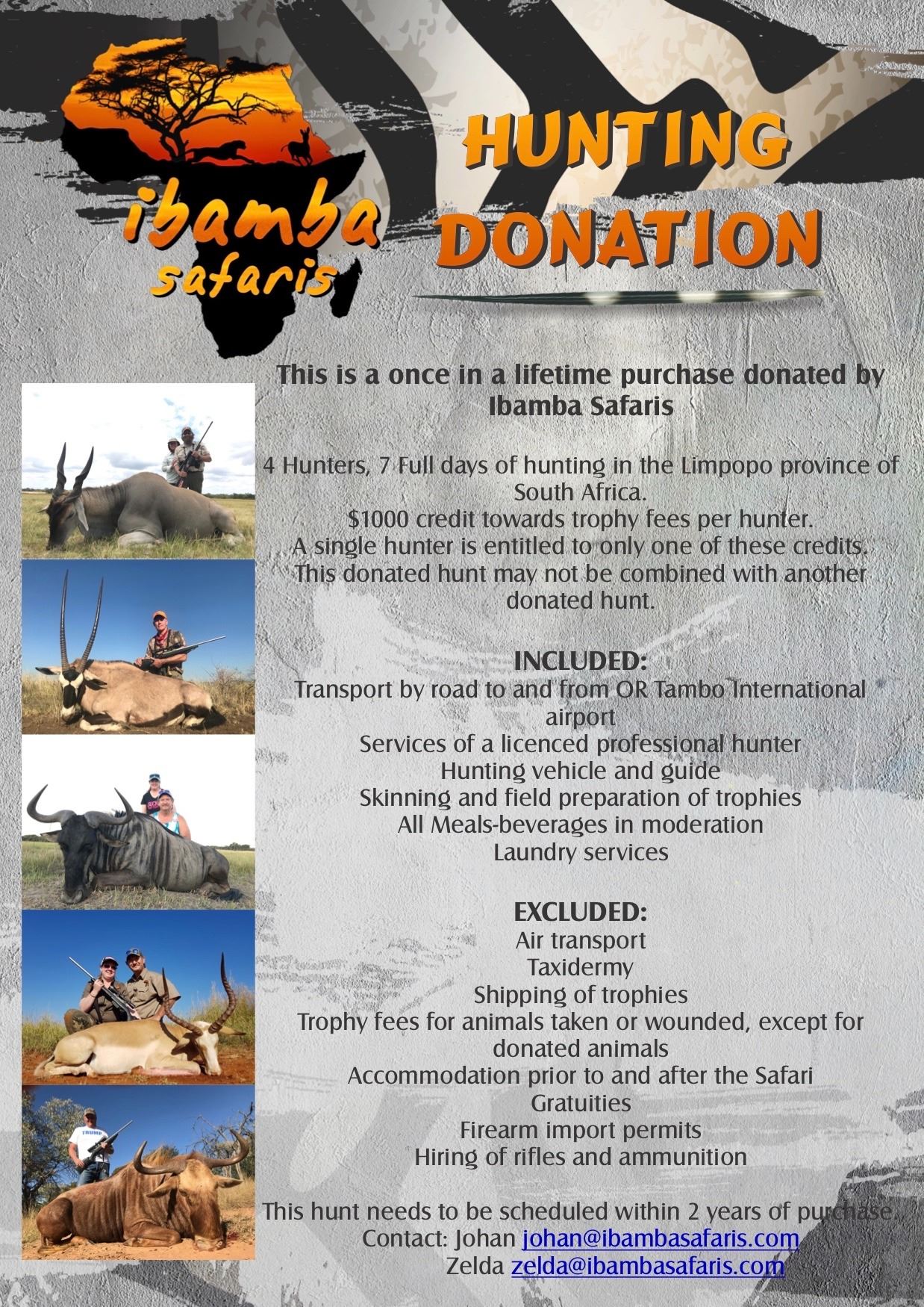 4 Hunters; 7 day hunt in Limpop province of South Africa. Includes $1000 hunt credit towards trophy fees per hunter and $500 credit toward any photo Safari (shared between 2 hunters); airport transport/PH; meals & beverages in moderation; field skinning/prep; laundry.