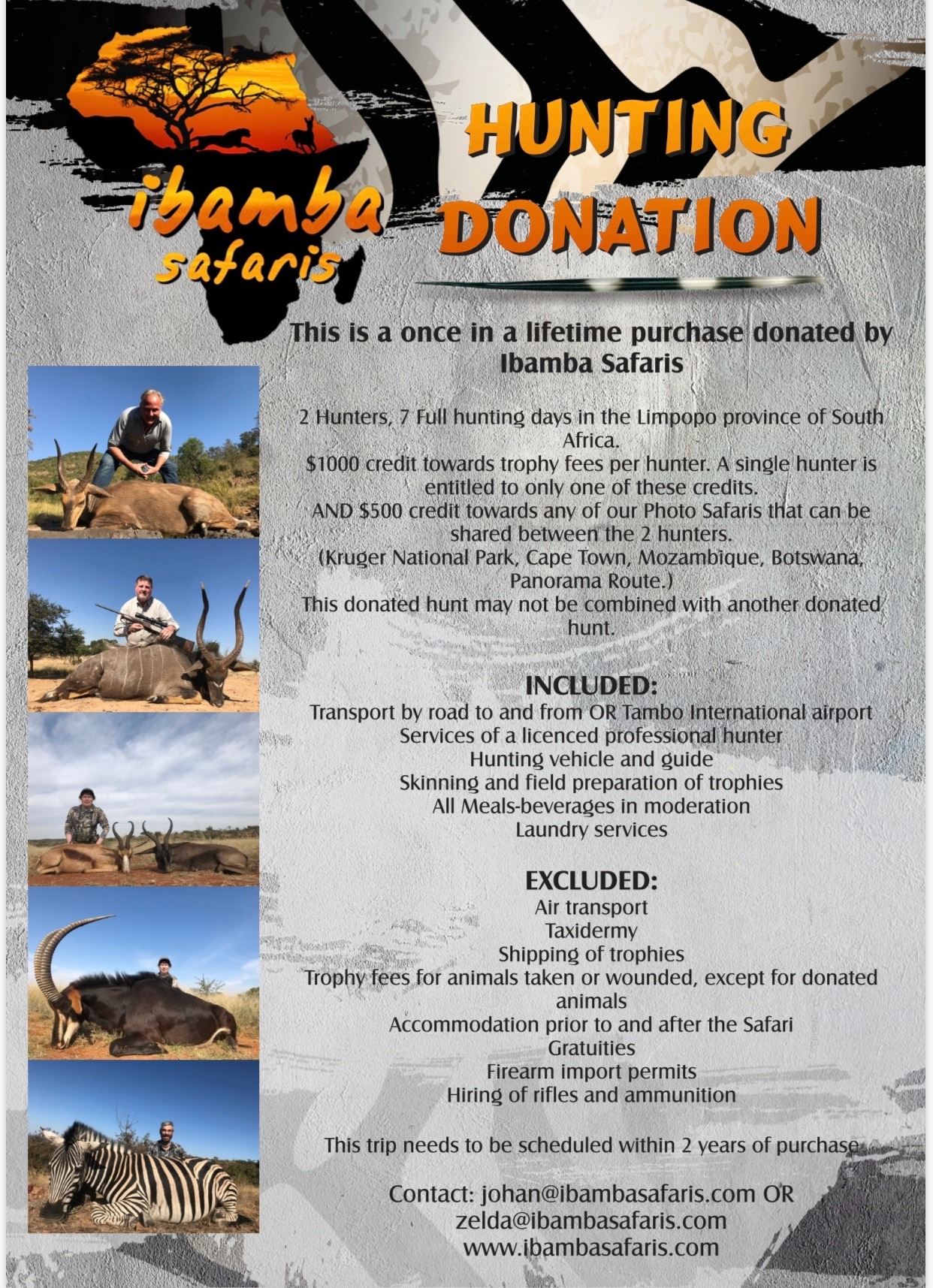 2 hunters; 7 day hunt in Limpopo province of South Africa. Includes $1000 hunt credit towards trophy fees per hunter and $500 credit towards any photo Safari(shared between 2 hunters); airport transport/PH; meals & beverages in moderation; field skinning/prep; laundry.