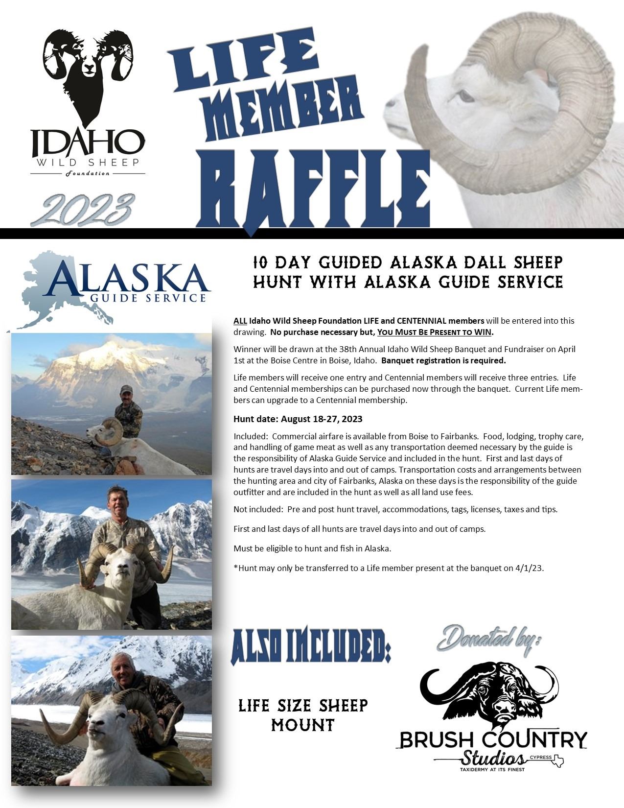 The winner will be supporting the Idaho WSF mission 'To Put and Keep Wild Sheep on the Mountain' and, he/she will have three tickets entered into every Life Member Only Raffle which Idaho WSF conducts. Tonight's drawing is for an Alaska Dall sheep hunt with Alaska Guide Services!