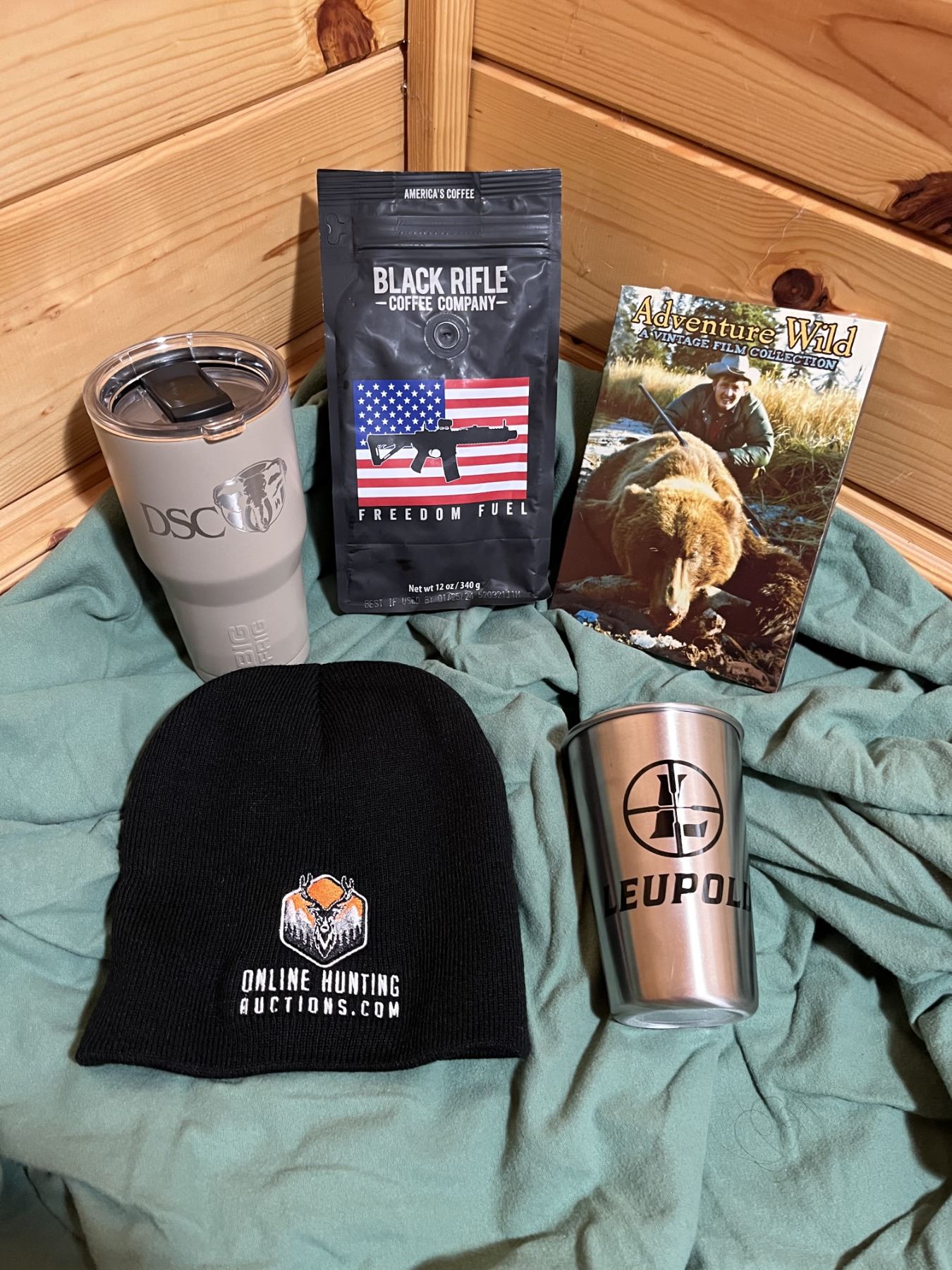 Big Frig 20oz Tumbler, Black Rifle "Freedom Fuel" Coffee, Adventure Wild DVD, Leupold Cup, & Online Cap