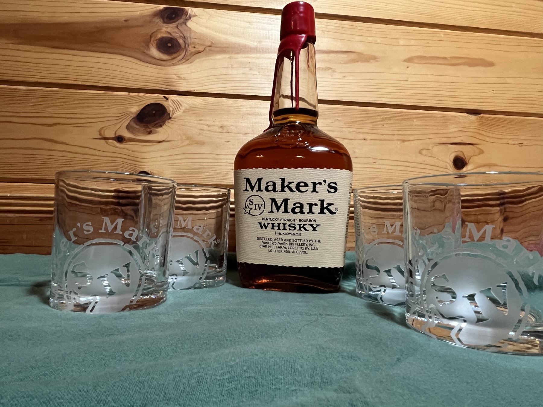 Bottle of Maker's Mark Bourbon Whisky & 4 - Maker's Mark Whiskey Glasses