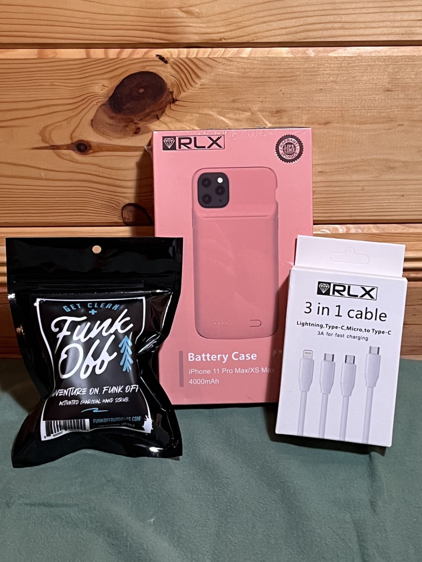 RLX Iphone 11 Pro Max/XS Max Battery Case, Charging Cables, & One "Funk Off" Hand Scrub