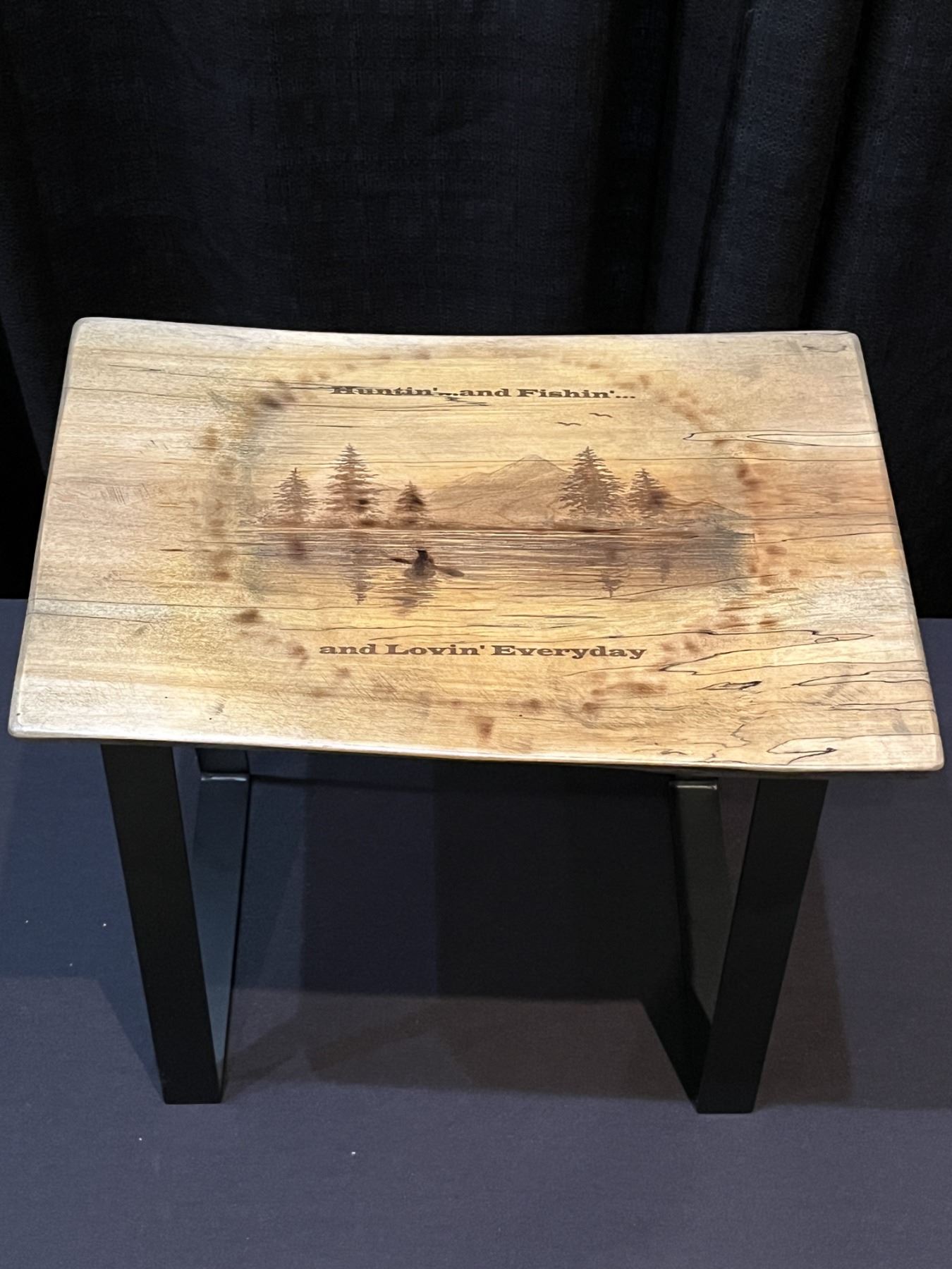 Handmade Spalted Maple Side Table w/ "Huntin', Fishin', & Lovin' Everyday Outdoor Scene"