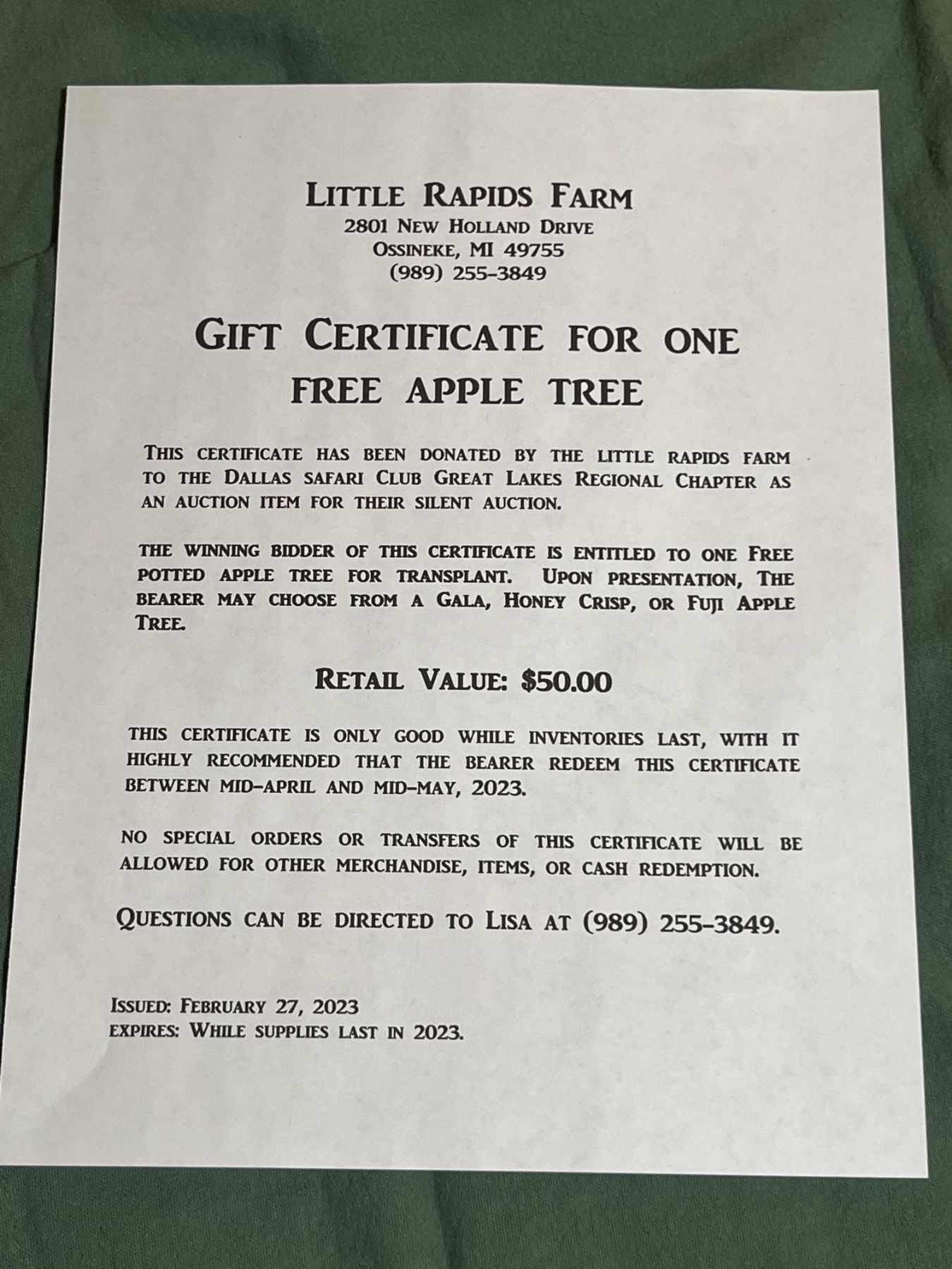 Lot 28 Little Rapids Farm Certificate for One Apple Tree of Choice (Gala, Honey Crisp, or Fuji) in Ossineke