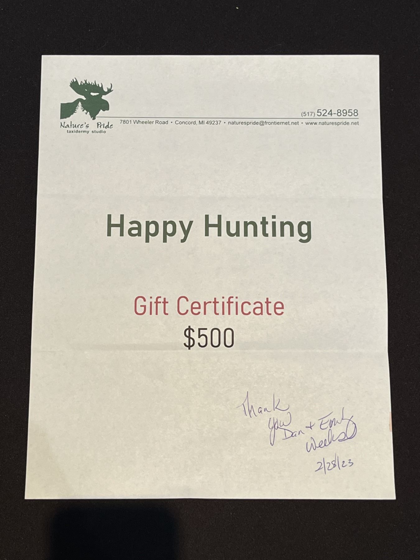 $500 Gift Certificate for Nature's Pride Taxidermy - Concord, MI