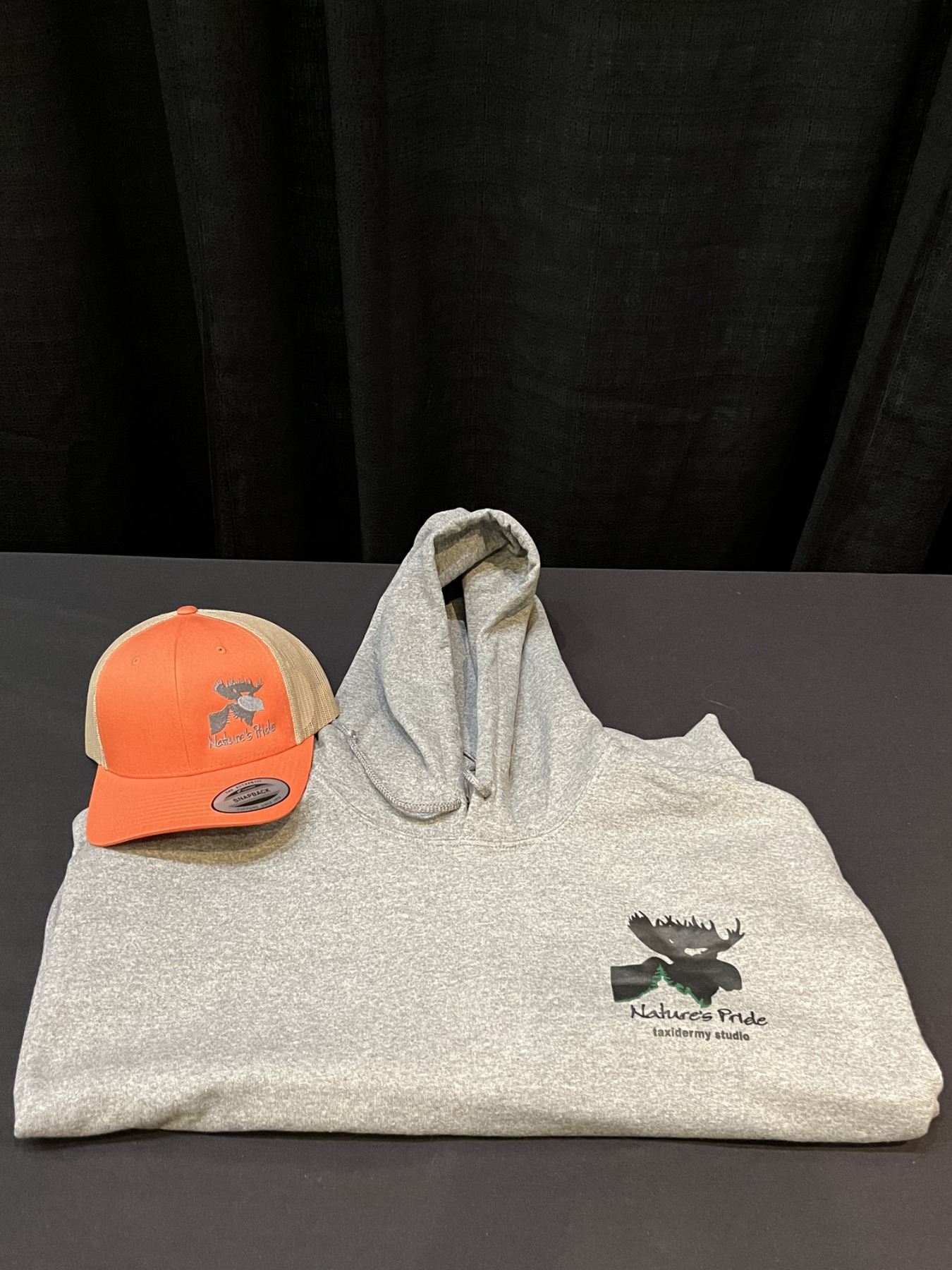 Extra Heavy, Grey Hooded "Nature's Pride Taxidermy" Sweatshirt (XL) & Orange/Tan "NPT" Ball Cap