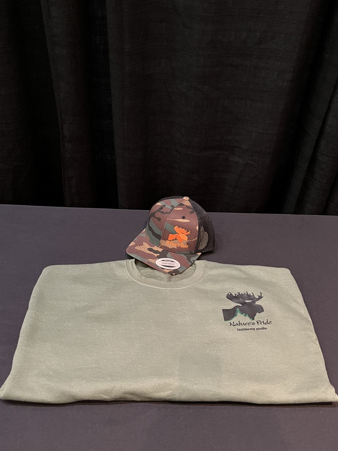Green Crew Neck "Nature's Pride Taxidermy" Sweatshirt (XL) & Camo "Nature's Pride Taxidermy" Ball Cap