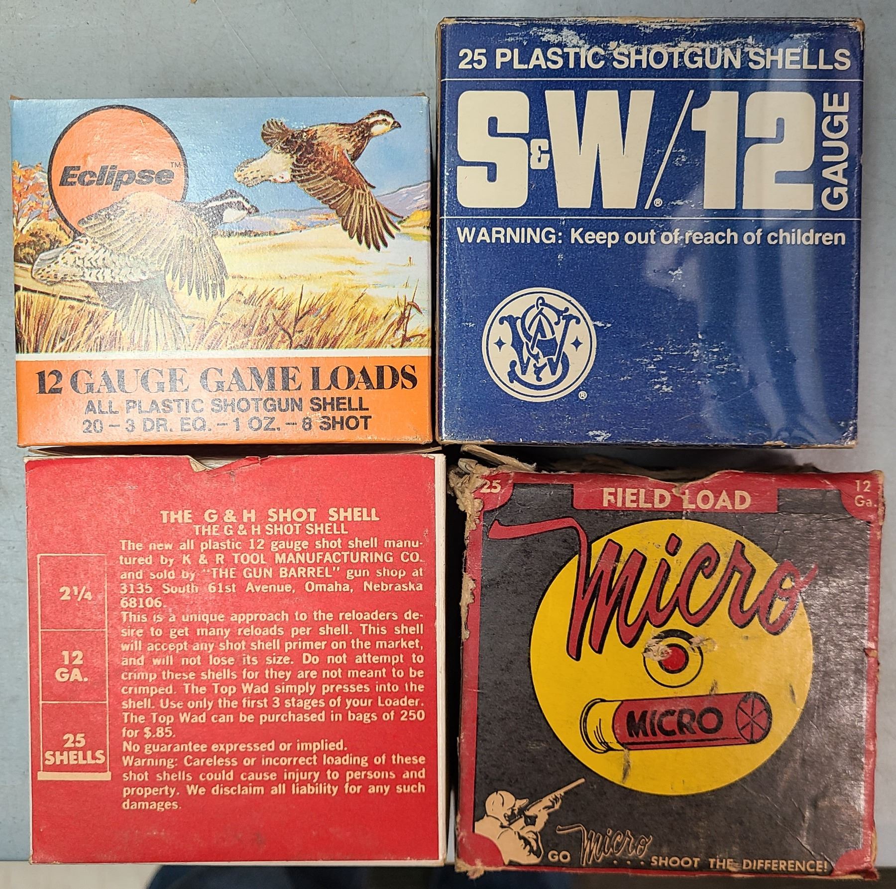 AMMO: 4 VINTAGE COLLECTOR 12 GA SHOTGUN SHELL BOXES - S&W, MICRO, G&H, ECLIPSE