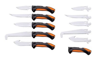 3.5" Caper Blade, 4" Skinning Blade w/Gut Hook, 4" General Purpose Blade, 5" Boning Blade, and 6" Bone Saw
