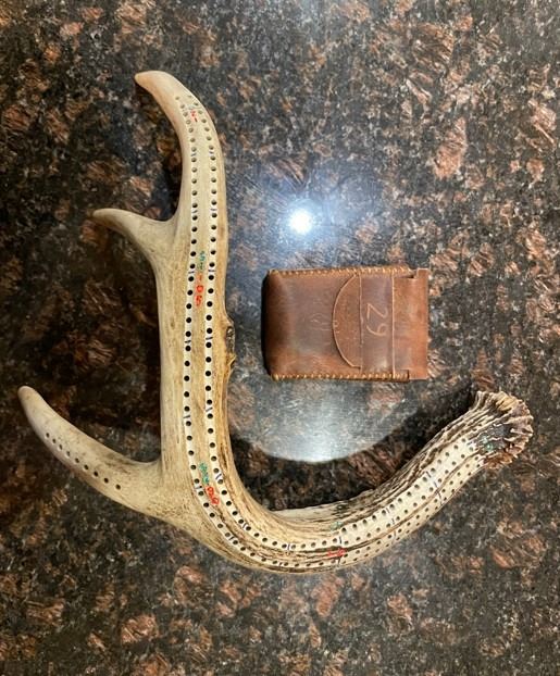 Board made from White-tail Shed. Comes with cards, pegs, and instructions. Also comes with leather card case.