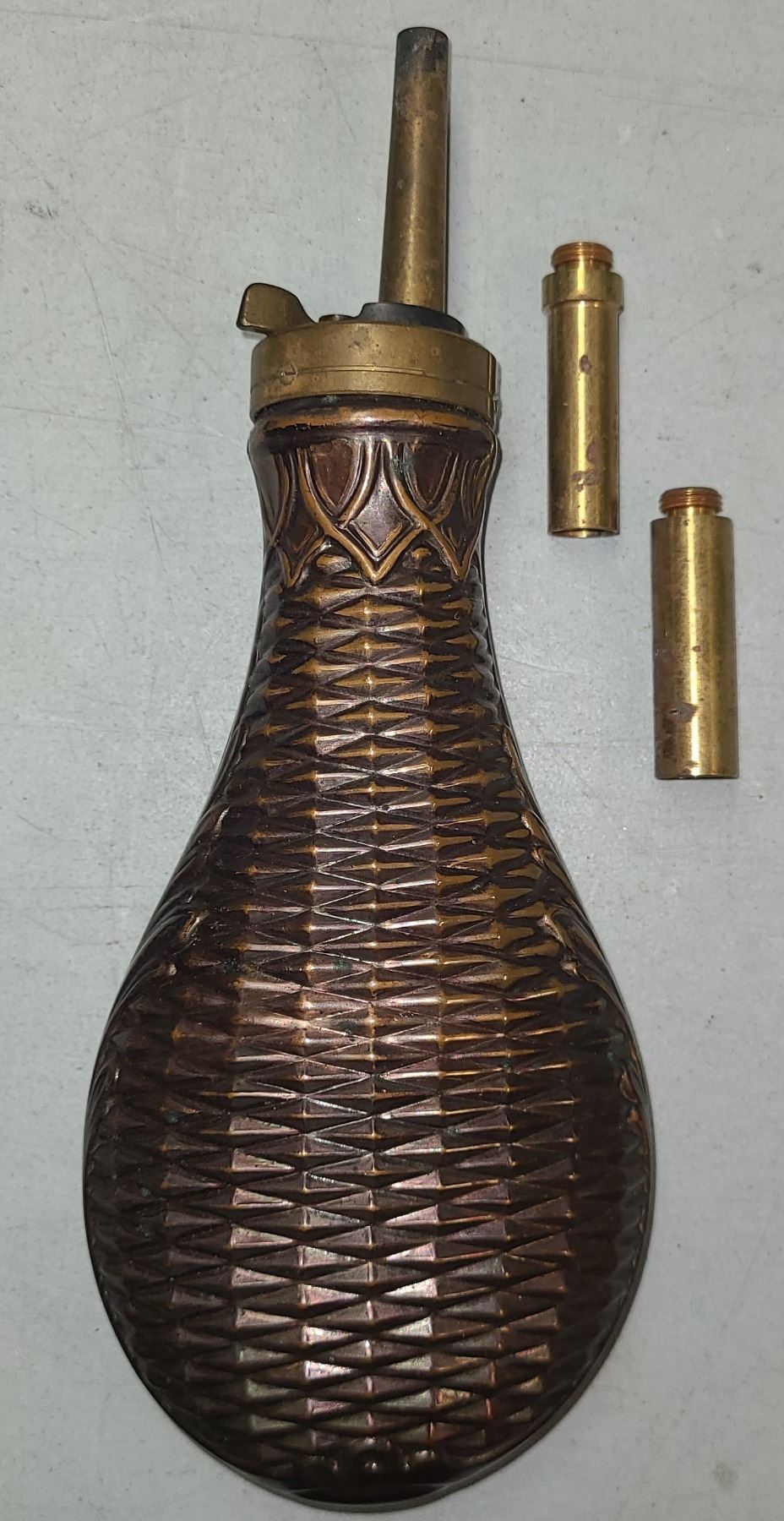 Lot 412 VINTAGE METAL POWDER FLASK AS SHOWN..