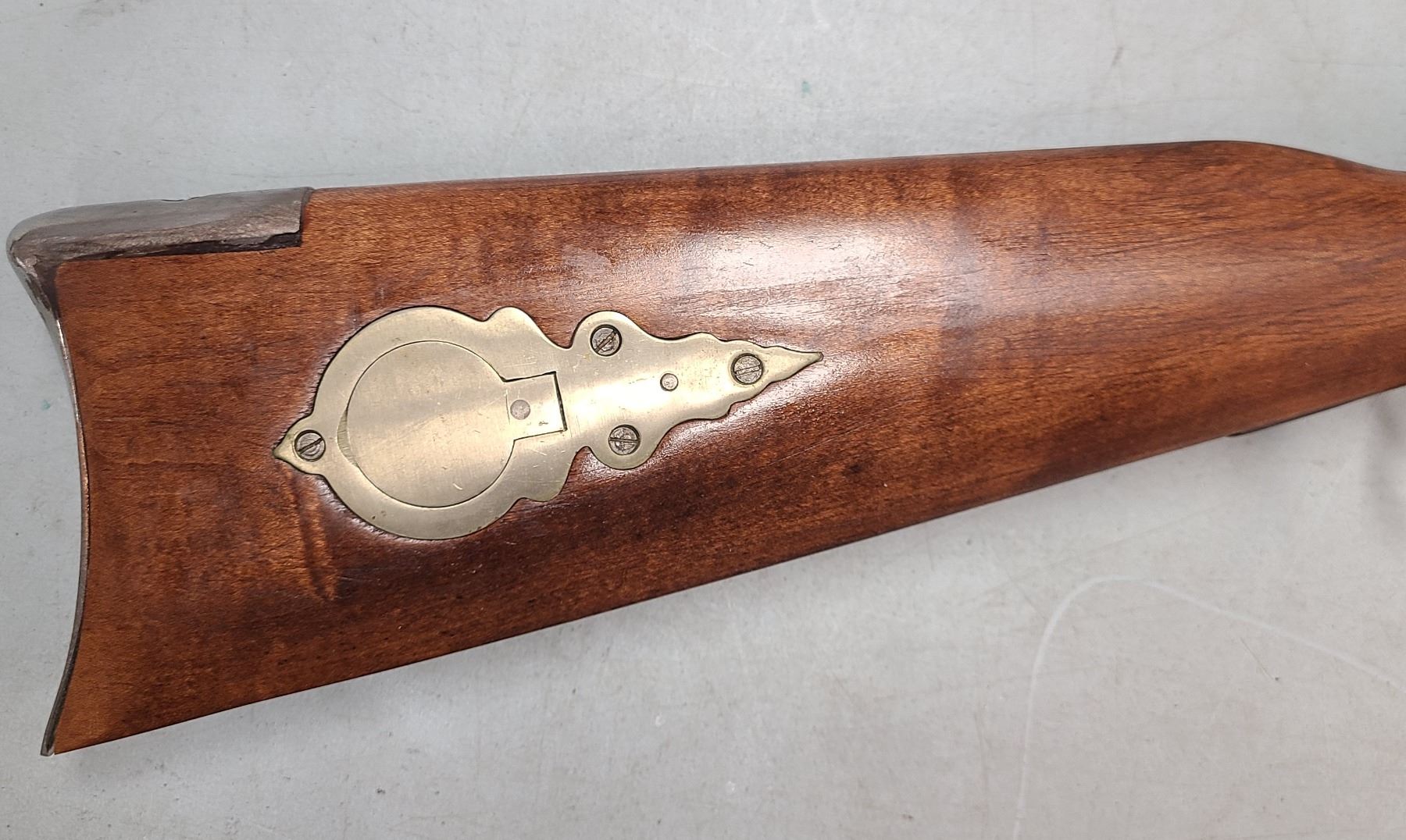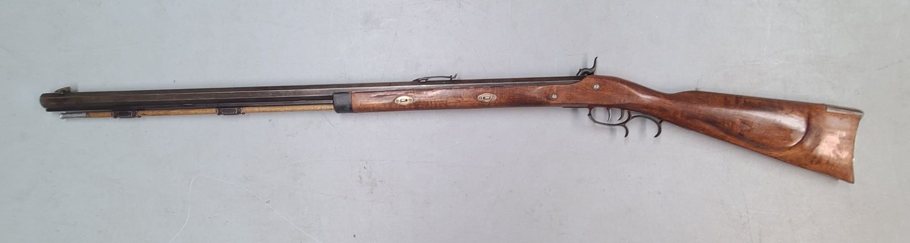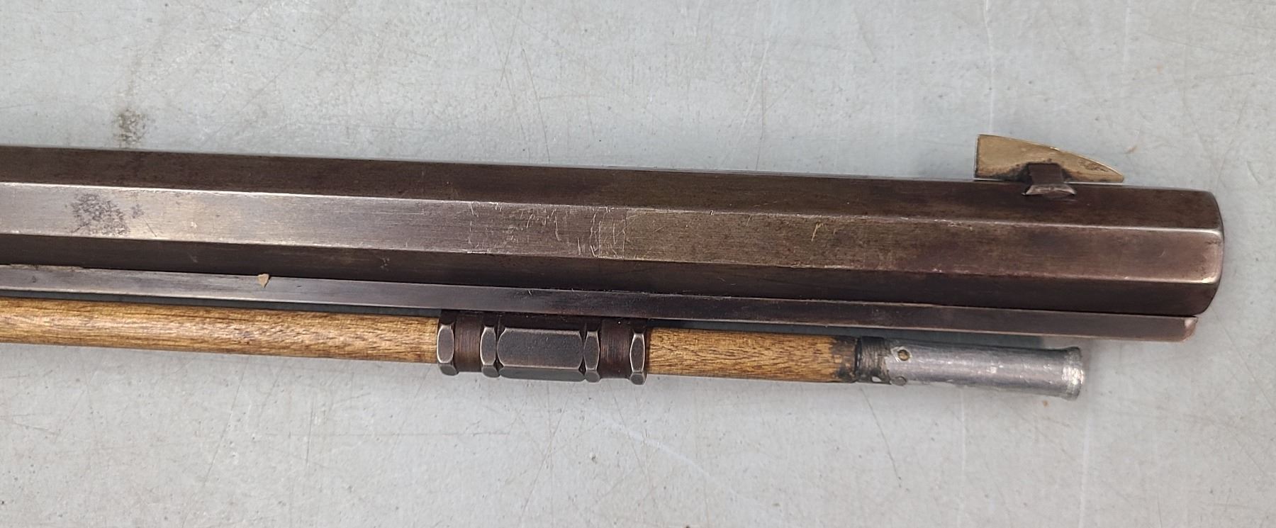 The stock is smooth wood half-stock with a capped forend, brass wedge, straight