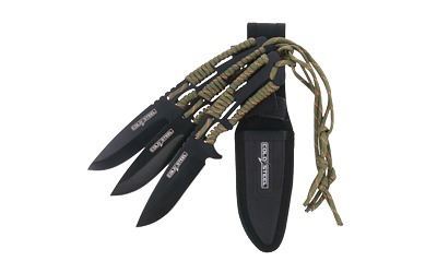 Made from tough 420SS steel and finished with a scratch resistant black oxide protective coating. These throwing knives are beautifully balanced for accuracy and hard wearing for longevity. Their sharp, functional utility edge and paracord wrapped handles help them also serve as excellent bushcraft or survival knives. The set of three are easily stored in the provided nylon sheath.