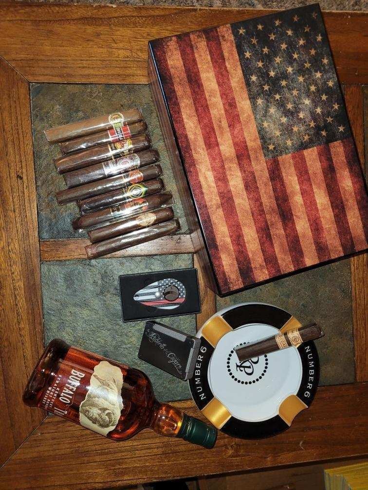 includes Buffalo Trace bourbon whiskey, 50 cigar humidor, Xikar cutter, torch lighter, ashtray and 10 premium cigars