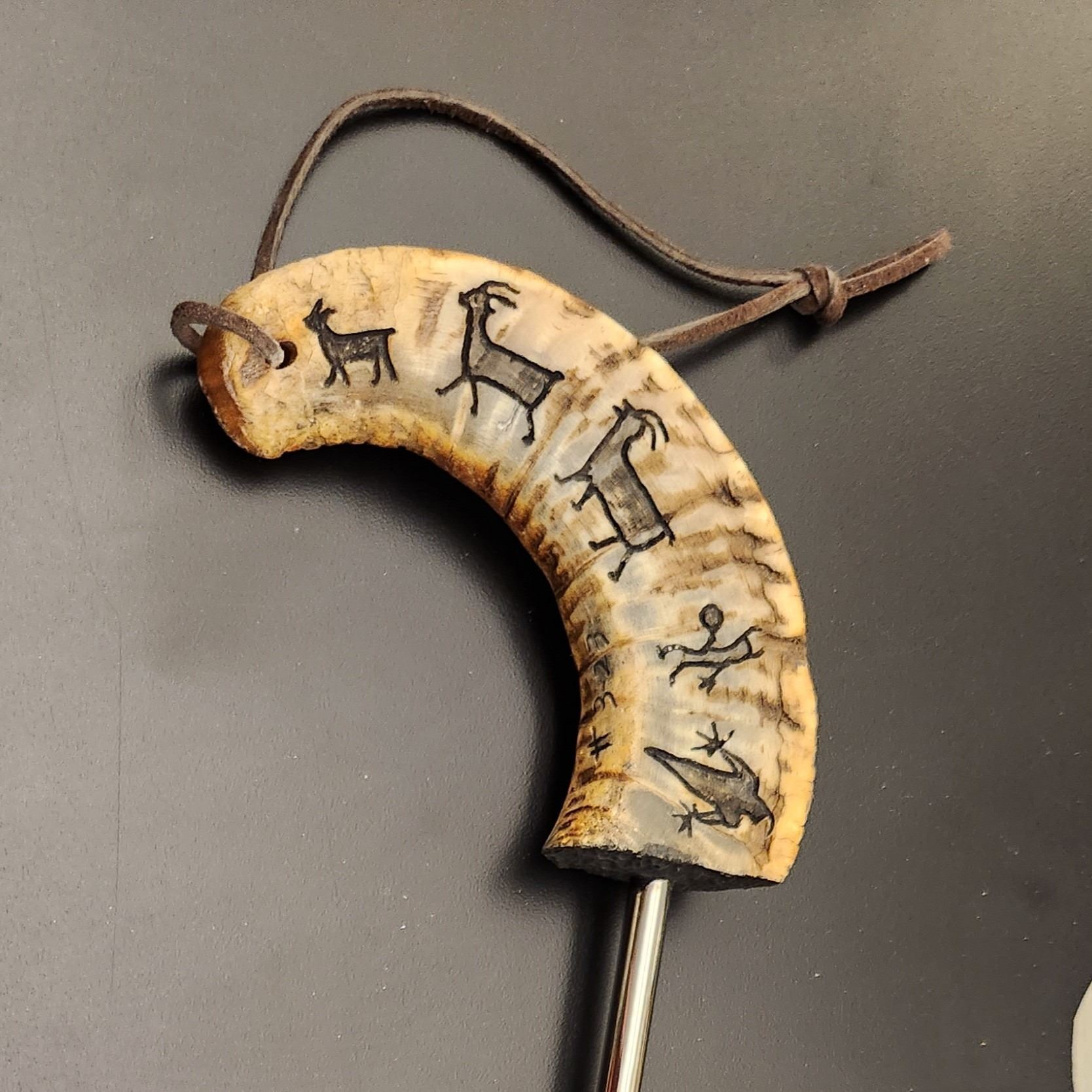 Custom carved NBU sheep horn barbeque fork: NBU Petroglyph