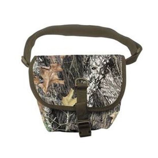 Quiet camo cloth that has enough room for all your days needs. The long strap can fit over your shoulder easily. The front pocket has a quick-clip for easy retrieval of accessories or lunch. 10''x10''x6''. Mossy Oak Break-Up camo.
