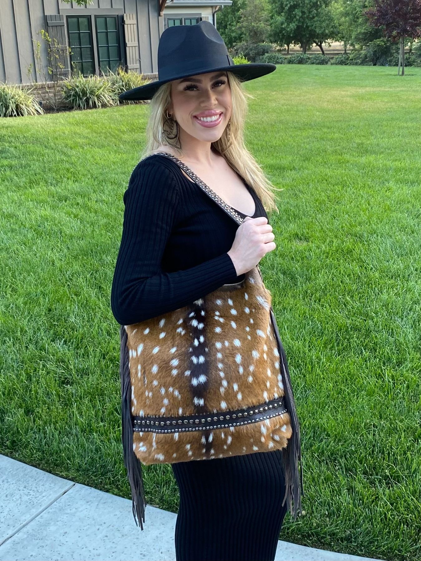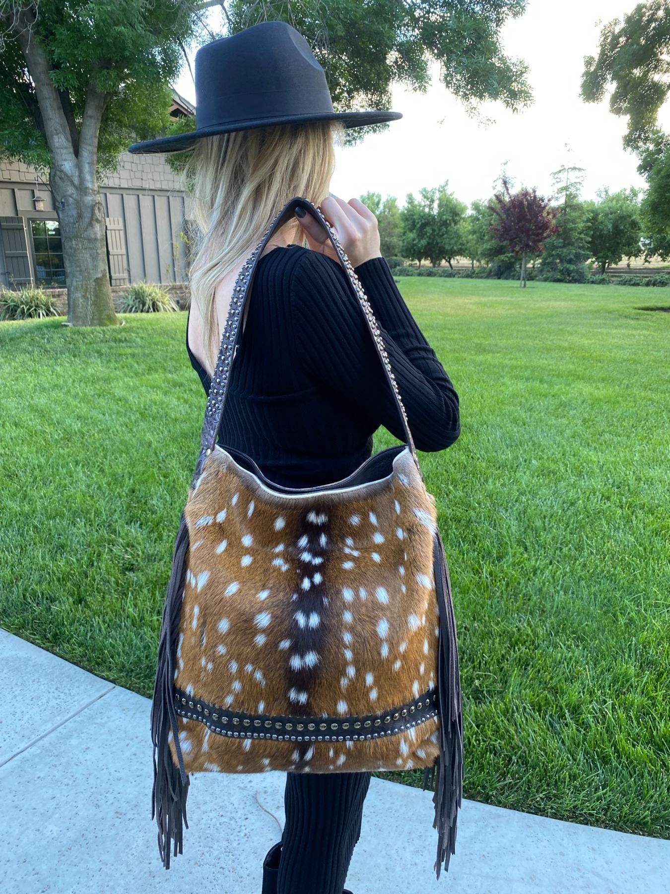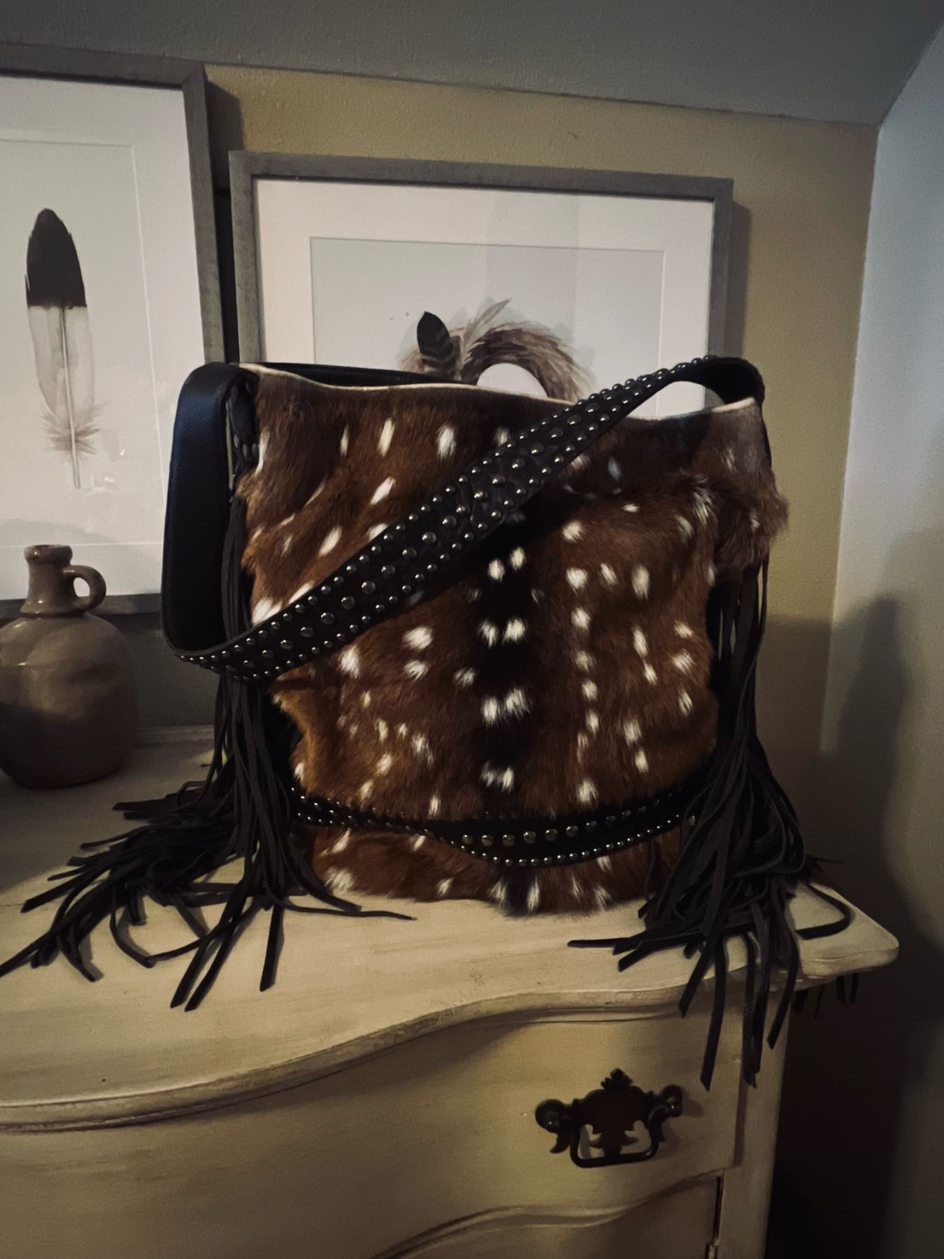 A one of a kind stunningly beautiful ladies Axis Deer, Leather and silver studded purse with a Back pocket to fit a phone or essentials. More pictures to come