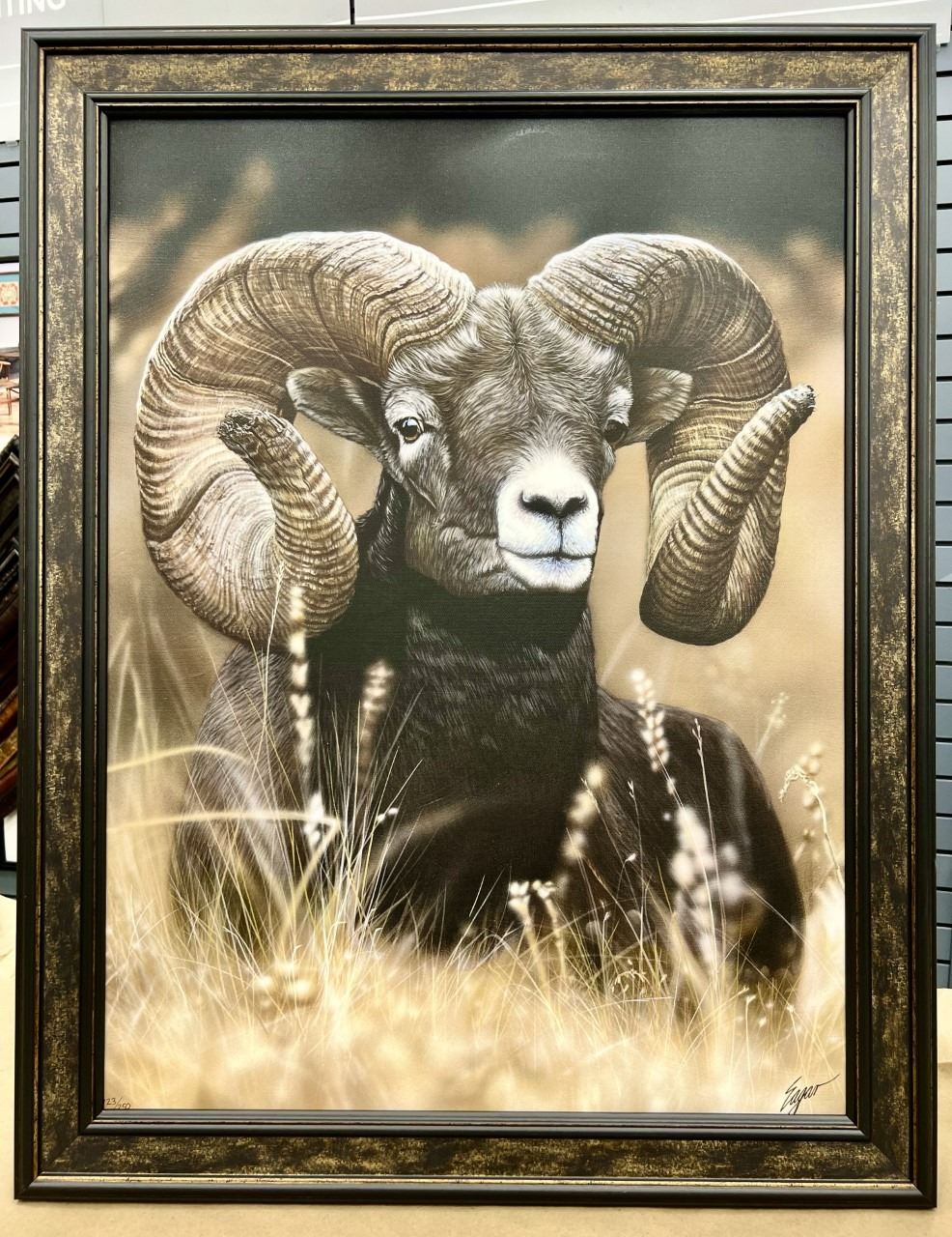 What a magnificent ram depicted in this impressive canvas giclee. In artist Clint Eagar’s words: “I was awestruck by how beautifully this bighorn ram was captured in this magnificent shot. This ram is a new world record and scored at 216-3/8. The image was taken by photographer David Irwin just over a year before this large male died of natural causes. It was a long and rigorous trip where the photographer almost lost his life on the journey. I reached out to him regarding the image and got rights to do the painting." Signed and numbered, 123 of 250. Includes a Certificate of Authenticity signed by the artist. Image size 24 x 32, framed size 29 x 37. We thank SCI for this generous donation.