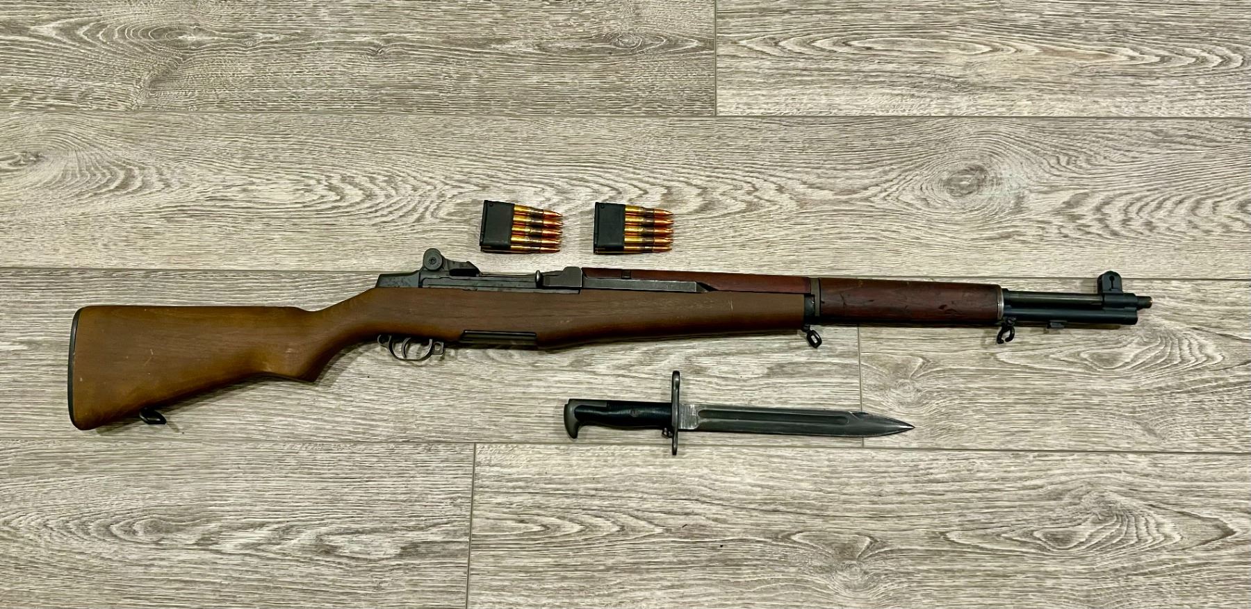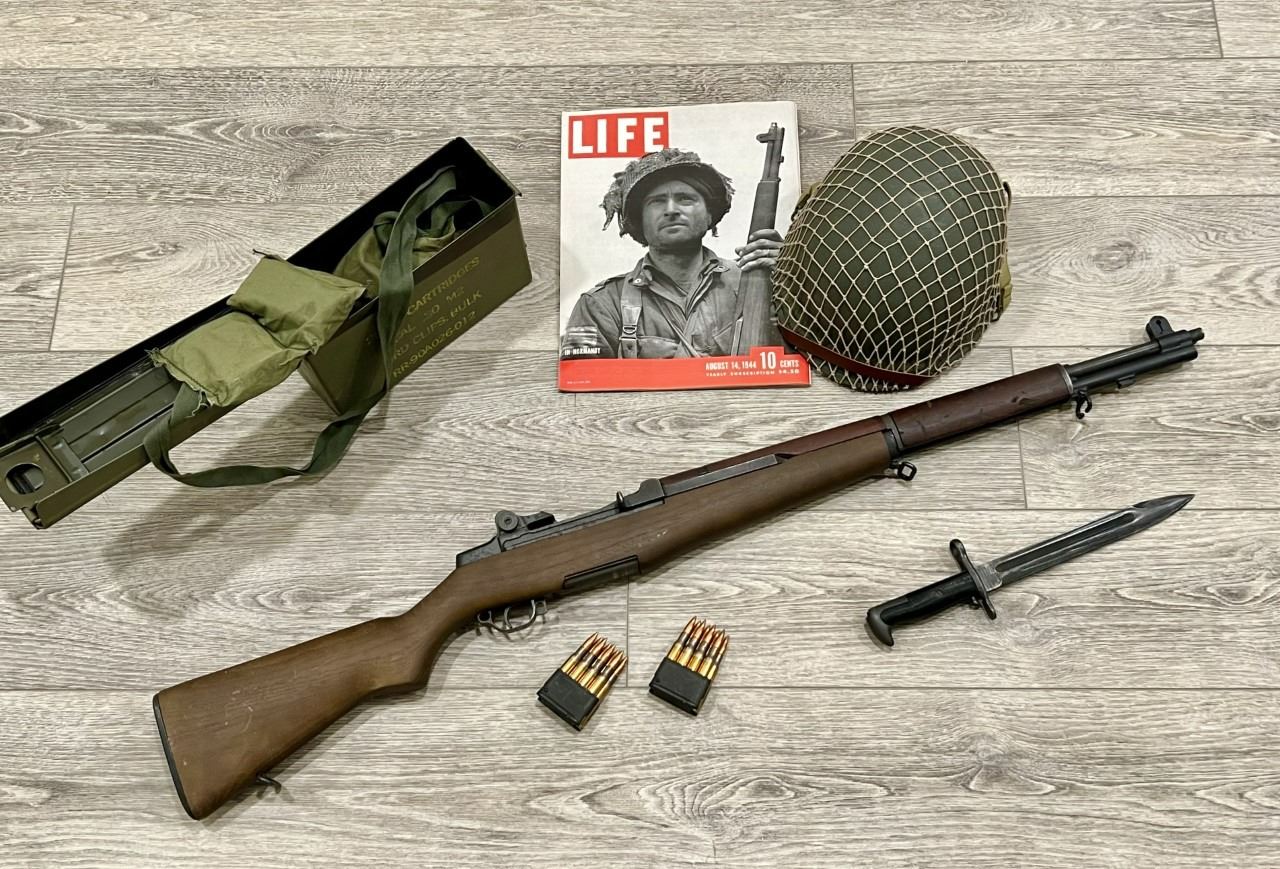 The story of this rifle: It was issued to, loved by, hated by, carried by young soldiers who were far from home and loved ones, doing a job they most likely would rather not be doing, in a place they would most likely rather not be. Its 6-digit serial number and milled trigger guard (not stamped metal) tells us that it was an early production rifle. This one was made in the Springfield Armory plant in October, 1942, and it received a new barrel in May, 1945. Since it had to have a barrel replacement, this one undoubtedly saw a lot of combat, slept next to a soldier on the ground or in a tent if it was lucky, heard jokes told while being cleaned, and bullshit sessions while chow was eaten next to it from a metal field kit. It's been rained on, snowed on, been hot in the sun and hot from firing. It may have been in Pacific battles at Iwo Jima, Guadalcanal, Tarawa. Perhaps the campaign in Northern Africa, or in Italy at Anzio or Monte Cassino. Maybe it also saw action in Normandy, France, on D-Day, and through the Battle of the Bulge. It should be wearing a blue hat that says “Veteran” and tottering around a VA hospital, or better yet bellied up to the bar at the VFW where younger M16s and M4s buy it drinks and listen to its stories. This is a piece of American history in .30-06 caliber. As General George S. Patton wrote in January, 1945: “In my opinion, the M1 Rifle is the greatest battle implement ever devised.” Included with this rifle are a proper bayonet and two 8-round clips. Value: Priceless. We thank Dale and Marla Rimkus for this amazing donation.