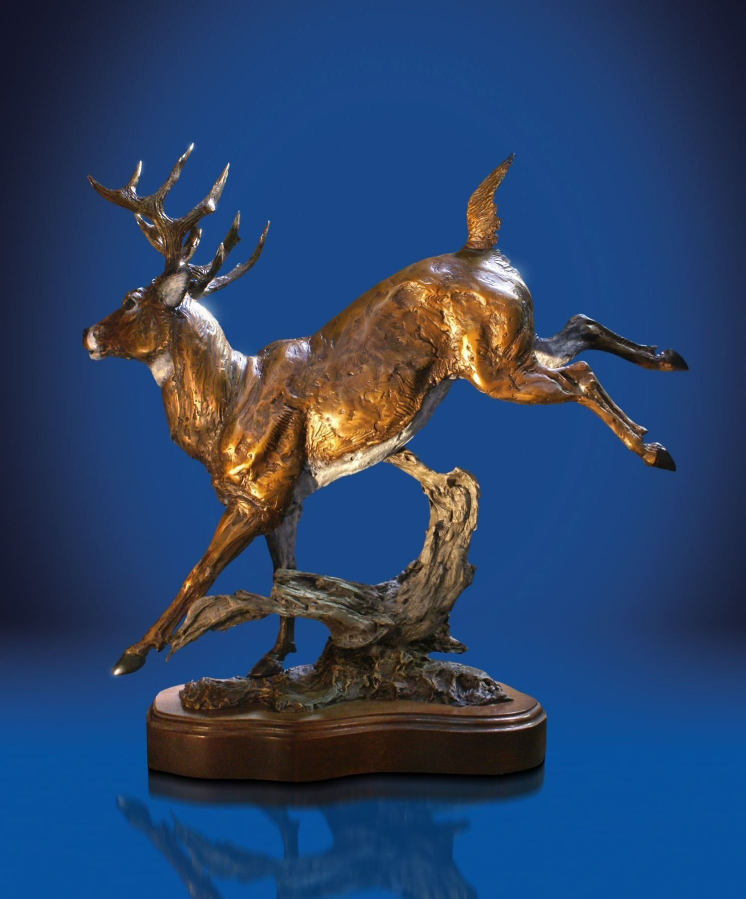This limited edition bronze statue by artist Lorenzo Ghiglieri depicts a deer high-tailing it over a gnarled log in a magnificently and very detailed manner. Lorenzo Ghiglieri is known the world over for his faithful reproductions of North American wildlife. This beautiful White Tail buck can be recognized by the characteristic white underside to his tail, which he displays as an alarm signal during escape, thus earning the name, “HIGH TAIL”. Lorenzo’s work graces the walls of the most prestigious establishments in the world. His sculptures and paintings have been presented to Pope John Paul II at The Vatican in Rome, President Ronald Reagan at the White House, Mikhail Gorbachev of the Kremlin and King Juan Carlos of the Royal Palace in Madrid. Tiger Woods, Luciano Pavarotti and General Schwartzkopf are only a few of the many fine art collectors who have taken pride in their ownership of Lorenzo Ghiglieri sculptures. Now you, too, can own an authentic Ghiglieri bronze. Edition 124 of 350. Dimensions: 18”h x 20”w x 9”d. Value: $10,500