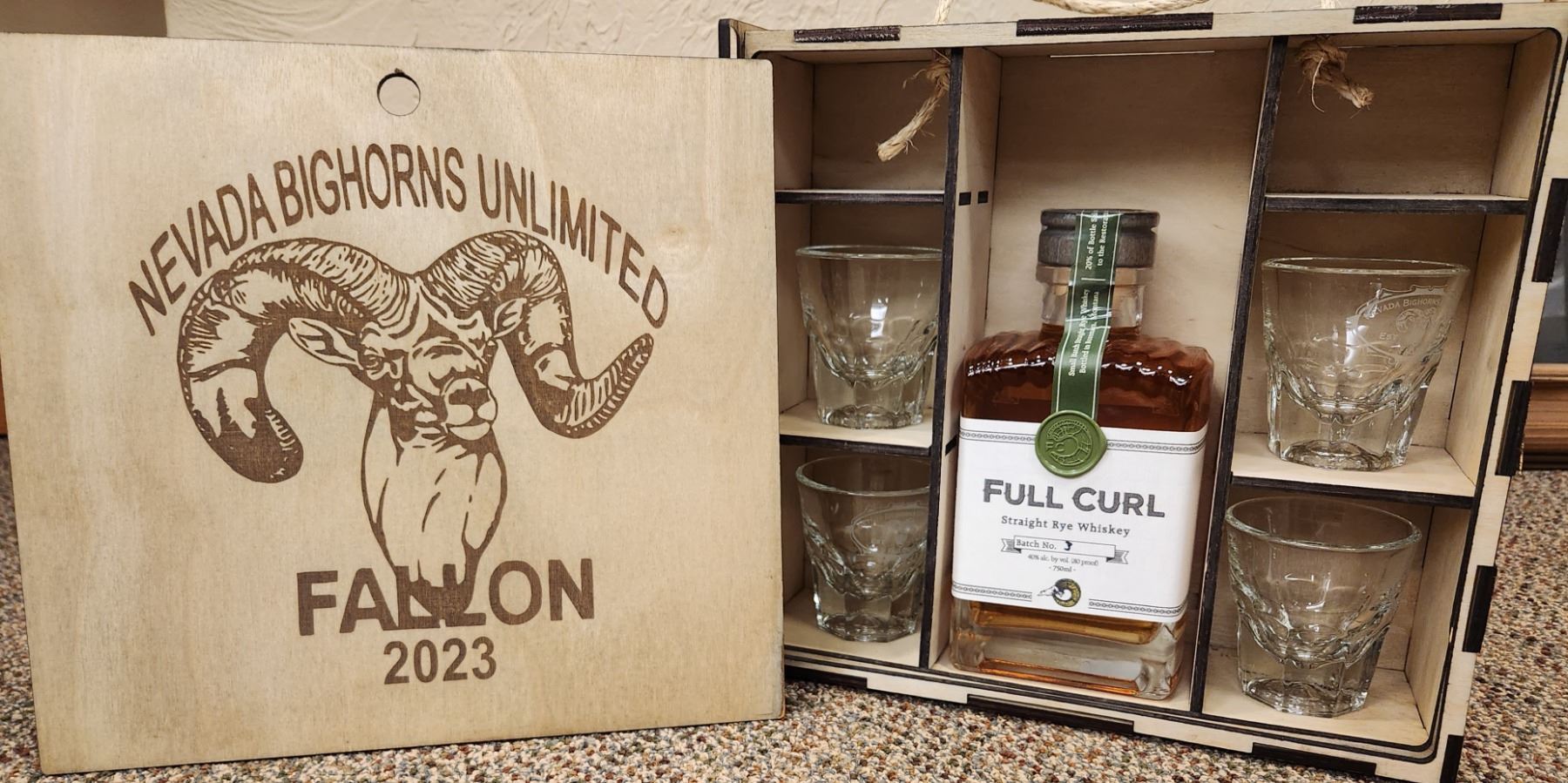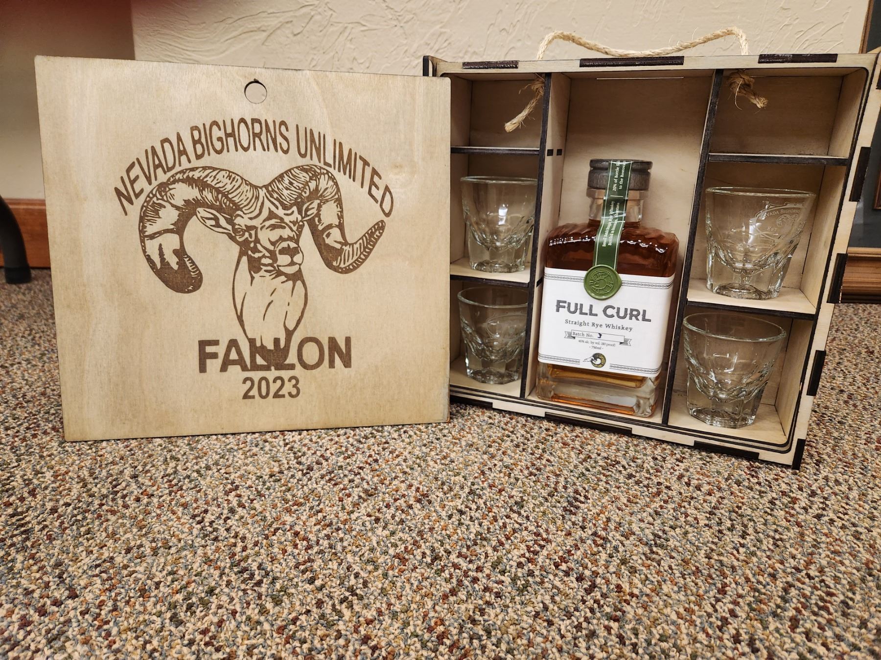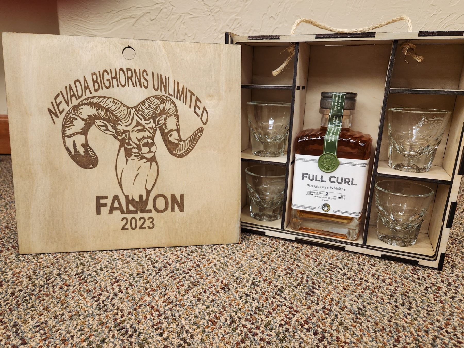 Full Curl custom NBU whiskey set Fallon NBU custom box with Full Curl rye whiskey & 4 glasses