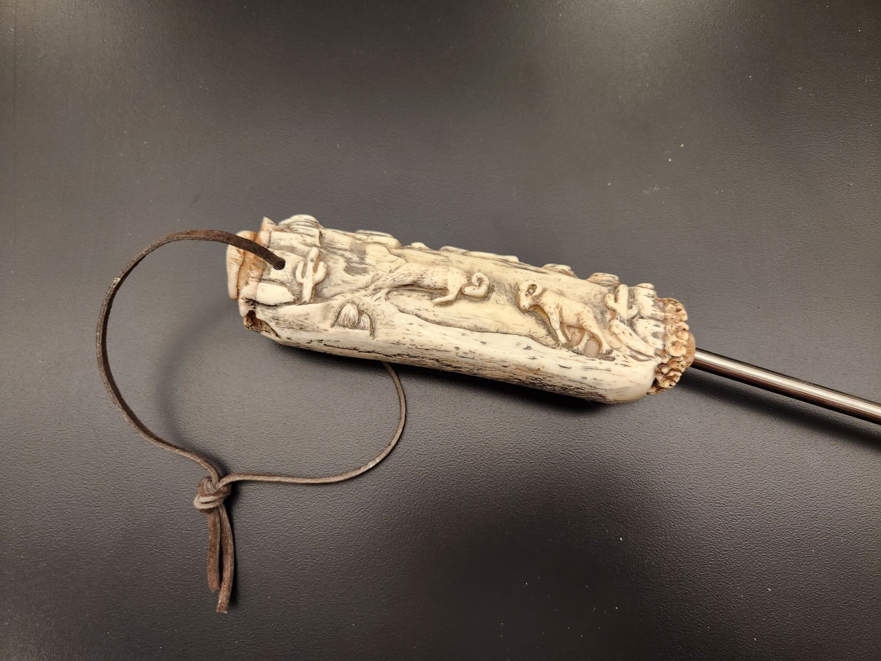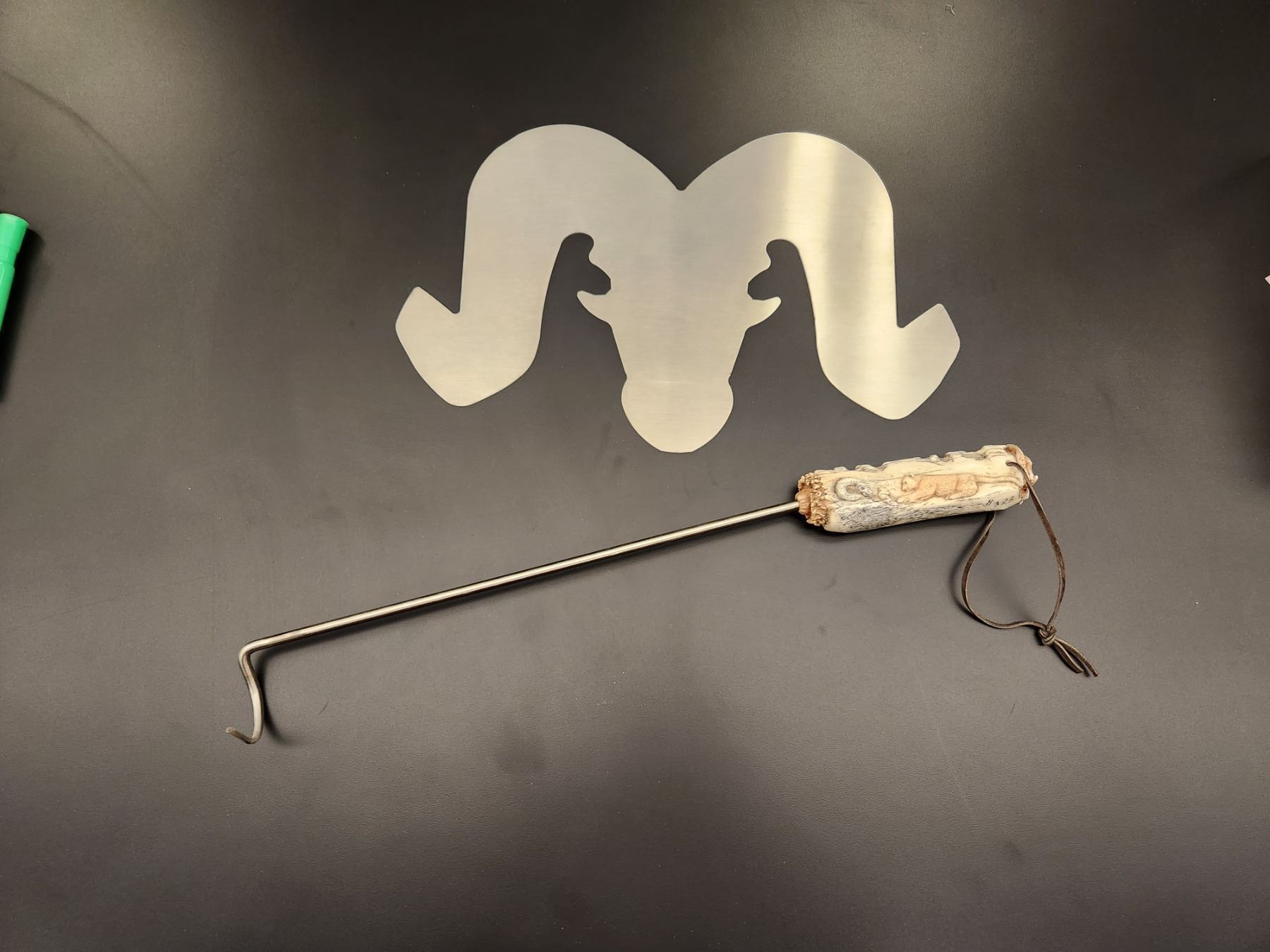 Custom carved sheep horn pig tail barbecue flipper: NBU Desert Bighorn custom carved sheep horn grill utensil