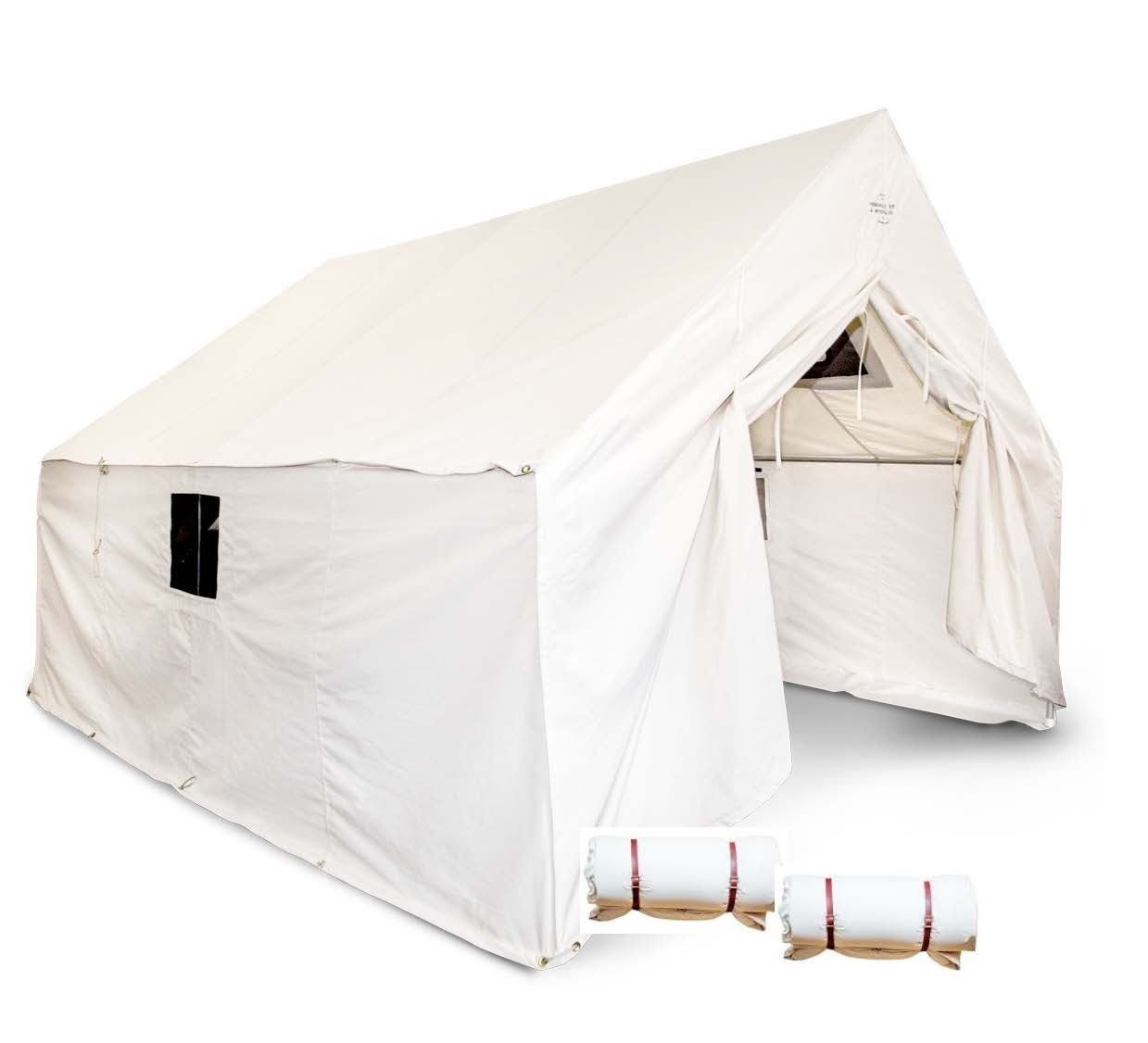 Custom NBU wall tent (12'x12') & 2 cowboy-style bedrolls customized with NBU logo: 2 bedrolls & tent - tent includes steel frame & fittings, 2 zippered doors, 1-window, sod cloth, 5” Stove pipe jack