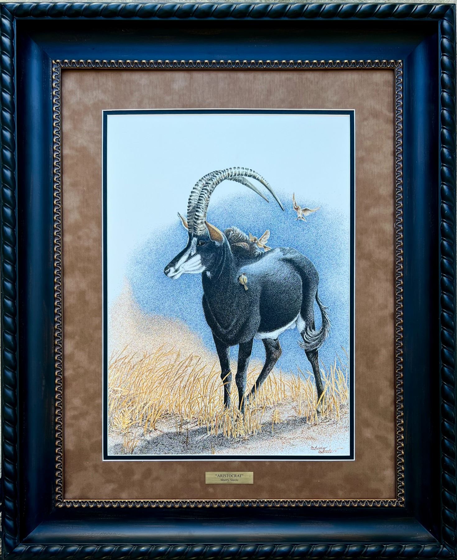 "Aristocrat" - original pen artwork by Sherry Steele, measures 26"x32". "Simply said, he is royalty. The stunning markings and regal carriage of sable antelope have always set them apart. My first sighting of sables in the wild, was in Kommetjieshoek, South Africa, where the wary herd had melted back into the brush as quickly as we saw each other. Controlling the impulse to immediately follow them into the bush, my patience was finally rewarded as they re-emerged into a clearing and gradually settled down to graze. Only allowing me to sketch them from a distance, it was not until a recent invitation to the renowned Star S Ranch in the Texas Hill Country that I was finally able to add the necessary details for this piece." - Sherry Steele. Building layer upon layer of colors with her pens, Sherry captures the rich textures of nature with her unique approach to pen and ink. Using no paints and no washes, the result can be astonishing to the eye. Distinctive in its style, each piece of Sherry’s work becomes a treasured moment in time on your wall. DSC FOUNDATION THANKS SHERRY STEELE UNLIMITED FOR THIS 100% DONATION. Sherry Steele, 512-626-0119, 5335 Magdelena Drive, Austin, TX 78735, steeleart19@gmail.com, SherrySteele.Net.
