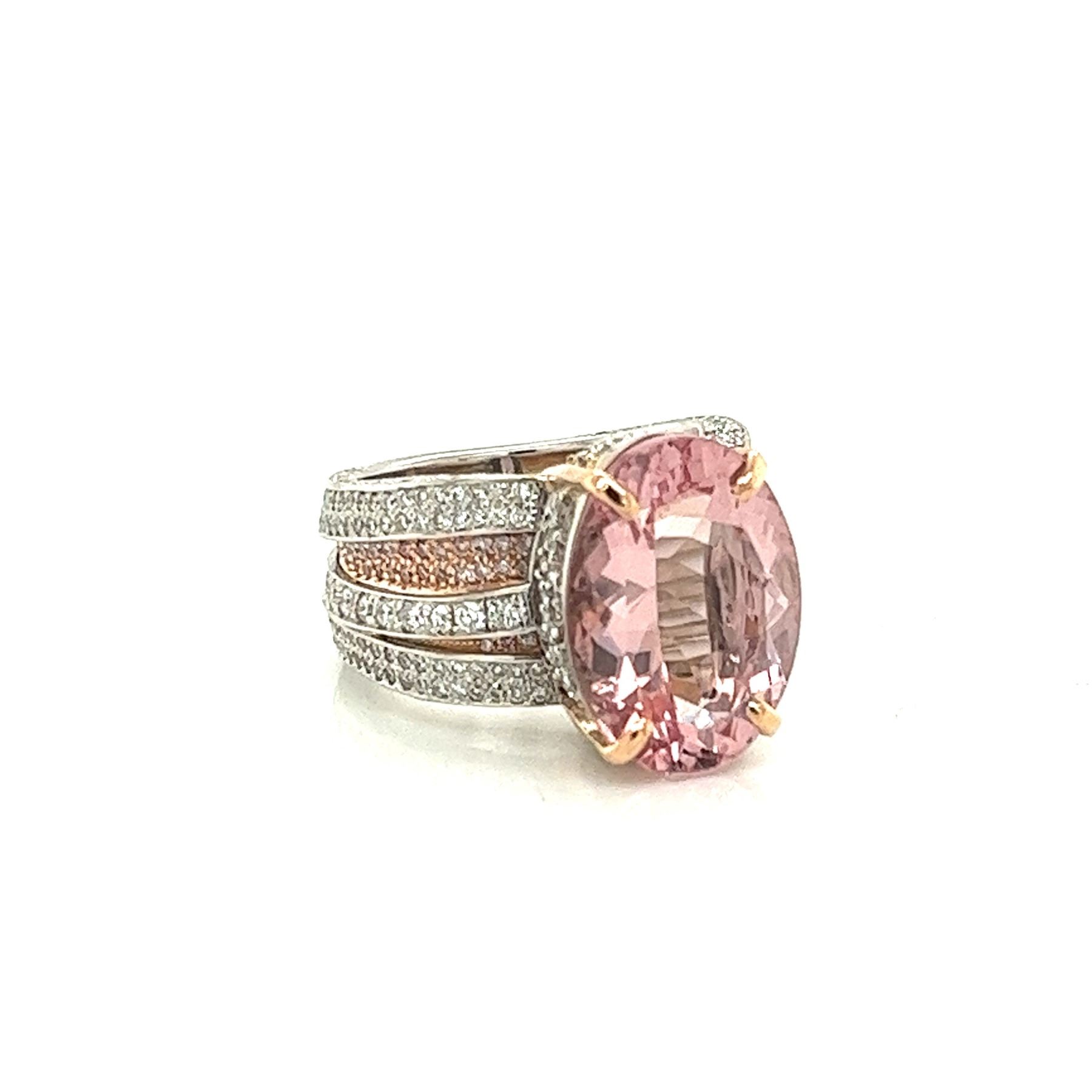 Ladies 18 karat white and rose gold, full custom designed Morganite, diamond and pink diamond ring. Set in the center of the ring is one very fine, oval shaped, pink Morganite weighing 7.96 carat. Bead set in white gold on each side of the ring and in the gallery are a total of three hundred thirty-one round brilliant cut diamonds with a combined total weight of 1.55 carat. Bead set in rose gold on each side of the ring are a total of seventy-three round brilliant cut natural pink diamonds weighing a combined total weight of .32 carat. The ring is a finger size 6.5 and can be adjusted up or down one size. The design is a one-of-a-kind. DSC FOUNDATION THANKS GUNDERSON'S JEWELERS FOR THIS 100% DONATION. Breanne Demers, 712-255-7229, 712-635-3161, Fax 712-255-3316, 4830 Sergeant Road, Sioux City, IA 51106, breanne.demers@gundersons.com, Gundersons.Com.