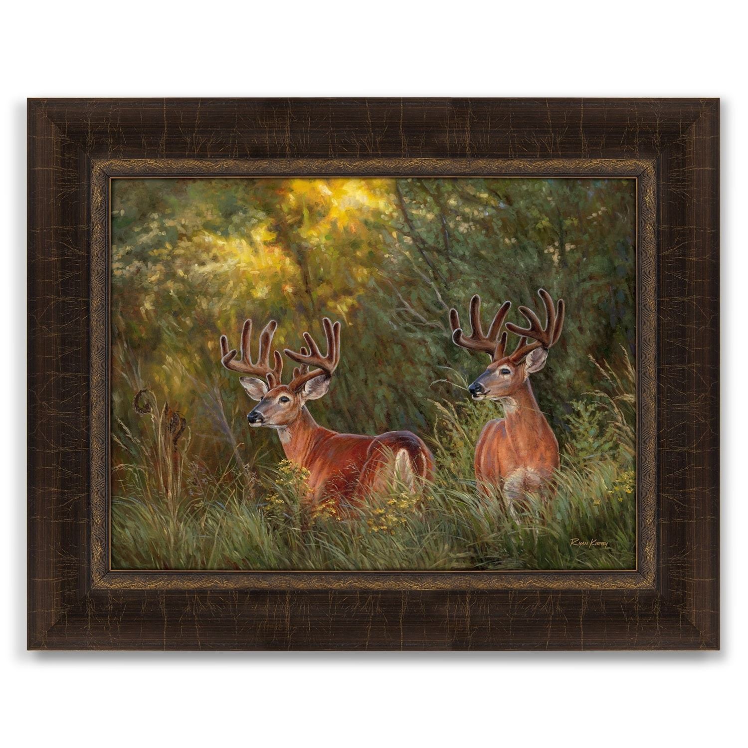 Most of the evening light is coming from behind the deer and lighting up the tree line in golden light, while their velvet racks are catching a lot of blue from the sky directly above them, highlighting their impressive headgear. These two late summer bucks are enjoying one of their last evenings together as buds. Soon this turf won't be big enough for both of them, and they'll go their separate ways in search of ladies.
