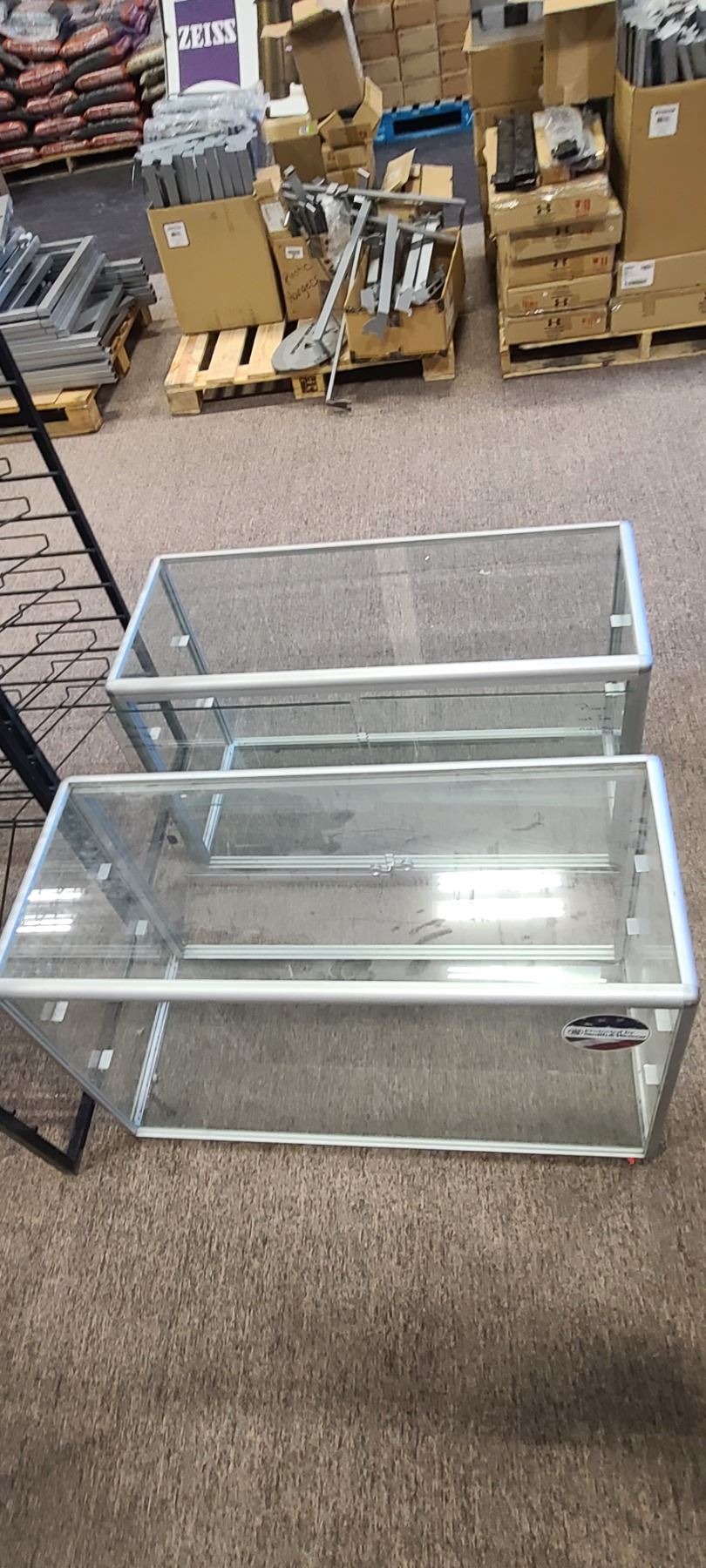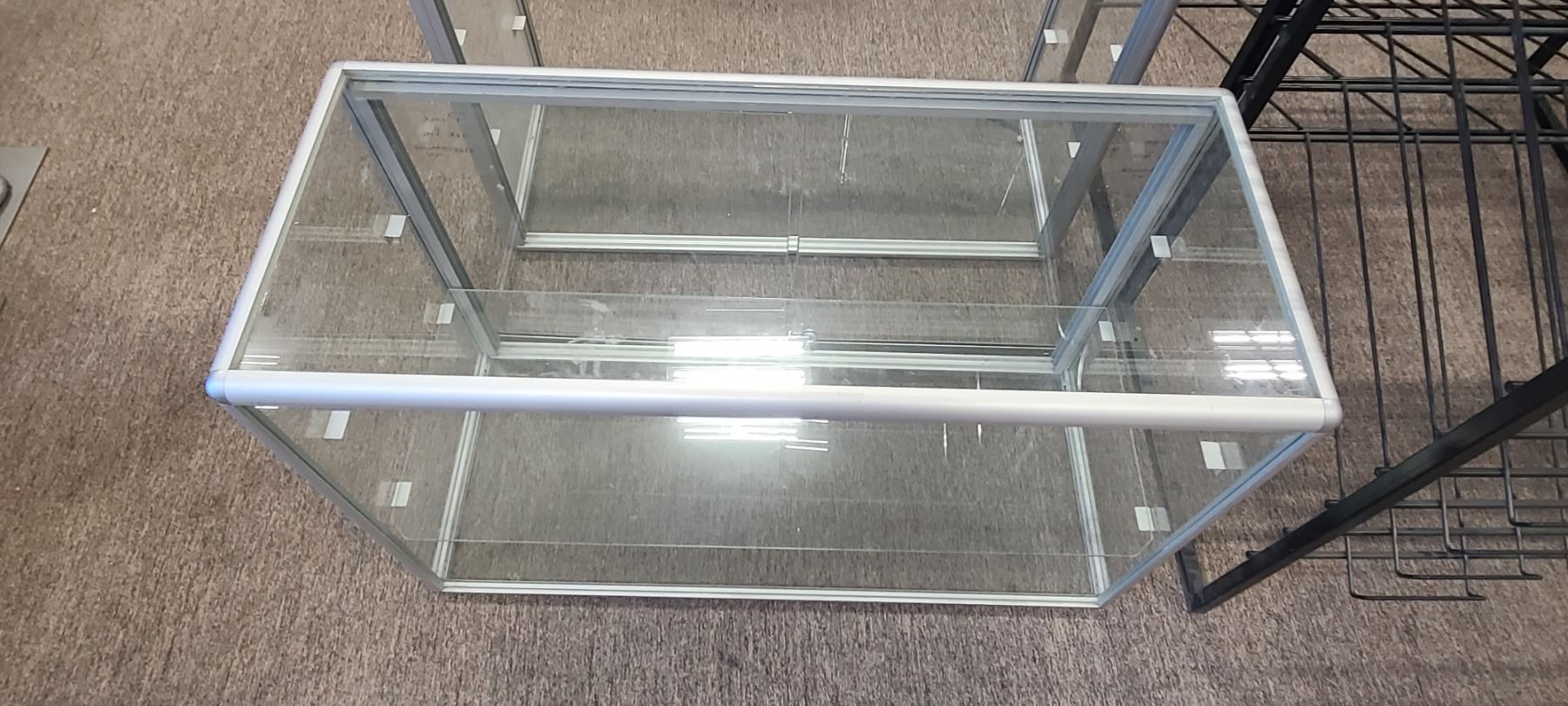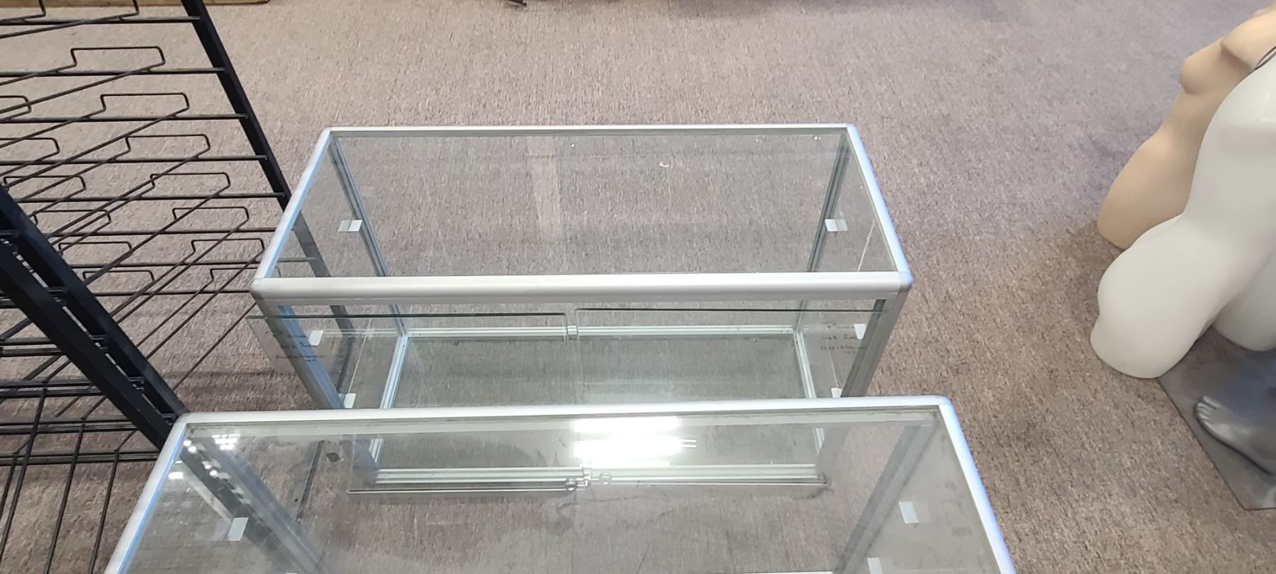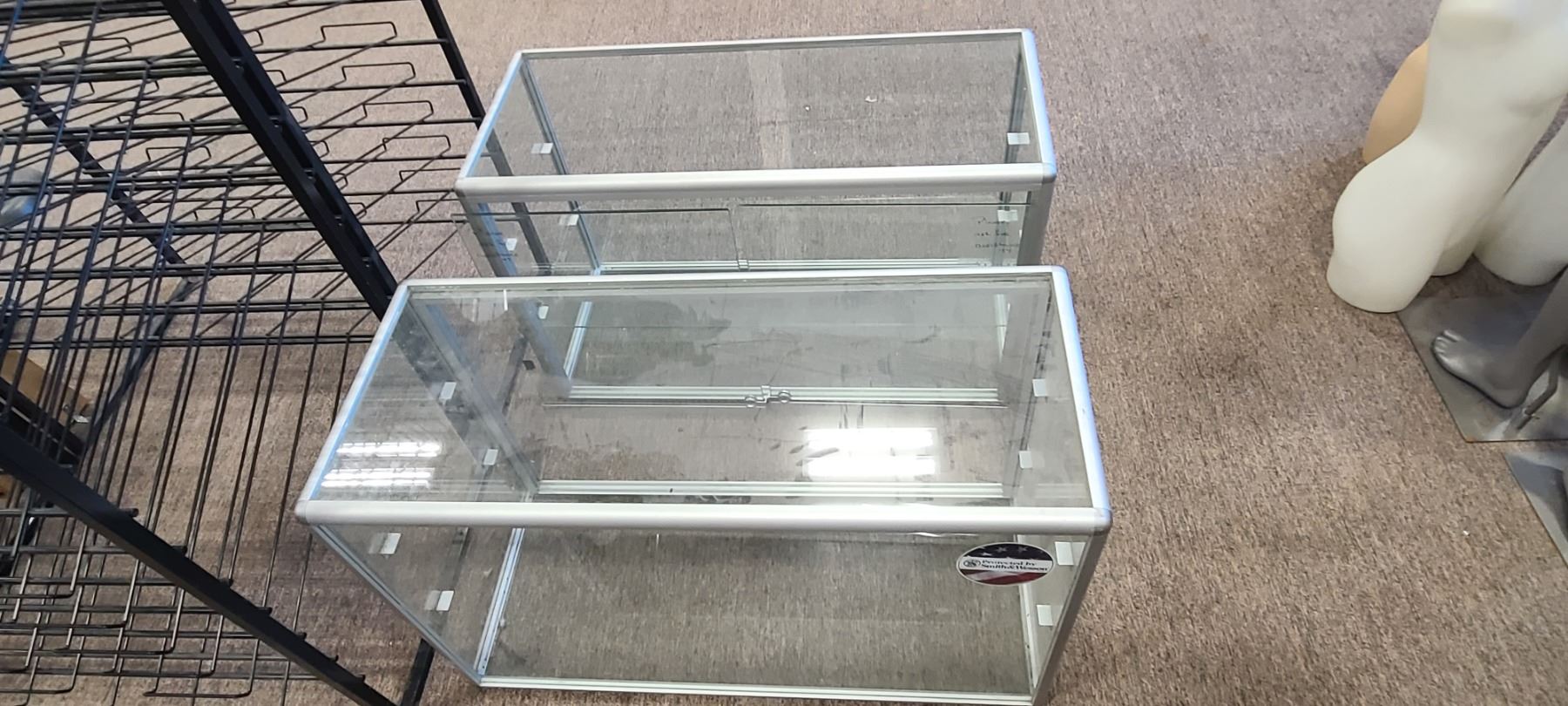 TWO GLASS DISPLAY CASES NO DOORS, ONE SHELF IN ONE. 38" X 24" X 16: