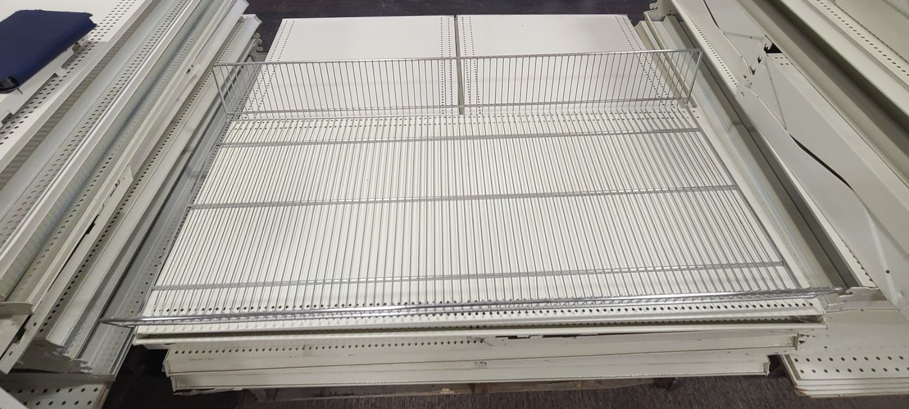 QTY 4 STAINLESS STELL PRODUCT BASKETS FOR SHELVING 4' X 26" X 6"
