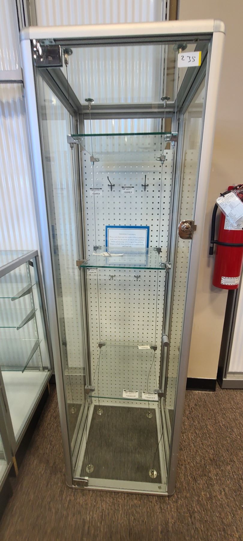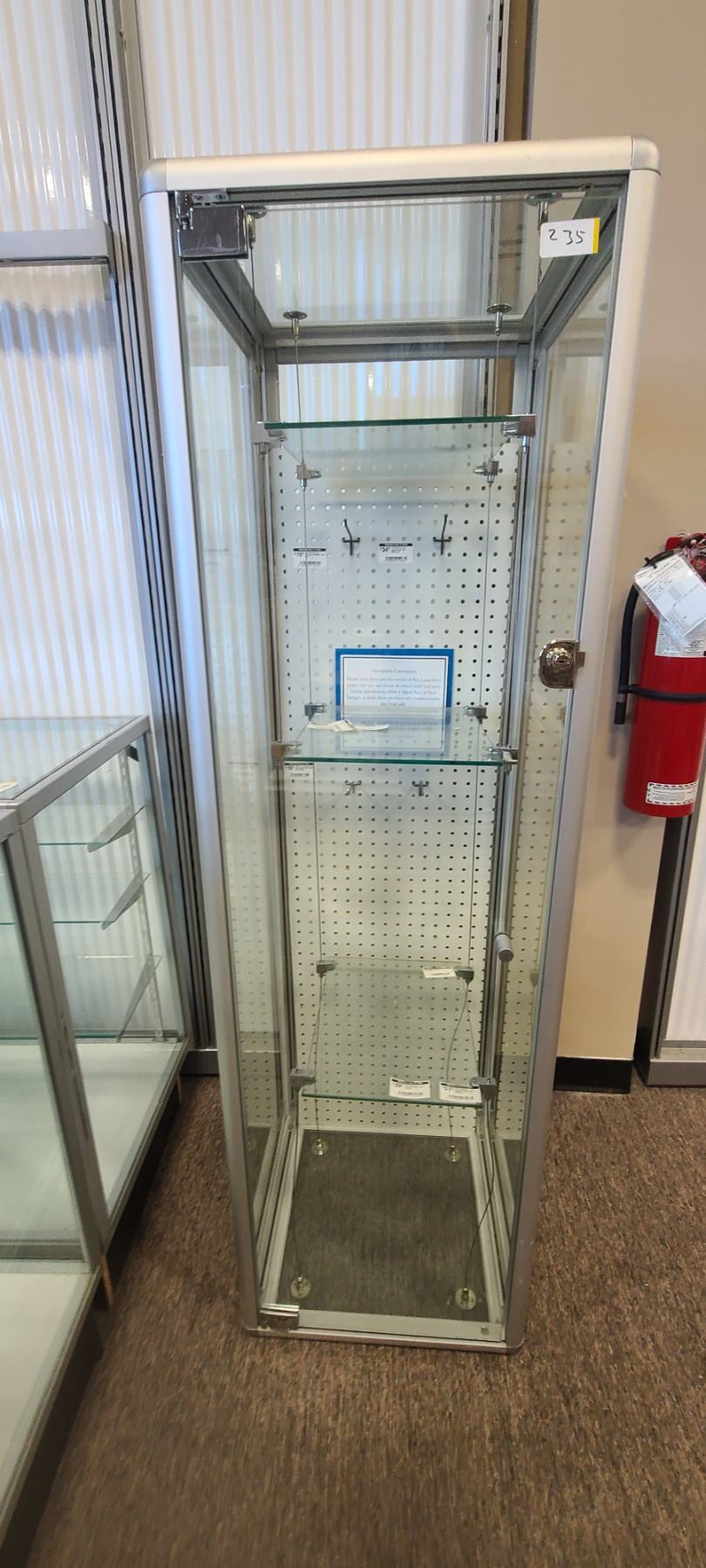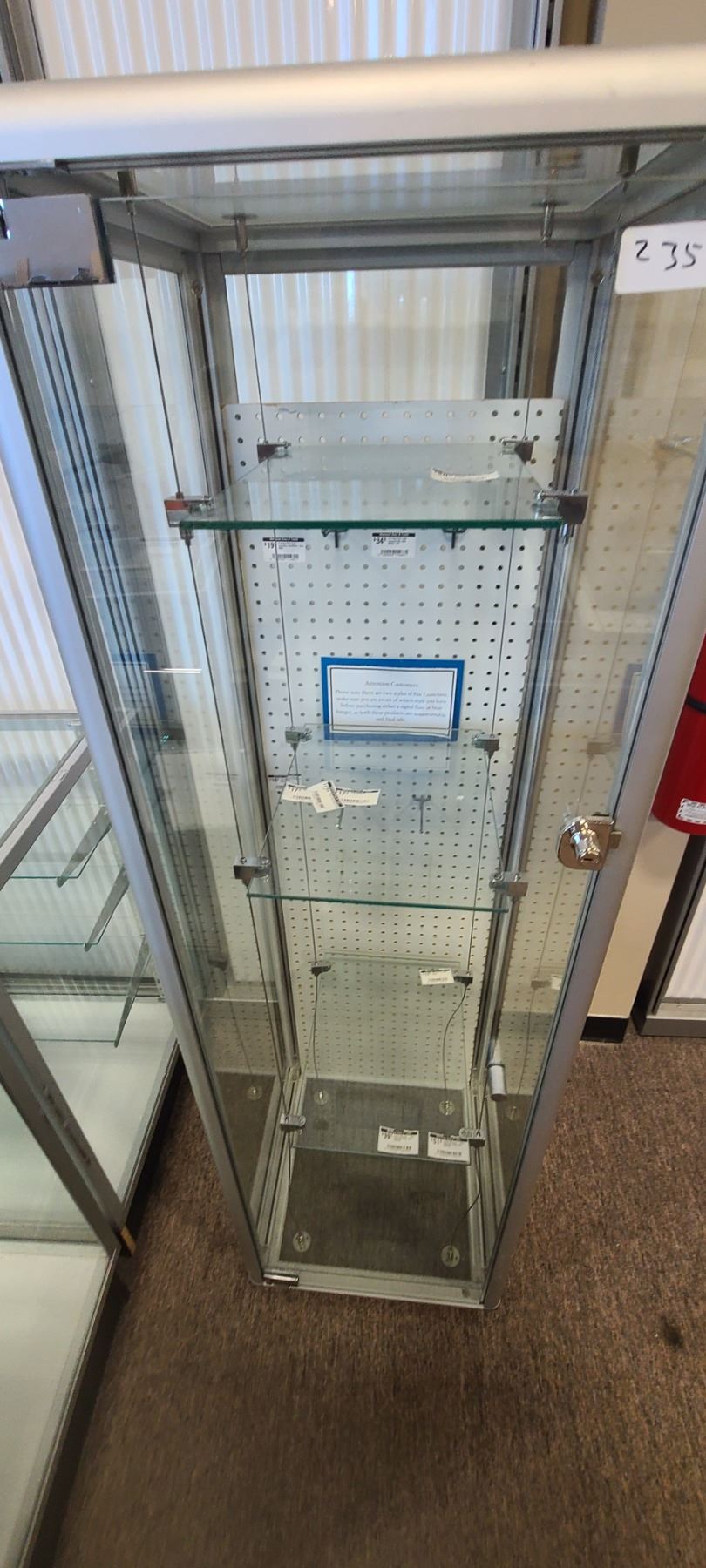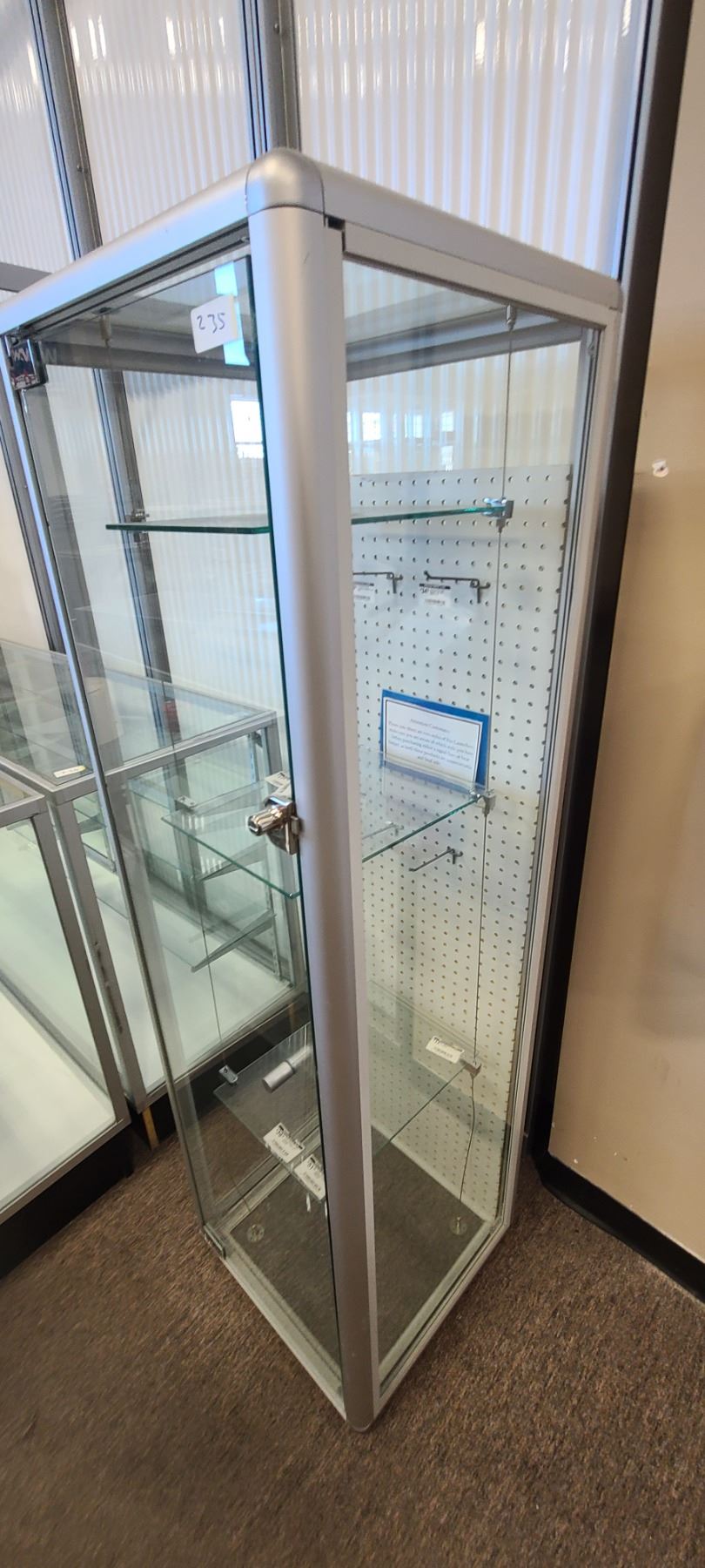 Lot 235 GLASS DISPLAY CASE HAS THREE SHELVES 63" X 19" X 18"