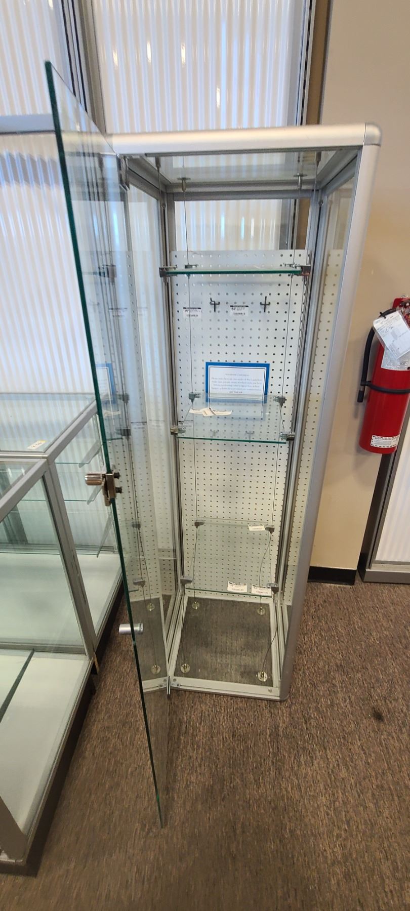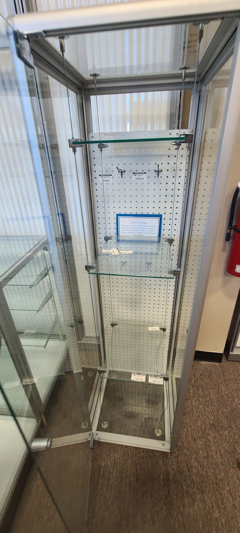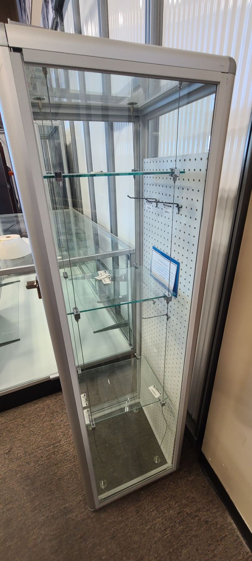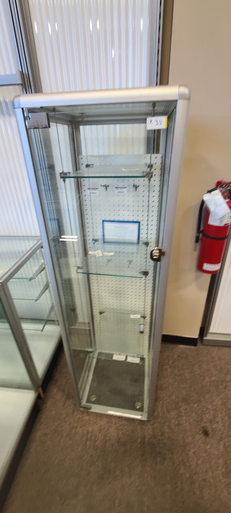 GLASS DISPLAY CASE HAS THREE SHELVES 63" X 19" X 18"