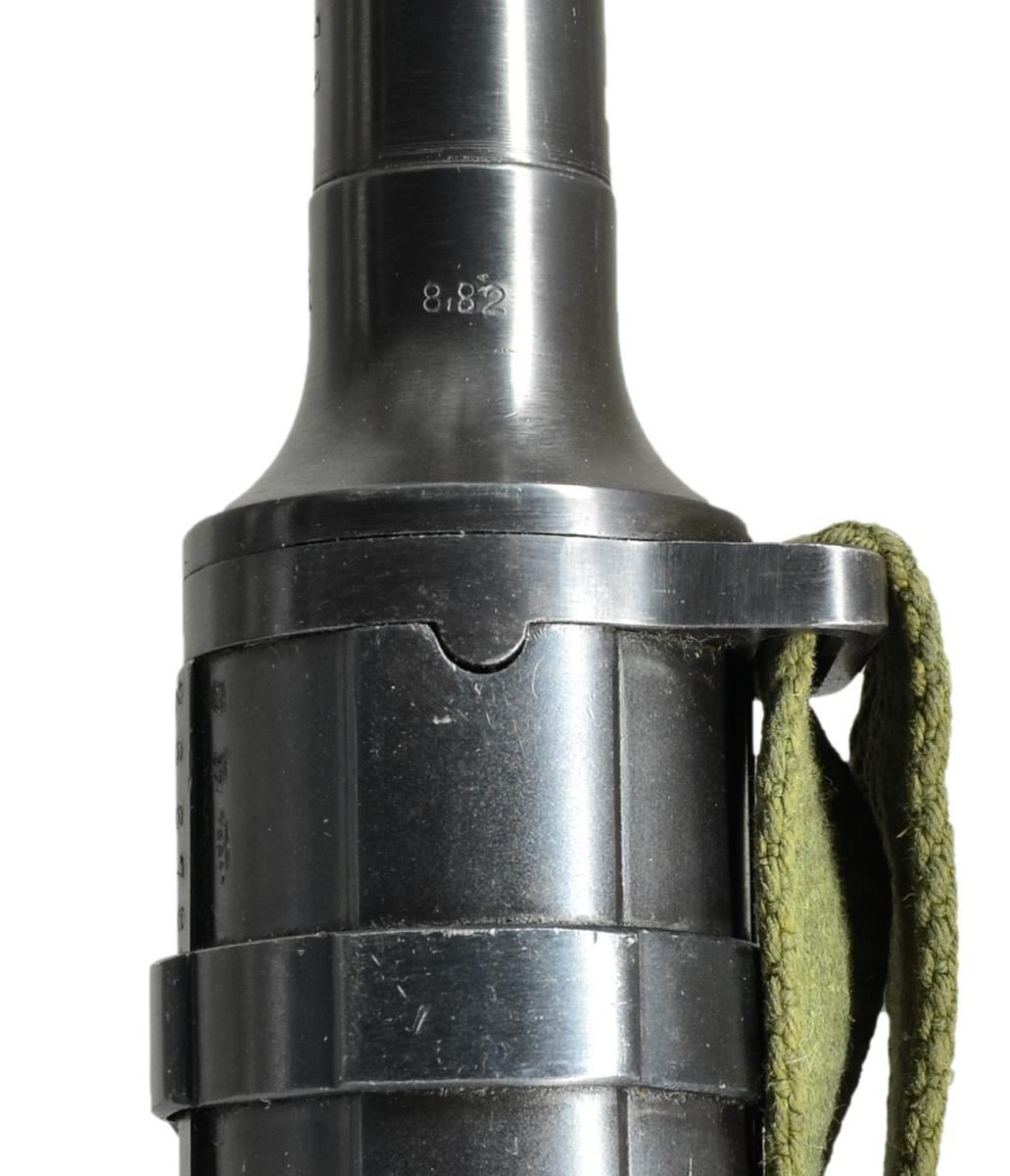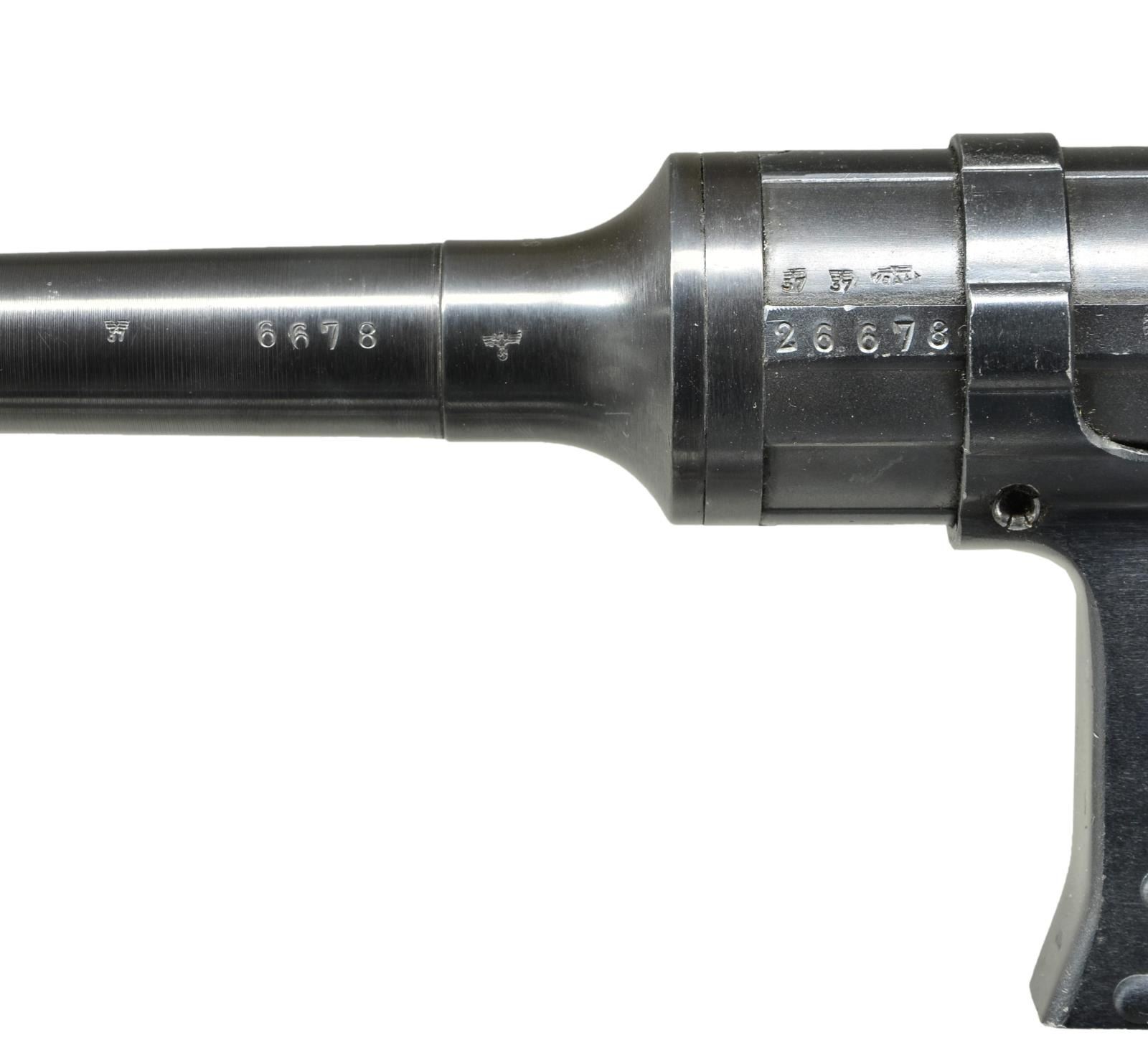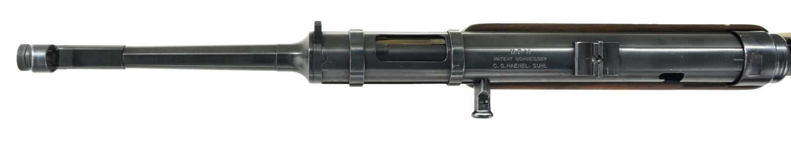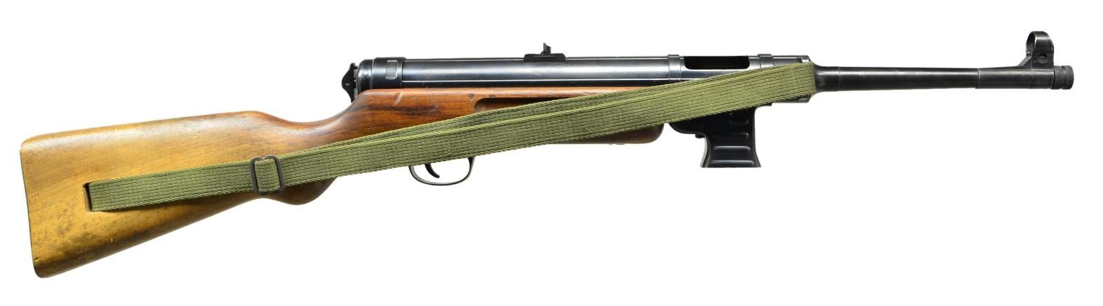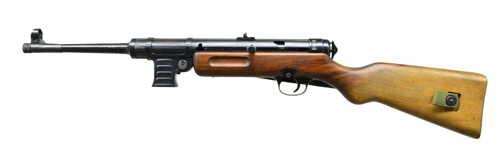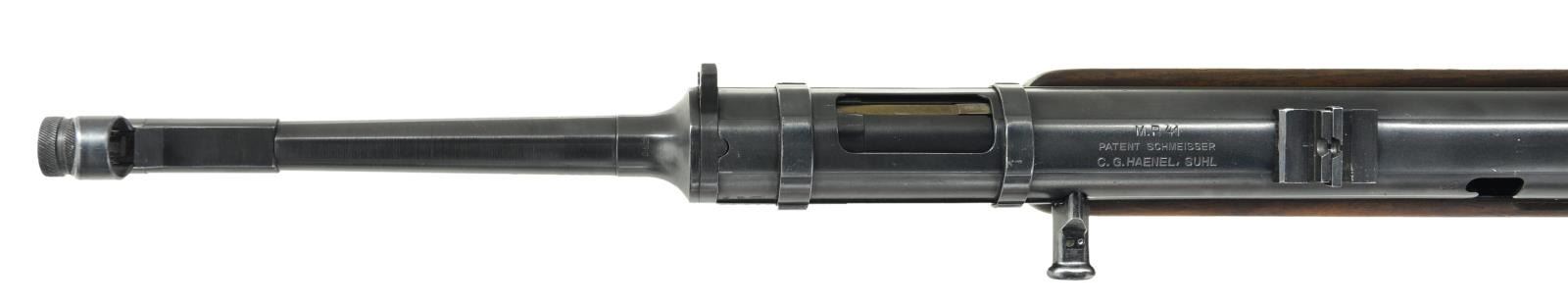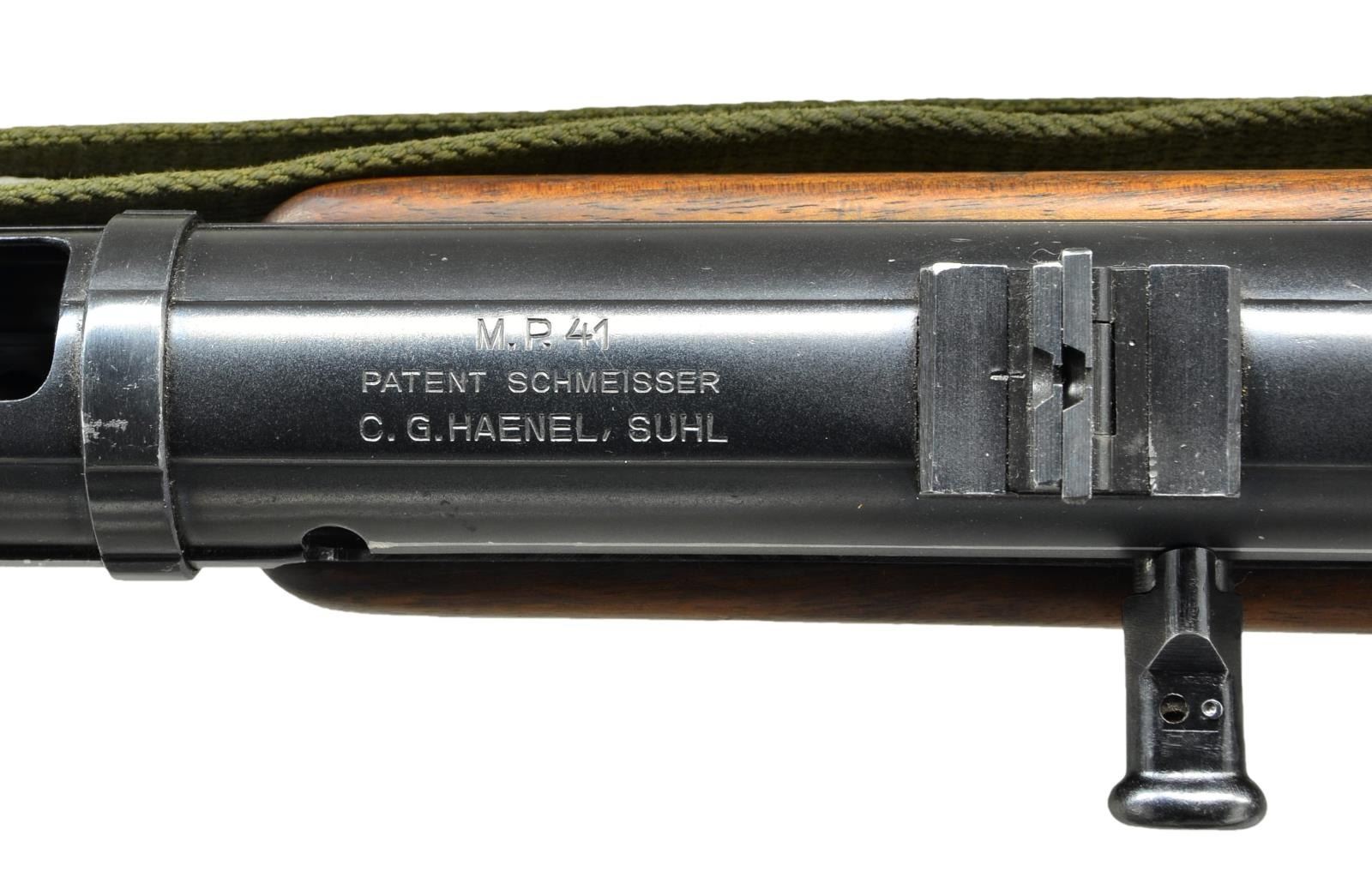 Cal. 9mm Parabellum. S# 26678. Bbl. 9.9". There are few WWII era submachine guns that are as rare & desirable as the German MP41. This “Upgrade” from the well known MP40 was designed in 1941 & based on the Hugo Schmeisser patent, with his direct involvement. It is believed that less than 5000 total were manufactured. It was intended to improve hit probability with the full stock and weighing in at over 9 pounds (loaded), boasting a cyclic rate of 500-550 rounds per minute. Smartly, the MP41 utilizes the MP38/40 magazines though more were manufactured and stamped MP41. They were never adopted by the German Wehrmacht (Unified Armed Forces) and most went to elite Schutzstaffel (SS) ranks for Military Police duty, if they saw military service at all. At first glance it seems to simply be an MP40 in a full walnut stock but there were many changes once actually inspected. There is only around 50% parts compatibility with the MP40 though it would outwardly appear much higher. Some of the more obvious differences include the deletion of the MP40 barrel nut and iconic resting bar, along with the inclusion of a selector switch above the trigger allowing select-fire operation. Front sight is a hooded blade while the rear sight is a rugged folding dual aperture notch, marked “100” & “200”. The receiver section remains a tube, drawn over a mandrel, adding the familiar ridges to add strength. The mag.-well is ribbed, and very similar in appearance to the MP40 style, incorporating a mag. release that is checkered on the bottom, slowly dropping lines as it moves up, having no texture at the very top. It is a blowback operated action utilizing a reciprocating, left side charging handle which has a safety slot to engage forward of the end cap. The MP41 design incorporates an end cap that is unlocked & turned 45 degrees clockwise to field strip it, removing the firing pin / recoil mechanism and bolt with ease. Solid, milled steel trigger guard and bottom plate. Walnut stock is terminated at the rear with a steel buttplate. Markings on the top of the receiver include ”M.P. 41 / PATENT SCHMEISSER / C.G. HAENEL, SUHL”. Several locations have the Waffenamt mark “WaA44” along with the Eagle over “37” which is common for the few of these that have surfaced. Barrel numbered to receiver “6678”, also bearing secondary number “2480B” on bottom, the same code we’ve seen with other examples. Green canvas sling on left side. CONDITION: this SMG looks as though it were stuck in a time capsule in the mid 1940s and delivered right to 2023, 80 years later. From the beautiful Walnut stock to the externals still wearing their blued finish, just starting to thin in areas of mechanical intervention where it should rub off immediately and internals like the bore, still shiny with sharp rifling. Numbers matching on accessible, numbered parts. This is a beautiful, original example, is a real ballistic unicorn. Fire control mechanism appears to function correctly when cycled by hand. NATIONAL FIREARMS ACT MG REQUIRING BATF TRANSFER BEFORE TAKING POSSESSION. FULLY TRANSFERABLE. (03-1609/JZ). CURIO CLASS III. $25,000-35,000.