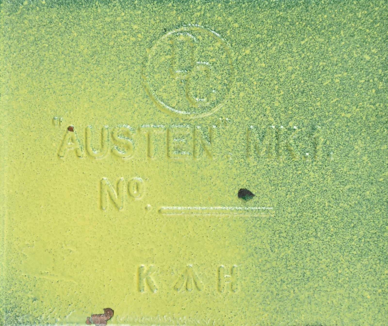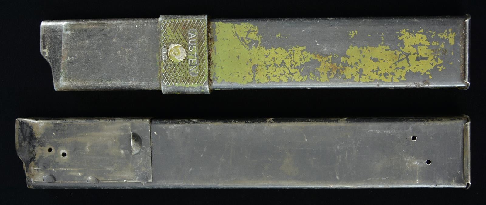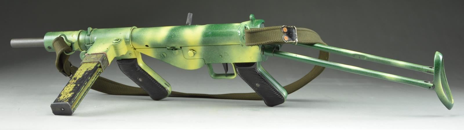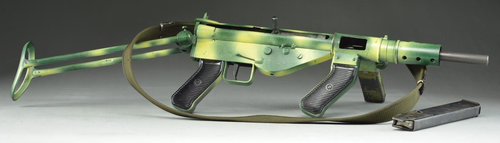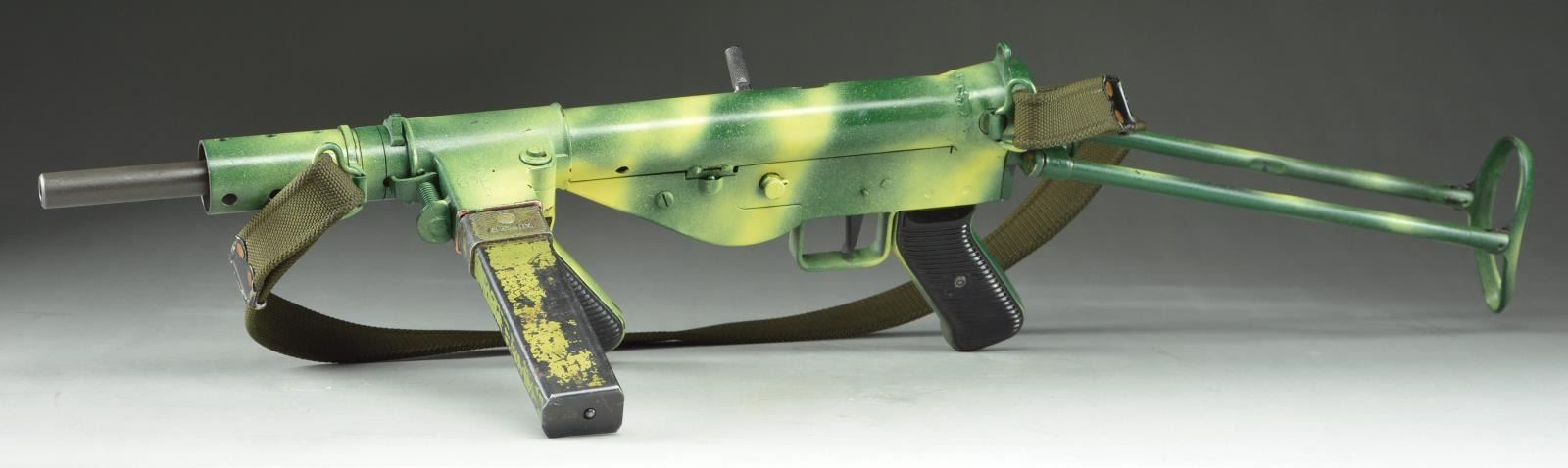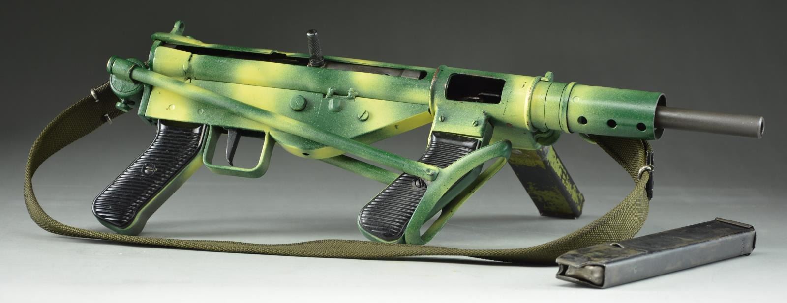 BY TAYLOR MANUFACTURING. Cal. 9mm. S# BT124. Bbl. 8". The Australian Austen SMG is a blowback operated, open bolt design that was conceived as an updated British Sten with some features they desired from the German MP40 in the 1940s. To a connoisseur of either, the distinct features will be immediately obvious. Essentially a Sten tubular receiver, barrel and feed system have been mated with deal MP40 style grips and an under folding stock. The name was derived simply from the words AUstralian STEN. Those that do surface are often painted a shade of green and this example is no exception. Finish is a yellow / green camoflauge painted pattern. It was built by Taylor Manufacturing of Decatur, GA. utilizing an original Austen parts kit, built on a transferable MKII Sten tube. The quick change barrel is secured with a threaded, 3" ventilated barrel shroud. The magazine feeds from a mag. well on the left side, presented horizontally, and utilizes standard Sten magazines as well as the original 28 rd. mags. Mag. well marked w/ DC logo (Diecasters Ltd) & "AUSTEN MK1 / No__ / K ^ H". Tube marked; "TAYLOR MFG DACETUR, GA". Sights are very similar to the Sten design with a front chevron blade and rear peep that is integral to the cap welded at the rear of the tube. Under folding stock is unlocked for folding by depressing a button on the top, rear of the tube.The shoulder portion folds to mate with front pistol grip when in closed position. Front and rear pistol grips utilize dark brown 2 piece plastic grip panels on each. Selector is a cross slide pin located forward of the trigger mechanism marked "R" for semiautomatic & "A" for fully automatic function. Right side reciprocating, knurled charging handle. Action operating spring is quite similar to the MP40, utilizing a telescoping rod with internal spring, rather than the archaic exposed spring design of a traditional Sten design. Left side mounted, green canvas sling. MAGS: 1 original 28 rd. with knurled section marked; "AUSTEN / DC" on left & "28 ROUNDS / 9MM" on right side. 1 Sten 30 rd. CONDITION: the entirety of exposed surfaces painted with a green and yellow camoflauge pattern, except the barrel. Finish demonstrates very little sign of use aside from some thinning, primarily on the cast, brass mag. well and in areas of mechanical intervention. Stock locks as intended in extended position and mates nicely to front grip when folded. Grips are in very nice condition with only a few impressions. Canvas sling looks like new. Fire control mechanism appears to function correctly when cycled by hand. NATIONAL FIREARMS ACT MG REQUIRING BATF TRANSFER BEFORE TAKING POSSESSION. FULLY TRANSFERABLE. (03-1624/JZ). MODERN CLASS III. $15,000-20,000.