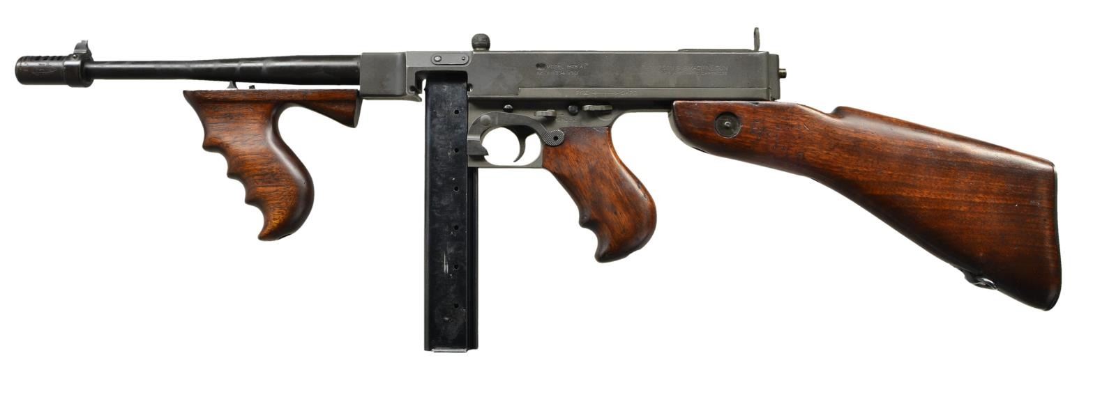 Cal. 45 ACP. S# AO134390. Bbl.10.5". Auto Ordnance Corporation manufactured Model 1928A1 Thompson with smooth replacement barrel. Barrel terminated with Auto-Ordnance marked Cutts compensator with bullet logo on left side and blade front sight. Lyman marked fixed peep sight. This is an "A.O." (Auto Ordnance) prefix serial number with matching lower assembly serial number. Vertical foregrip. Left side of receiver left factory originally marked "U.S. MODEL 1928A1" above serial number. The "U.S." has been removed, and a "C" over-stamped on the "1" so that it is now marked "MODEL 1928AC", which is typical for Thompsons that were sold by the U.S. Government to police agencies after World War II. Other left hand receiver markings include, "THOMPSON SUBMACHINE GUN / CALIBRE .45 AUTOMATIC CARTRIDGE". Right hand receiver markings include "AUTO-ORDNANCE CORPORATION" with Bridgeport address. Barrel, in front of receiver marked with an "S" on the left side, and with an "O" on the right side next to the index mark. NFA registry indicates Auto Ordnance as the manufacturer. MAGS: 1 Seymour blued 30 rd. CONDITION: matte blued finish is complete, w/ a darker finish on upper receiver and more of a gray tone on lower receiver. Some thinning on high spots and in areas of mechanical intervention. Bluing on barrel uneven. Buttplate has a smooth lustrous finish, thinning on top and at bottom. Wood furniture is matching dark brown with typical impressions, heaviest on right side of pistol grip and left side of stock. Bright bore with strong rifling. Select fire mechanism has been disabled to fire only fully automatic due to Connecticut state restrictions. Fire control mechanism appears to function correctly when cycled by hand. NATIONAL FIREARMS ACT MG REQUIRING BATF TRANSFER BEFORE TAKING POSSESSION. FULLY TRANSFERABLE. (03-1610/JZ). CURIO. $30,000-40,000.