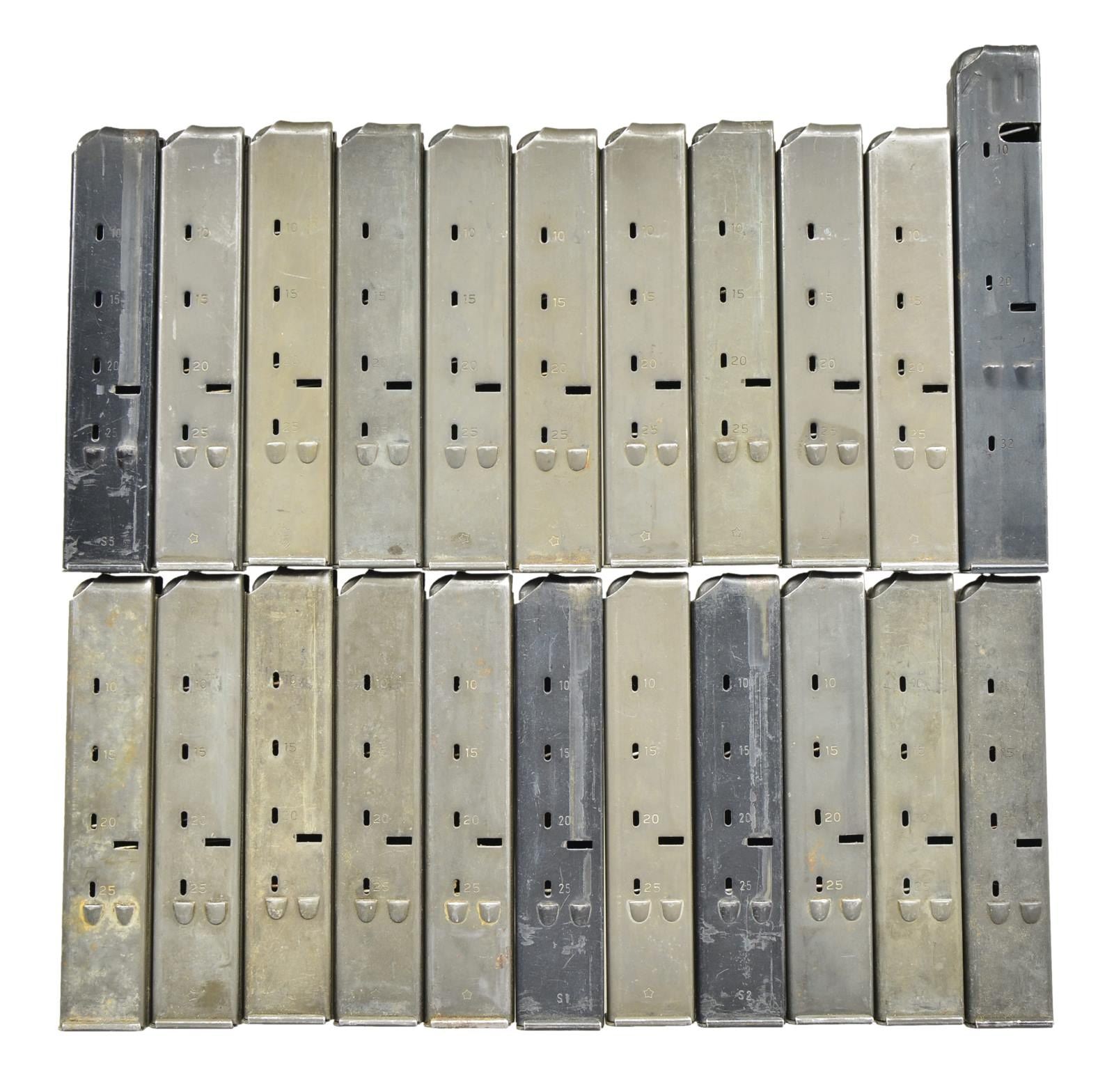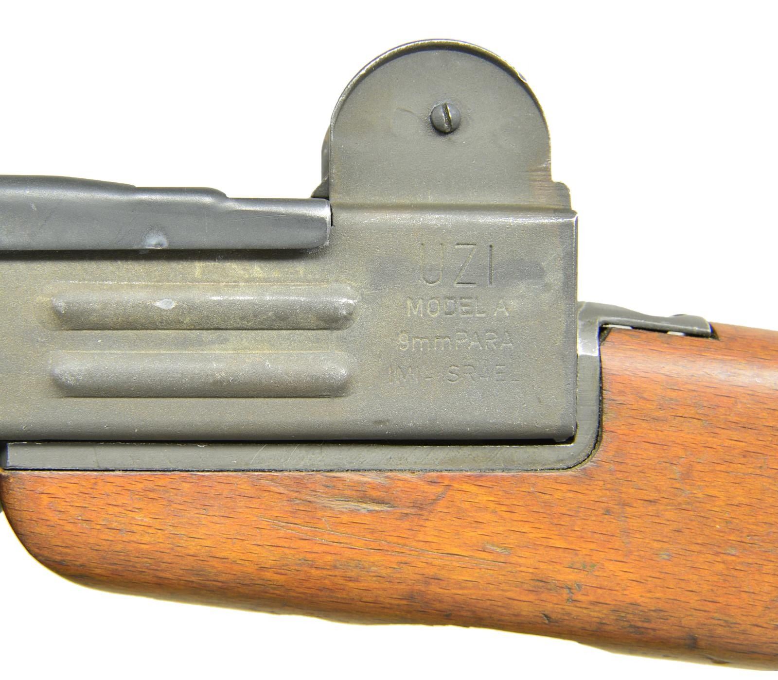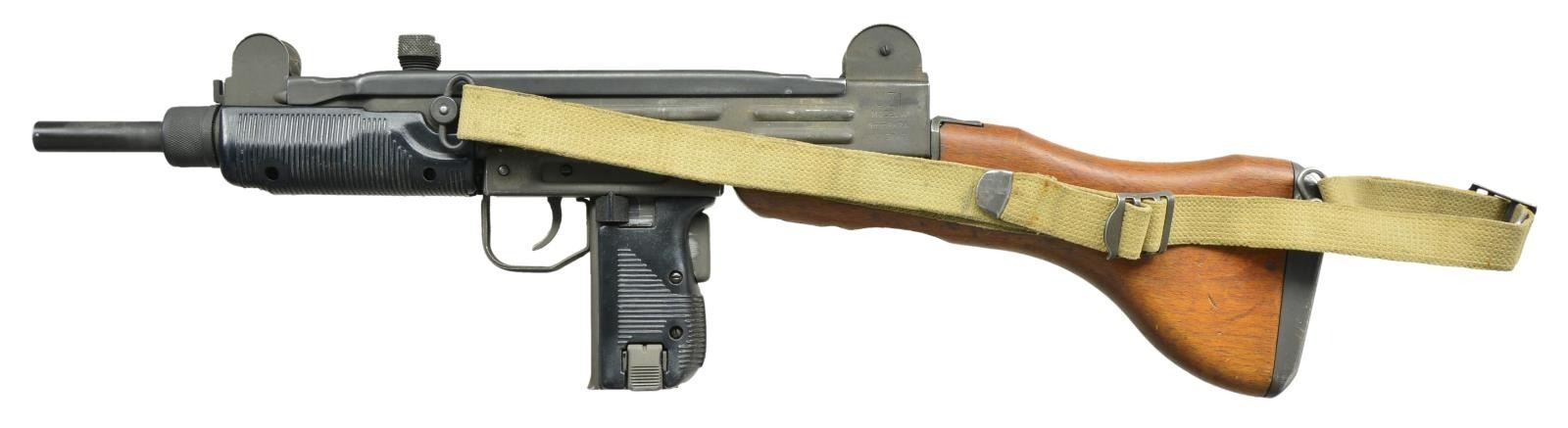 Cal. 9mm. S# SA35195. Bbl. 10.2". An IMI Model A Uzi, converted to select fire. Open bolt, blowback design. The original platform was available in several calibers, but the vast majority were offered in 9mm Parabellum. Open bolt, select fire mechanism that is light years ahead of its technology when it comes to use. The Uzi bbl. only appears to be a couple inches in length which greatly minimizes its signature for use in tight quarters, but because of the ingenious design it actually extends back inside of the bolt giving the operator over 10 inches of rifled bbl. to increase hit probability immensely. Those that are familiar w/ the 1911 family of firearms will appreciate the grip safety integrated into the mechanism. This particular example has black plastic furniture. Bottom front mounted bayonet lug. Sling swivels on left side of receiver & wooden stock, currently sporting faded tan canvas sling. Elevation adj. protected post front sight. Dual aperture rear sight. Left side markings “A-F-S” above safety/selector. Left rear receiver markings “UZI / MODEL A / 9mm PARA / IMI-ISRAEL”. Right side receiver markings include S# "SA 35195" w/ earlier markings removed & darkened. MAGS: 22 Total including 21 steel 25rd. & 1 steel 32 rd. CONDITION: all exposed metal surfaces are parkerized in what appears to be factory finish. Top cover a slighter darker shade w/o ratchet mechanism. Hardwood stock is a light stained finish with a few dings & small impressions. Ribbed, metal recoil plate. Bright bore w/ strong rifling. Fire control mechanism appears to function correctly when cycled by hand. NATIONAL FIREARMS ACT MG REQUIRING BATF TRANSFER BEFORE TAKING POSSESSION. FULLY TRANSFERABLE. (03-1603/JZ). MODERN CLASS III. $6,000-10,000.