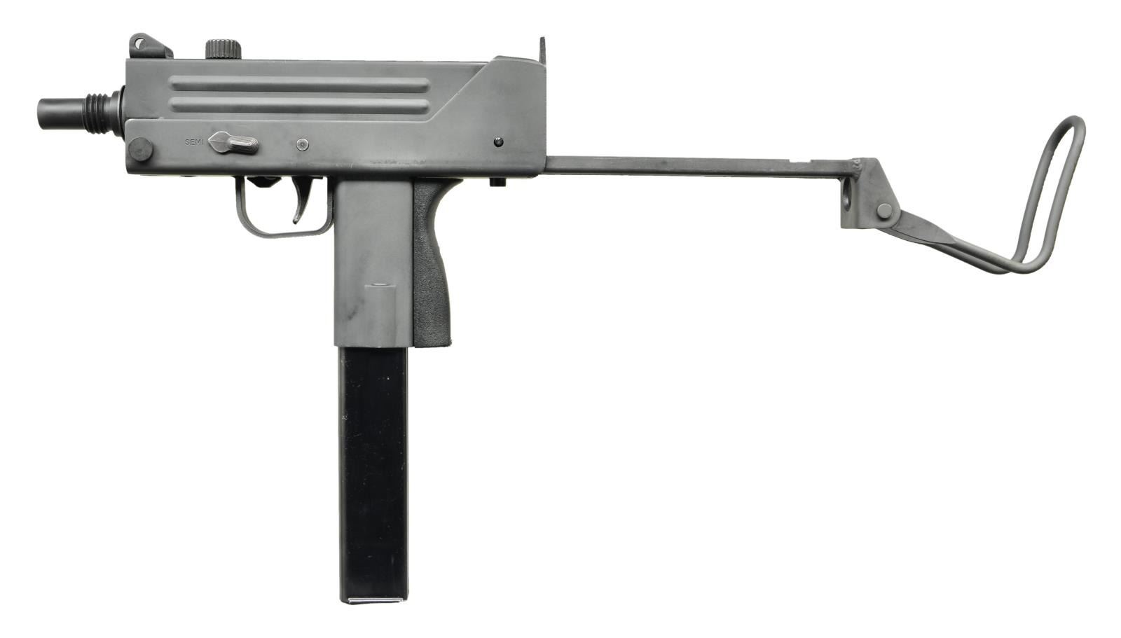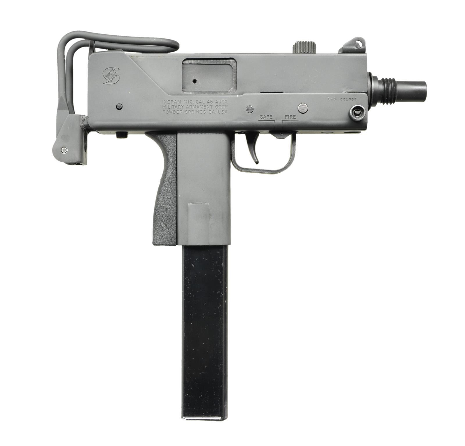 Cal. 45 ACP. S# 13001658. Bbl. 6". There are very few firearms that conjure up the imagination of the general public more than the mere mention of the MAC 10. The Ingram Model 10 was originally designed in 1964. It would become the 1st of many small simplistic SMGs to contrast the expensive & labor intensive earlier variants such as the Thompson & Reising M50. Ingram’s 2 basic guidelines while designing the Model 10 “simple & cheap” while remaining effective & reliable. Made famous mostly by Hollywood, the M10 had appearances on the silver screen & on television eventually earning the infamous title of “The Gun That Made The 80’s Roar” starting w/ John Wayne utilizing a suppressed 9mm M10 in the 1974 movie “McQ”. A favorite example used by the organized anti-gun movement, the Mac 10 was eventually, incorrectly & inaccurately synonymous w/ every crime committed for a long period of time. Here we have an Ingram variant manufactured in Powder Springs, GA. Chambered in 45 ACP. Protected post fixed front sight & rear peep sight that is integral w/ the receiver. Select fire, open bolt, blowback action. Collapsible stock that folds over the top rear of the receiver when not in use. Selector on left side of receiver. Safety inside trigger guard on right side. MAGS: 1 steel 30 rd. CONDITION: exposed metal surfaces enjoy a parkerized finish w/ complete coverage throughout. Very few handling marks consisting of very light scratches & thinning in areas of mechanical intervention. Collapsible wire stock locks tightly in both open & closed positions as does the folding shoulder section. Bore is clean w/ strong rifling. Fire control mechanism appears to function correctly when cycled by hand. NATIONAL FIREARMS ACT SMG / REQUIRING BATF TRANSFER BEFORE TAKING POSSESSION. FULLY TRANSFERABLE. (03-1613/JZ). MODERN. CLASS III. $4,500-6,500.
