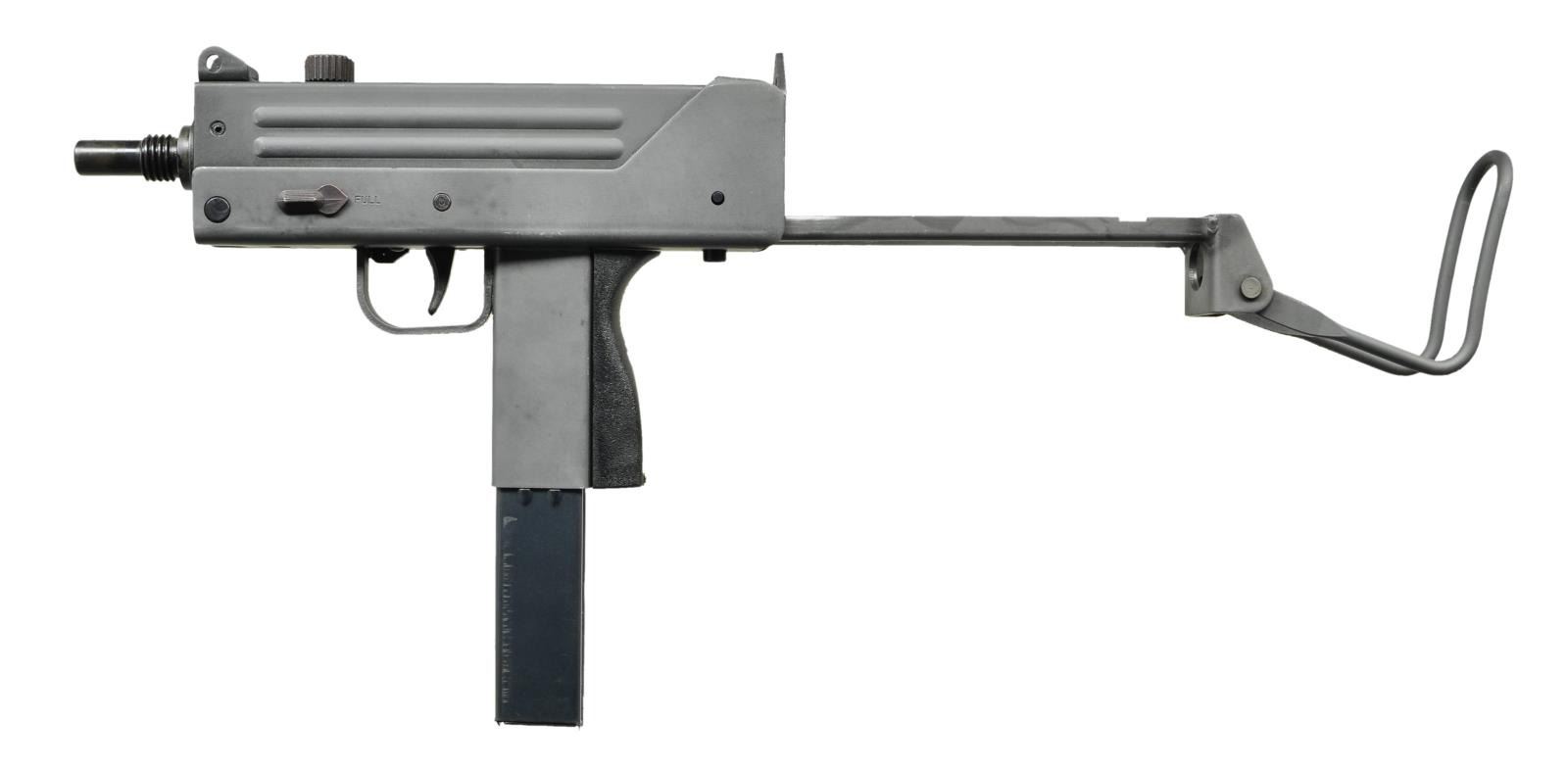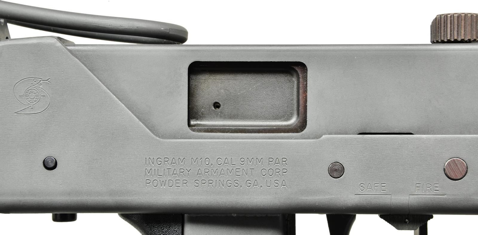 Cal. 9mm. S# 23006830. Bbl. 6". There are very few firearms that conjure up the imagination of the general public more than the mere mention of the MAC 10. The Ingram Model 10 was originally designed in 1964. It would become the 1st of many small simplistic SMGs to contrast the expensive & labor intensive earlier variants such as the Thompson & Reising M50. Ingram’s 2 basic guidelines while designing the Model 10 “simple & cheap” while remaining effective & reliable. Made famous mostly by Hollywood, the M10 had appearances on the silver screen & on television eventually earning the infamous title of “The Gun That Made The 80’s Roar” starting w/ John Wayne utilizing a suppressed 9mm M10 in the 1974 movie “McQ”. A favorite example used by the organized anti-gun movement, the Mac 10 was eventually, incorrectly & inaccurately synonymous w/ every crime committed for a long period of time. Here we have an Ingram variant manufactured in Powder Springs, GA. Chambered in 9mm. Protected post fixed front sight & rear peep sight that is integral w/ the receiver. Select fire, open bolt, blowback action. Collapsible stock that folds over the top rear of the receiver when not in use. Selector on left side of receiver. Safety inside trigger guard on right side. MAGS: 1 steel 36 rd. CONDITION: exposed metal surfaces enjoy a parkerized finish w/ complete coverage throughout. Very few handling marks consisting of very light scratches & thinning in areas of mechanical intervention. Collapsible wire stock locks tightly in both open & closed positions as does the folding shoulder section. Bore is clean w/ strong rifling. Fire control mechanism appears to function correctly when cycled by hand. NATIONAL FIREARMS ACT SMG / REQUIRING BATF TRANSFER BEFORE TAKING POSSESSION. FULLY TRANSFERABLE. (03-1614/JZ). MODERN. CLASS III. $4,500-6,500.