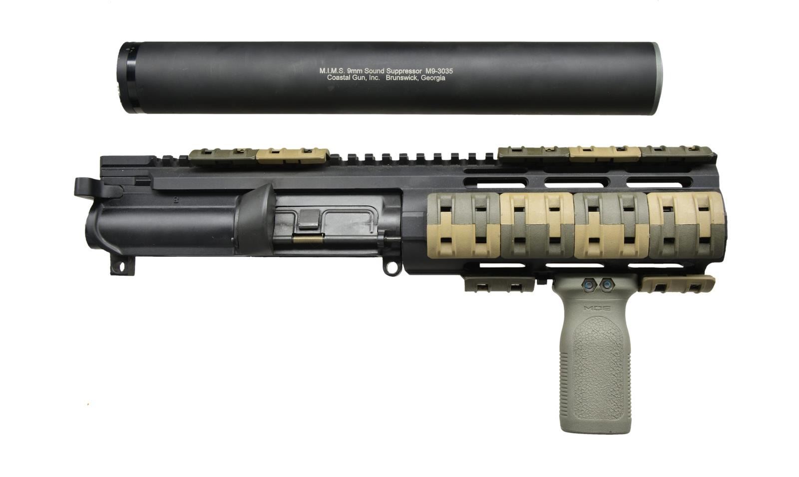 GUN M.I.M.S. SUPPRESSOR. Cal. 9mm. S# M93035. Bbl. 4". Integrally suppressed, complete upper receiver set up for 9mm Parabellum. Includes bolt & charging handle. Short (9mm) dust cover & brass deflector. POF-USA P-4X rail system providing 14" of solid rail on top w/ accessory rails at 3, 6 & 9 O'Clock. Short, 4" barrel & 12.5" M.I.M.S. suppressor inside POF Quad Rail in a similar configuration to a typical "SD". Suppressor OD is 1.75". Current thread and pitch 5/8x24. Rails partially covered w/ green / tan covers, sporting MAGPUL MOE vertical foregrip. CONDITION: exterior finish is complete & consistent. Bright bore w/ strong rifling. NATIONAL FIREARMS ACT SUPPRESSOR REQUIRING BATF TRANSFER BEFORE TAKING POSSESSION. FULLY TRANSFERABLE. (03-1600/JZ). MODERN, CLASS III. $800-1,200.