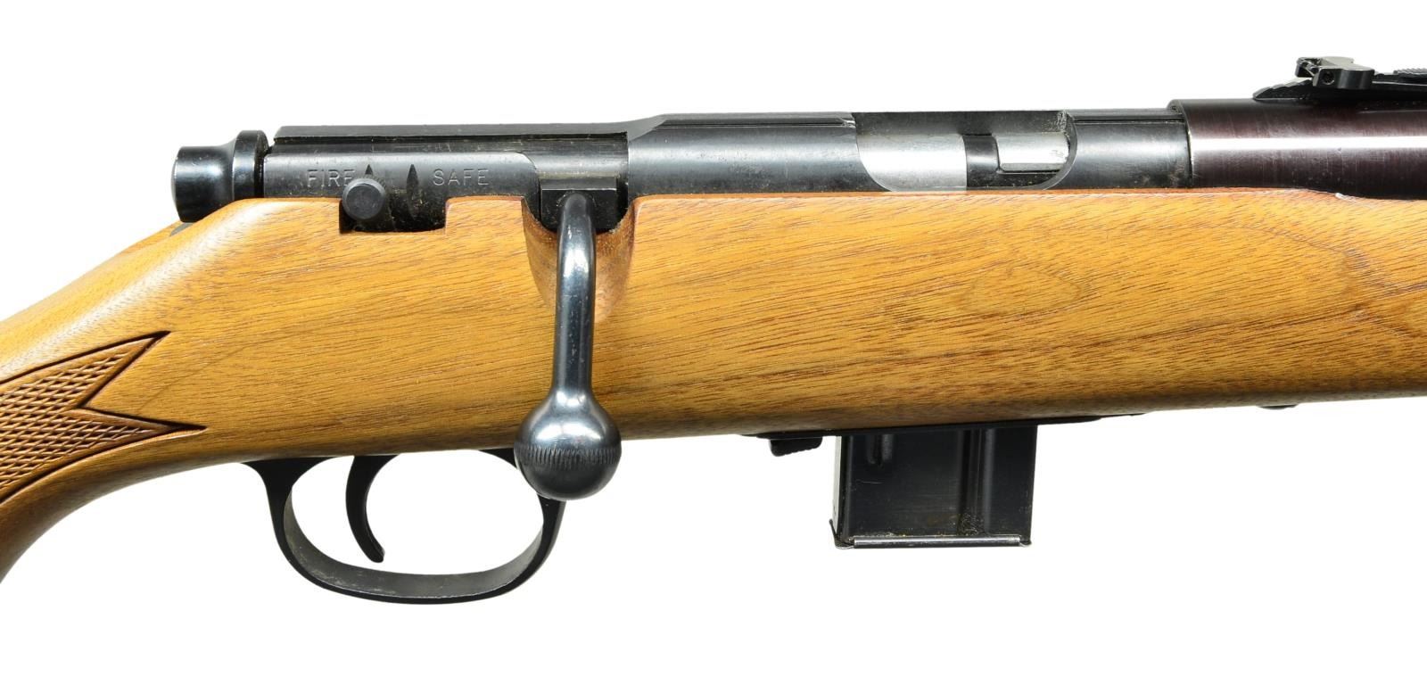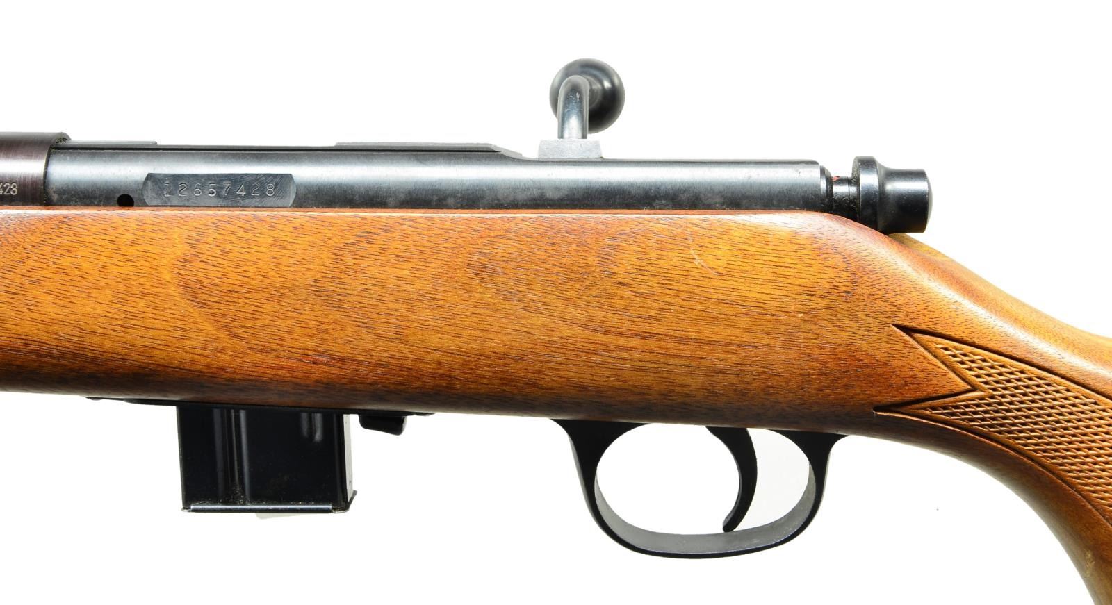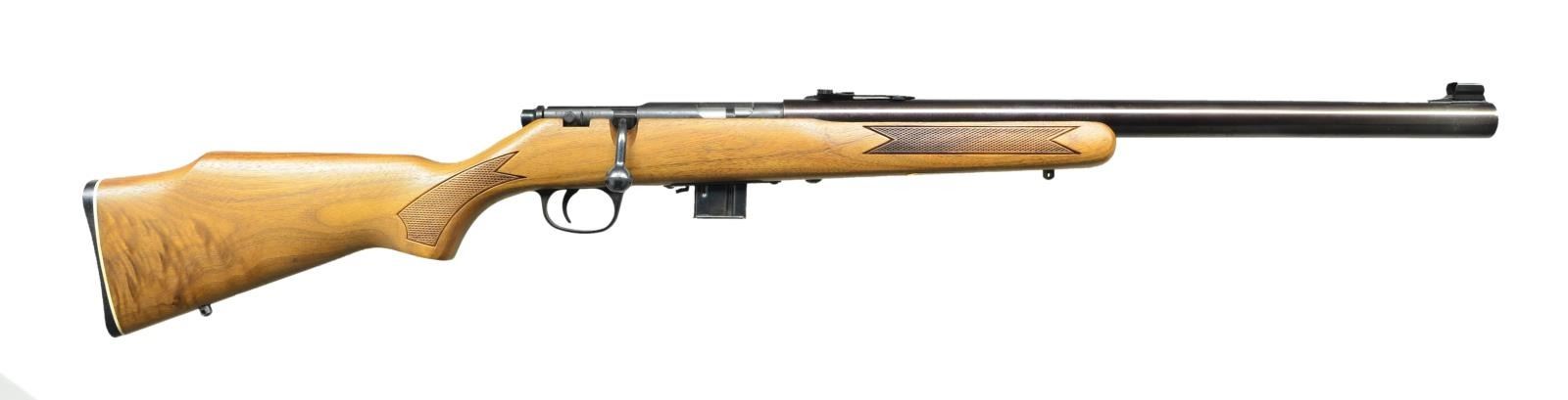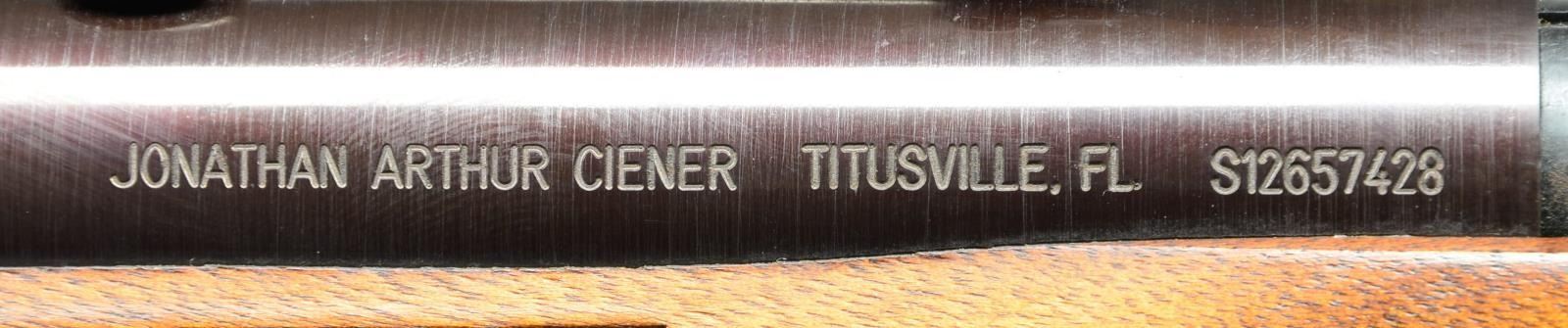 Cal. 22 LR. S# S12657428 (Silencer) S# 12657428 (Rifle). Bbl. 21". Marlin model 782, mag. fed, bolt action rifle w/ Ciener integrally suppressed barrel. These integrally suppressed rifles by Ciener have a long reputation of retaining their accuracy while being "spooky" quiet. Blued finish on exposed metal surfaces, w/ barrel a slight hue of cranberry. Receiver is factory matte finished. Checkered hardwood forend & stock. Hooded front sight blade w/ elevation adjustable rear sight. Sling swivels front & rear. CONDITION: finish is complete & consistent w/ a little thinning & light scratching on barrel. Stock looks very nice, slightly lighter on right side, than the left. Retains strong checkering w/ only a few light impressions in the lower grip area. Still retains factory Marlin sticker below forend. Bright bore w/ strong rifling. NATIONAL FIREARMS ACT SUPPRESSOR REQUIRING BATF TRANSFER BEFORE TAKING POSSESSION. FULLY TRANSFERABLE. (03-1617 / 23-980/JZ). MODERN CLASS III. $800-1,200.