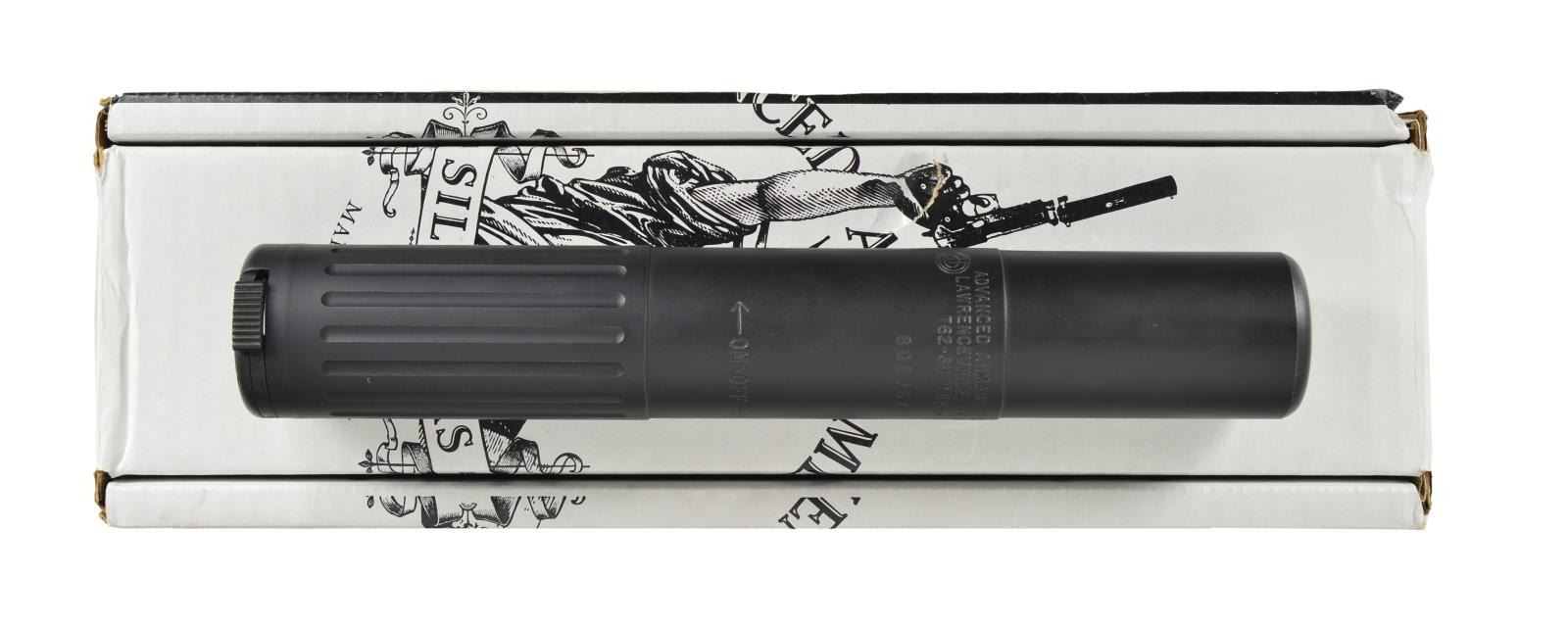 Cal. 7.62mm. S# B03757. Rifle suppressor manufactured by Advanced Armament w/ QD interface. 9" Overall length w/ 1.5" OD. Weight 21 Ounces. Matte black finish. UNATTACHED ACCESSORIES: factory box, paperwork & black nylon holster. CONDITION: all aspects indicate that any prior use, if any, was minimal. Finish is complete & consistent w/ no noticeable blemishing. Internals illustrate very little use. QD attachment for rifle not included. NATIONAL FIREARMS ACT SUPPRESSOR REQUIRING BATF TRANSFER BEFORE TAKING POSSESSION. FULLY TRANSFERABLE. (03-1593/JZ). MODERN CLASS III. $200-400.