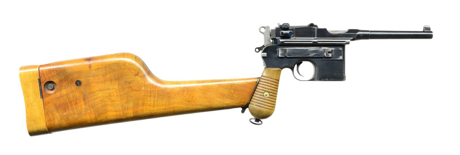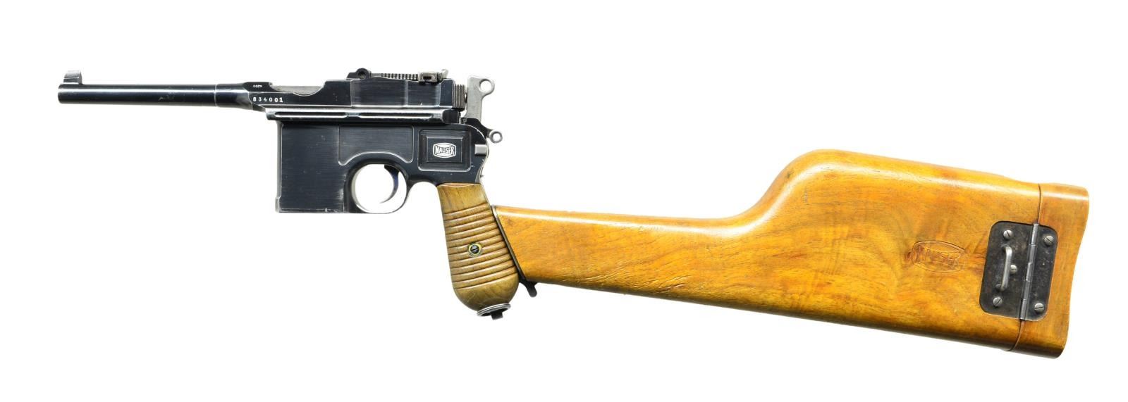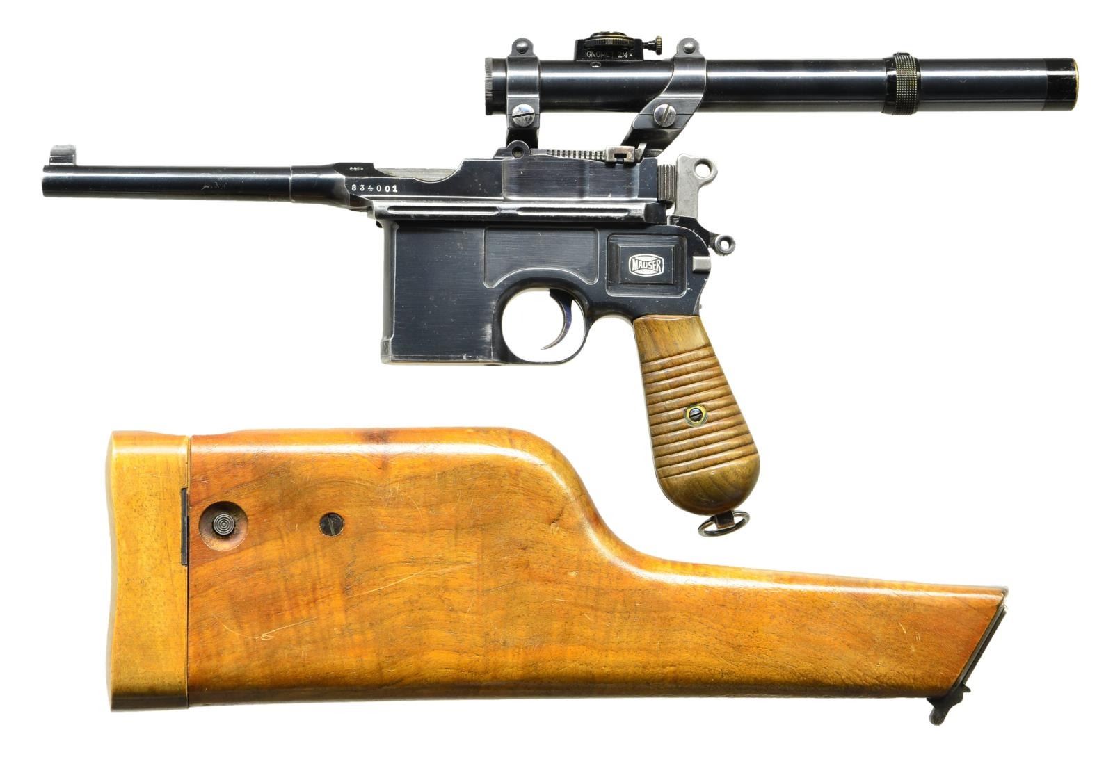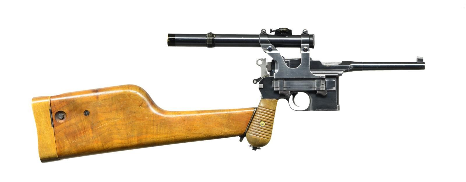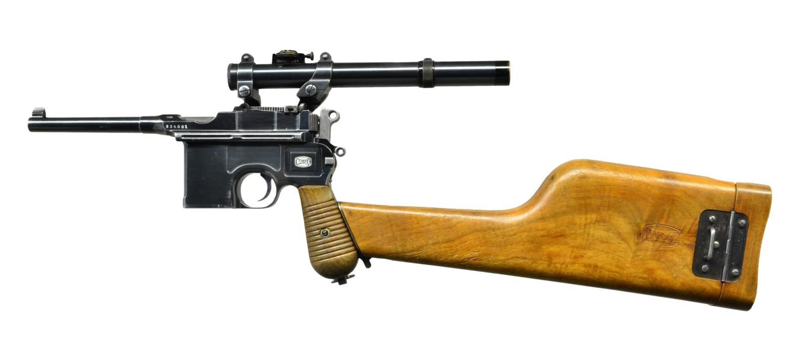 SCOPE & STOCK. Cal. 7.63mm. S# 834001. Seldom does one come across a truly unique special order firearm. This incredible ensemble was reportedly made in 1931 and based on a 1930 Commercial pistol. The frame was dimensionally changed, thickened in the upper portion of the right side to provide a flat surface for a scope base upon which could be mounted an OIGEE scope. The scoped pistol, attached to a standard 1930 Commercial stock, presenting an extraordinarily ensemble that may have been used as a basis for the Hollywood Han Solo blaster. This exact ensemble was sold at a major auction house in the U.S., many years ago, for over $50,000, and was profiled in great detail in the German language C96 book "GESCHICHTE & MODELLE 1923-1945, Vol 4" on pages 135-137". The project started using a standard M1930 Commercial having a 5.5" bbl. w/ fixed front sight & slip-in rear sight graduated 50-1000. Short extractor, 2-lug firing pin, universal safety & sm. ring hammer. Usual Mauser address on top of chamber, Crown/"C"/"U" proof on left chamber flat. Full S# on left side of bbl. extension, disassembly showing a matching frame & an unnumbered locking block & floorplate. The special order work was largely directed to the right side of the frame where the upper portion was machined flat. A scope base was attached using 2 lg. diameter pins, then welded in place, its surface having 2 channels for the cammed levers of the mount. The mount slipped over the base & was secured by turning the levers, just as used to attach a Luger stock to its corresponding lug. Sturdy rings were used to secure an OIGEE scope, the manufacturer active from 1910-1960, marked "OIGEE/BERLIN" in 2 locations, with a magnification of 2.5x & marked "6134” under adjustment knobs. "5588" marked on top of scope, arguably representing the model. Presenting reticle is a central pointed post bracketed by 2 equally thick horizontal bars. The attaching stock is from a standard production 1930 Commercial, this one having an unmarked lug w/ squared shoulders. UNATTACHED ACCESSORIES: scope w/ attached mount & 1930 Commercial shoulder stock. CONDITION: near excellent original salt blue as applied by Mauser to their 1930 Commercial pistols w/ a tempering line just behind the chamber & another at the upper rear of the frame. Sharp edge & handling wear as one might expect from a pistol that has seen light use w/ no evidence of touch up. Bright bore w/sharp rifling. Perfect manual mechanics. Scope & mount, each w/ original finish, are in the same condition w/ scope having bright, crisp optics. Excellent shoulder stock w/a light scattering of handling dings, comparable condition hinge, lug w/ fading over its upper arm. An absolutely stunning special order ensemble. Yes, you could own the Hollywood blaster, but wouldn't you rather have the real thing? (22-3153/LMA). CURIO. $35,000-65,000.