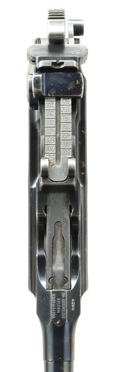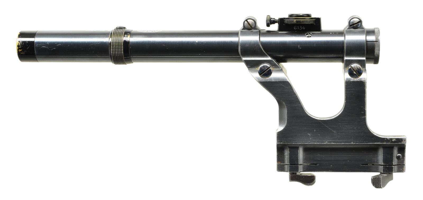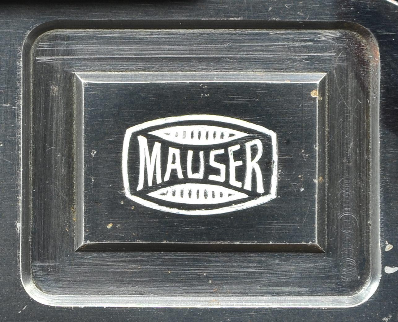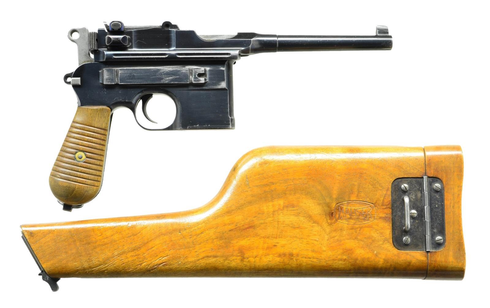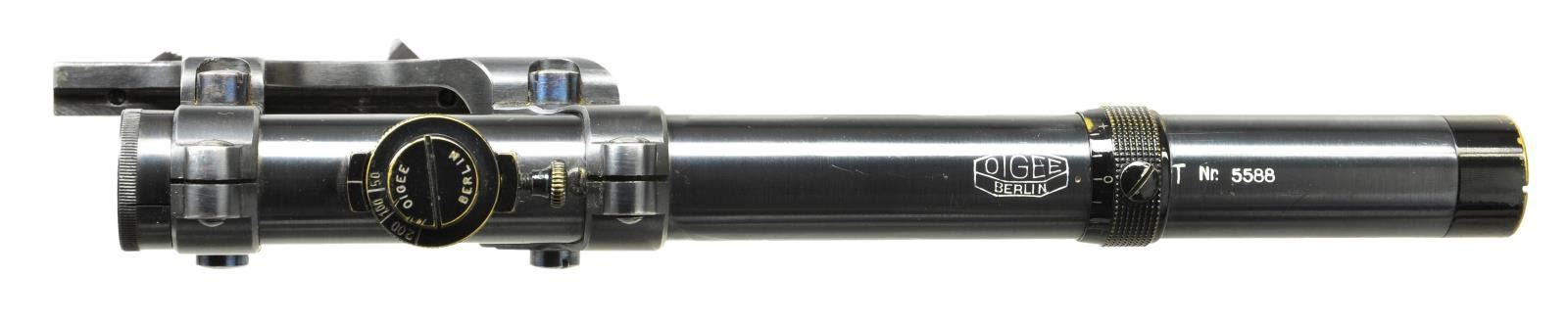SCOPE & STOCK. Cal. 7.63mm. S# 834001. Seldom does one come across a truly unique special order firearm. This incredible ensemble was reportedly made in 1931 and based on a 1930 Commercial pistol. The frame was dimensionally changed, thickened in the upper portion of the right side to provide a flat surface for a scope base upon which could be mounted an OIGEE scope. The scoped pistol, attached to a standard 1930 Commercial stock, presenting an extraordinarily ensemble that may have been used as a basis for the Hollywood Han Solo blaster. This exact ensemble was sold at a major auction house in the U.S., many years ago, for over $50,000, and was profiled in great detail in the German language C96 book "GESCHICHTE & MODELLE 1923-1945, Vol 4" on pages 135-137". The project started using a standard M1930 Commercial having a 5.5" bbl. w/ fixed front sight & slip-in rear sight graduated 50-1000. Short extractor, 2-lug firing pin, universal safety & sm. ring hammer. Usual Mauser address on top of chamber, Crown/"C"/"U" proof on left chamber flat. Full S# on left side of bbl. extension, disassembly showing a matching frame & an unnumbered locking block & floorplate. The special order work was largely directed to the right side of the frame where the upper portion was machined flat. A scope base was attached using 2 lg. diameter pins, then welded in place, its surface having 2 channels for the cammed levers of the mount. The mount slipped over the base & was secured by turning the levers, just as used to attach a Luger stock to its corresponding lug. Sturdy rings were used to secure an OIGEE scope, the manufacturer active from 1910-1960, marked "OIGEE/BERLIN" in 2 locations, with a magnification of 2.5x & marked "6134” under adjustment knobs. "5588" marked on top of scope, arguably representing the model. Presenting reticle is a central pointed post bracketed by 2 equally thick horizontal bars. The attaching stock is from a standard production 1930 Commercial, this one having an unmarked lug w/ squared shoulders. UNATTACHED ACCESSORIES: scope w/ attached mount & 1930 Commercial shoulder stock. CONDITION: near excellent original salt blue as applied by Mauser to their 1930 Commercial pistols w/ a tempering line just behind the chamber & another at the upper rear of the frame. Sharp edge & handling wear as one might expect from a pistol that has seen light use w/ no evidence of touch up. Bright bore w/sharp rifling. Perfect manual mechanics. Scope & mount, each w/ original finish, are in the same condition w/ scope having bright, crisp optics. Excellent shoulder stock w/a light scattering of handling dings, comparable condition hinge, lug w/ fading over its upper arm. An absolutely stunning special order ensemble. Yes, you could own the Hollywood blaster, but wouldn't you rather have the real thing? (22-3153/LMA). CURIO. $35,000-65,000.
