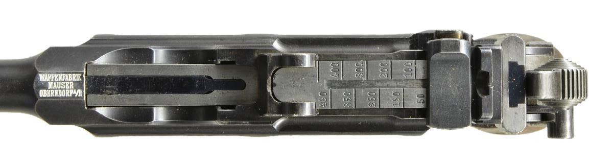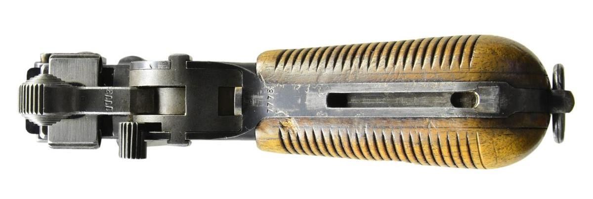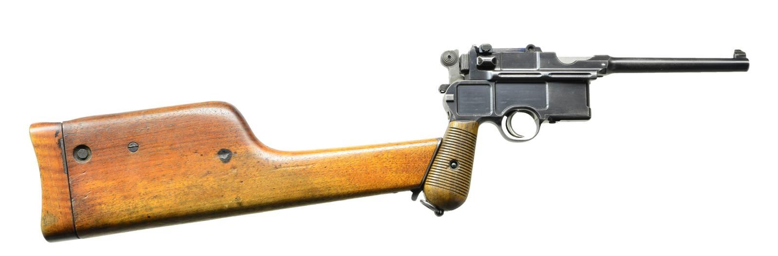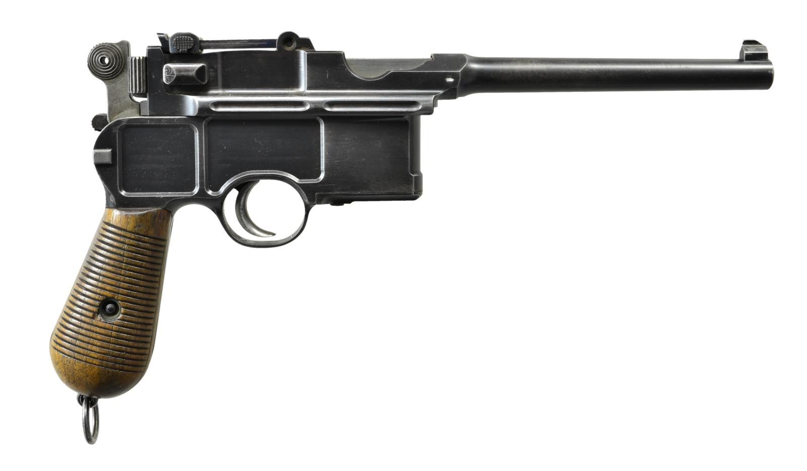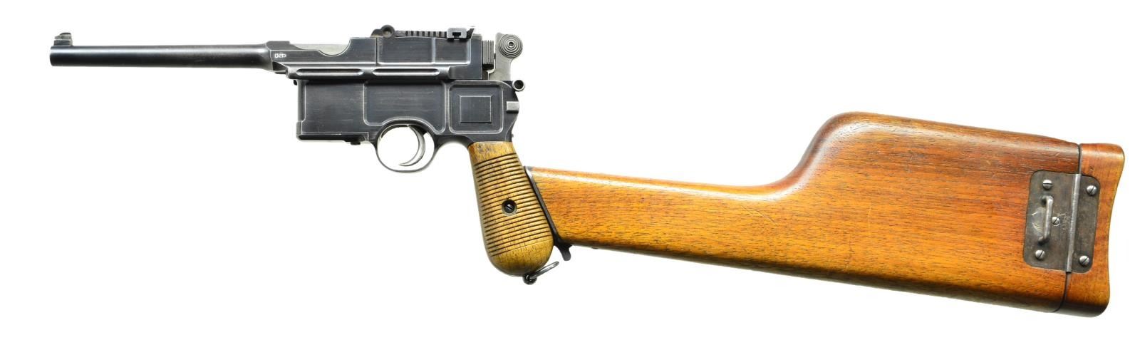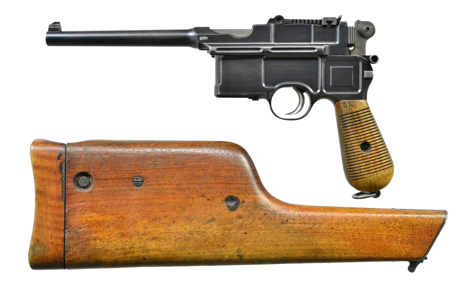 SEMI AUTO PISTOL WITH MATCHING STOCK. Cal. 7.63mm. S# 7778. Bbl. 5.5". Super scarce Mauser Conehammer 6-shot w/ 5.5" bbl. having fixed front sight, relieved to present bead profile, & slip-in 50-500 rear sight. Long extractor and early firing pin w/ matching retainer. Top of chamber w/ usual 3-line address, Crown /"C"/"U" on left side of bbl. extension; antler proof on right side. Major components rust blued w/ usual fire blued sm. parts. The bolt, hammer & trigger assembly in the white. Lanyard ring present. Disassembly shows all factory matching parts except grips, each panel numbered "13109". Complete w/ correct factory matching shoulder stock. UNATTACHED ACCESSORIES: matching shoulder stock. CONDITION: approx. 95% original blue w/ wear in expected locations, most pronounced at front of mag. well. Comparable condition fire blue that shows no suggestion of enhancement. Generally bright bore w/ oxidative etching in the grooves. Perfect manual mechanics. Stock is vg-exc. w/ usual discoloration & handling dings. Upper arm of lug was cleaned a long time ago, now faded to a mellow gray, the balance of the lug & hinge consistent w/ the overall appearance of this exceptional & unusually scarce Conehammer. (01-21636/LMA). ANTIQUE. $9,500-14,500.