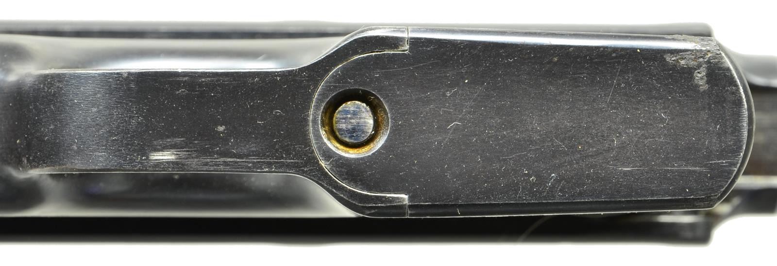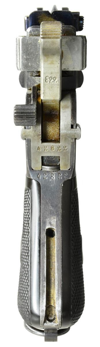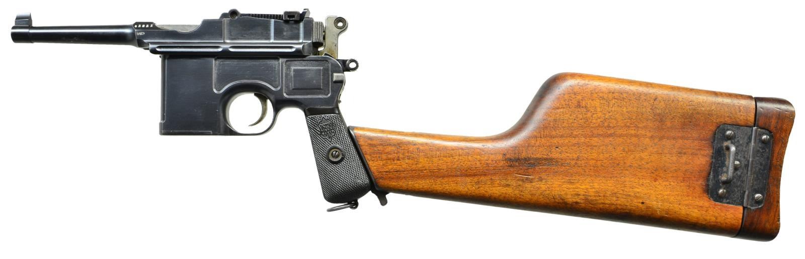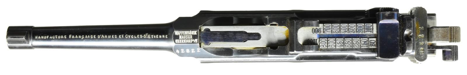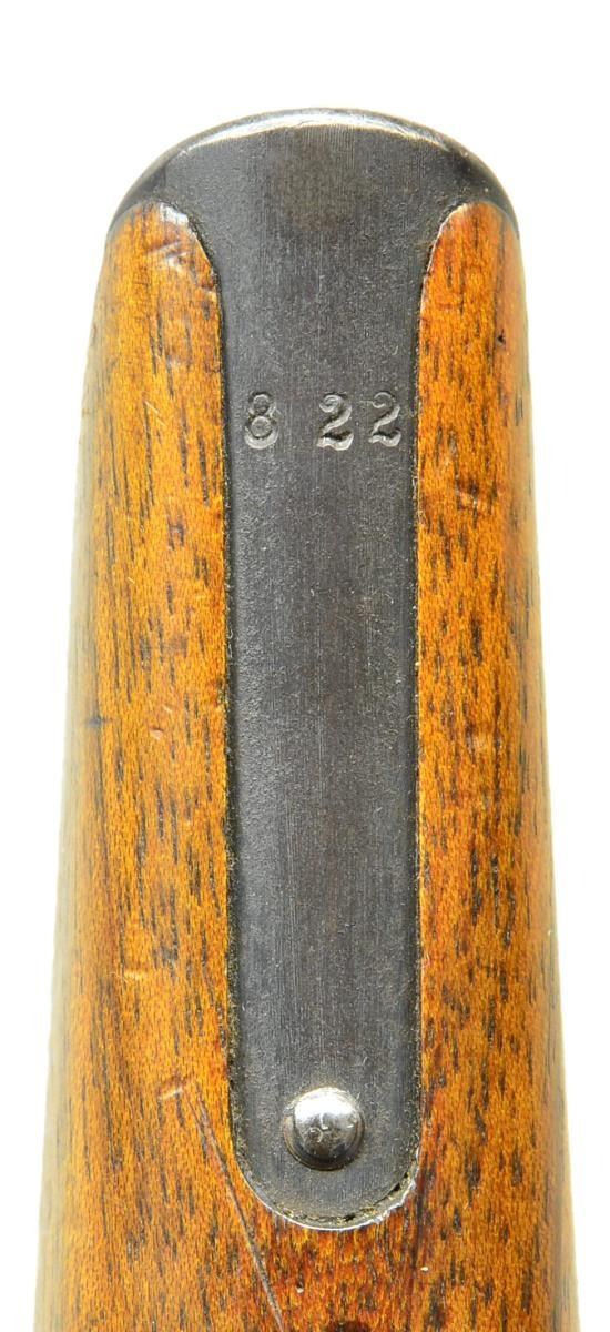 BOLO STOCK, FRENCH RETAILER MARKED. Cal. 7.63mm. S# 42822. Beautiful Prewar Small Ring Bolo w/matching Bolo stock, this example having been marked by one of the most notable retailers. 4" bbl. having fixed front sight & slip-in rear sight graduated 50-1000. Short extractor, 2 lug firing pin, Prewar Commercial type safety & hammer. Top of chamber w/ usual Mauser address. Full S# on left chamber flat. Left side of bbl. extension marked with Crown/"C"/"U". 2 Line Mauser address on right side of frame. Full S# on the back of frame & repeated either in full or the last few digits on all the usual parts & scribed "822" on each of the grips. Top of bbl. marked "MANUFACTURE FRANCAISE D'ARMES ET CYCLES-ST-ETIENNE". UNATTACHED ACCESSORIES: Accompanied by matching Bolo shoulder stock, the lug marked "822". CONDITION: 99% bright original rust blue, sm. spot of corrosion at the right forward corner of the floorplate. Very slight thinning of the front strap. Corresponding fire blue & straw on all appropriate parts. Crisp original hard rubber grips / no cracks, splits or losses. Generally bright bore w/ moderate etching. VG-Excellent Bolo stock, no cracks, w/ moderate oxidative discoloration of the hinge & lug. A wonderful Prewar sm. ring Bolo w/the desirable hard rubber grips, French retailer marking & matching Bolo stock, an ensemble that would be very difficult to improve upon! (22-3150/LMA). CURIO. $6,500-9,500.