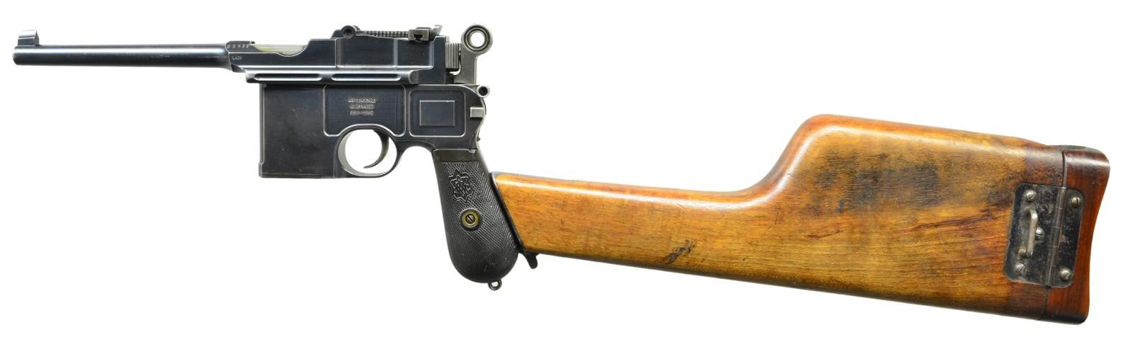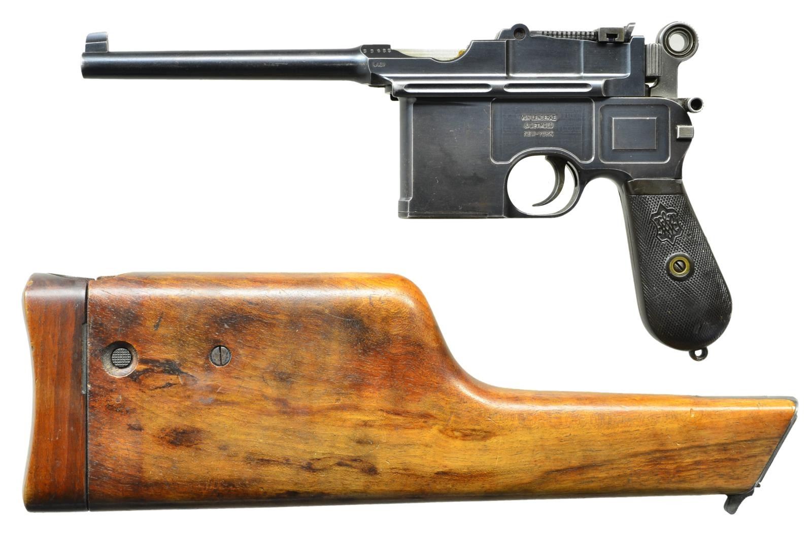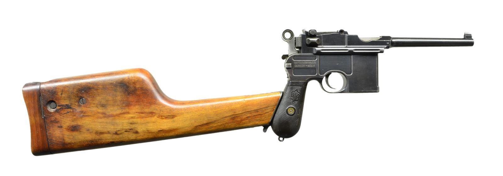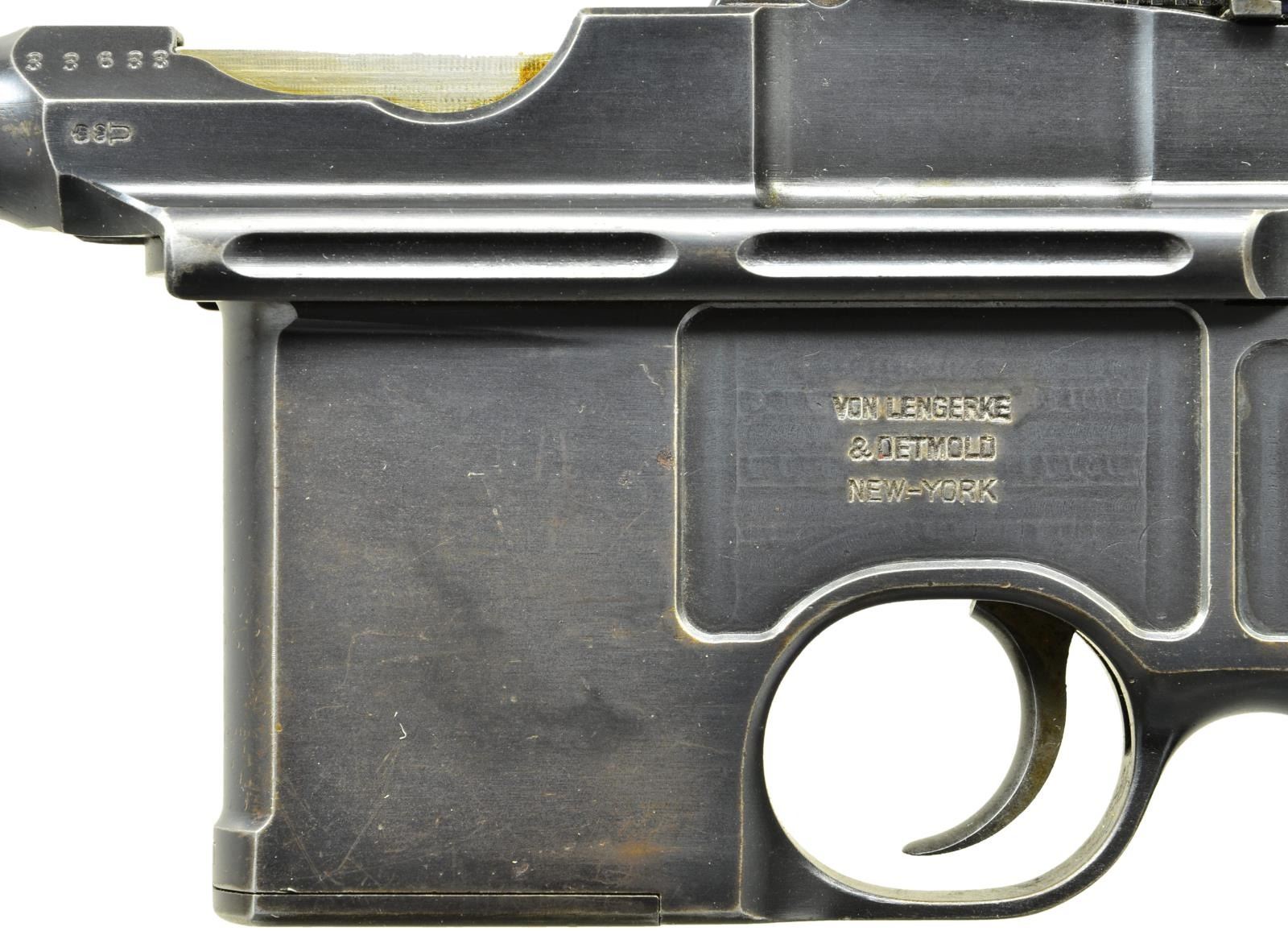 STOCK. Cal. 7.63mm. S# 33633. Mauser made relatively few Shallow Milled lg. ring hammer pistols, generally found in the 31xxx-33xxx S# range, this example falling in the latter part of that series. It has a 5.5" bbl. w/ fixed front sight & slip-in rear sight graduated 50-1000. Long extractor, single lug firing pin & early safety. Usual Mauser address on chamber. Full S# on left chamber flat. Left side of bbl. extension marked Crown/"C"/"U"; antler proof on right side. The center panel on the left side of the frame is VL&D import marked. The Mauser 2-line address is on the right side of the frame. Fitted w/ hard rubber grips, each panel molded w/intertwined "M/W" in the upper portion surrounded by a checkered field. Lanyard ring absent. Disassembly shows full S# or last few digits on all the usual parts including firing pin & locking block. Grips are unnumbered, though the right panel is inscribed w/ date "3/13/11". UNATTACHED ACCESSORIES: accompanied by a closely numbered shoulder stock numbered "33684". Lid correctly notched for lg. ring hammer and internally inked "E. Darling" CONDITION: approx 95-97% bright original rust blue w/ sharp edge wear in the usual locations, particularly in front of mag. well & discoloration of the front strap. Fire blued parts w/ commensurate fading, especially the extractor that now appears as an in-the-white part. Back of the bolt & entire hammer have been lightly polished. Grips w/ moderate blunting & handling marks, especially the lower portion of the right panel where the checkering has smoothed to be indiscernible. Mirror bright bore. Perfect manual mechanics. Near excellent shoulder stock w/ only minor handling marks. Hinge and lug w/ some fading but no suggestion of enhancement. A desirable C96 made in a narrow S# range, this example w/ hard rubber grips & a closely numbered, near excellent, stock. (22-3097/LMA). CURIO. $4,000-6,000.